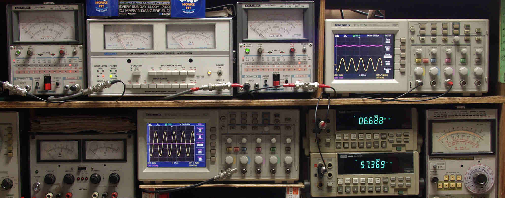 上段中左 歪み率計=出力の歪み率測定 左メータ=L出力、右メータ=R出力。