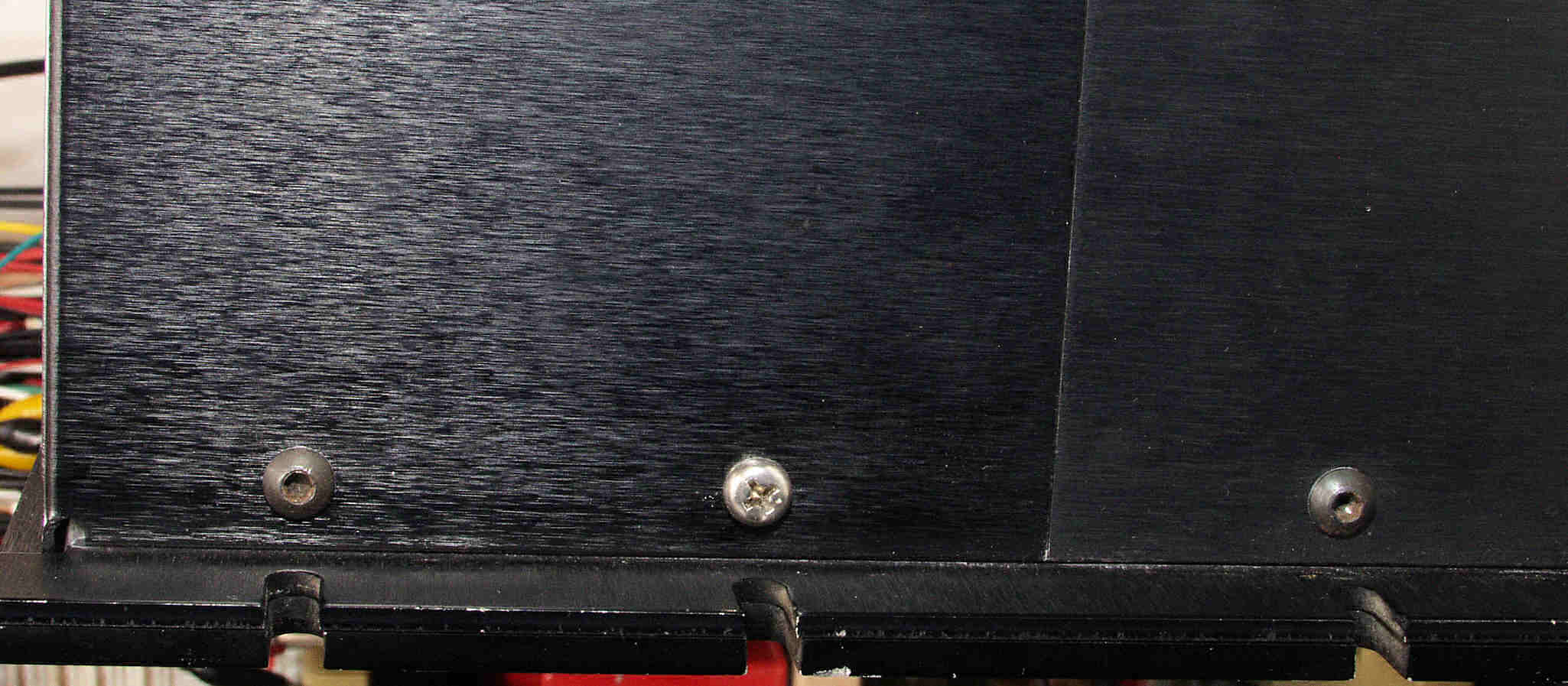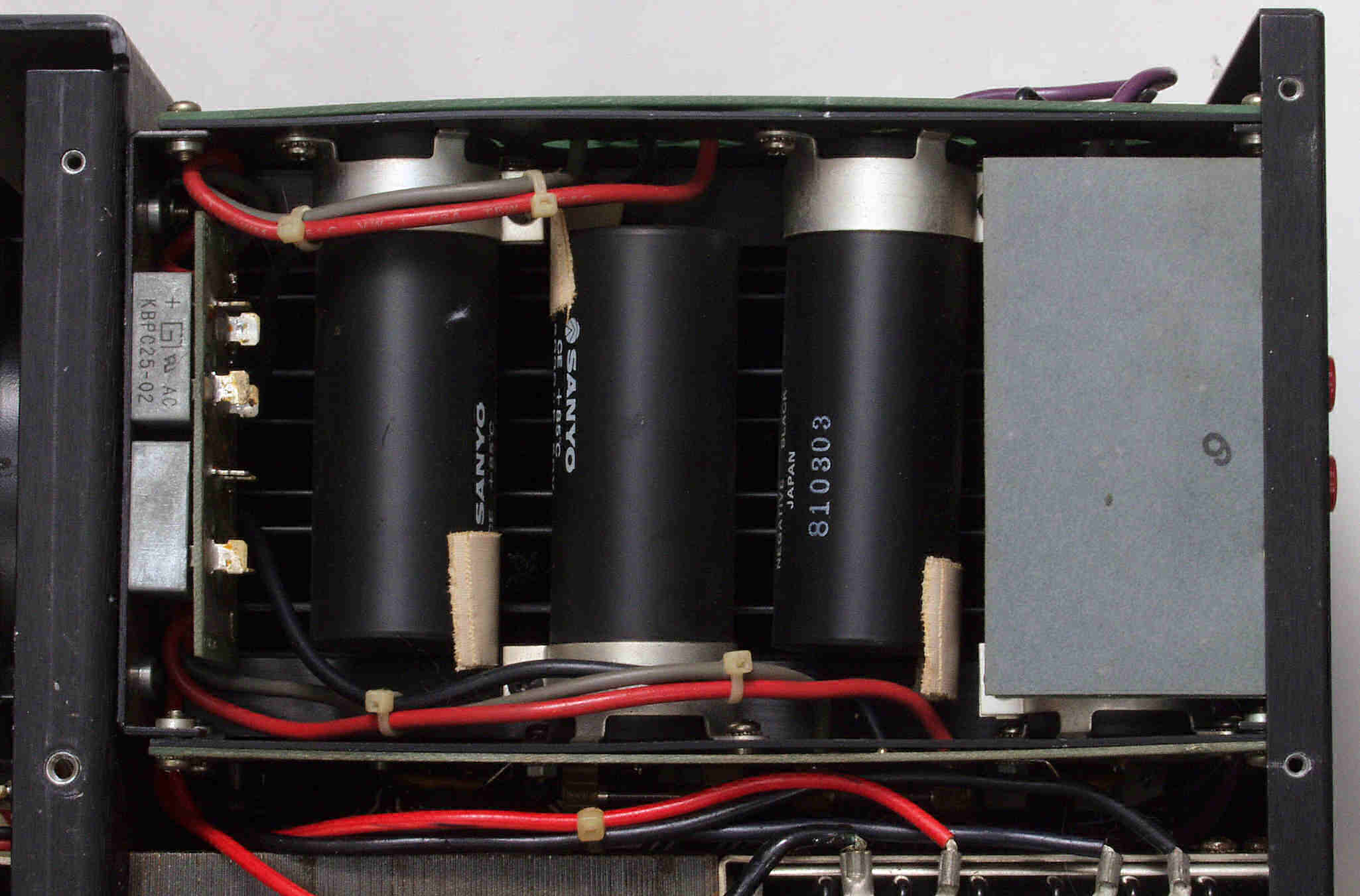 A22. 点検中 前・上・下パネルを取り、上から見る。 電解コンデンサーのみ、交換してある。