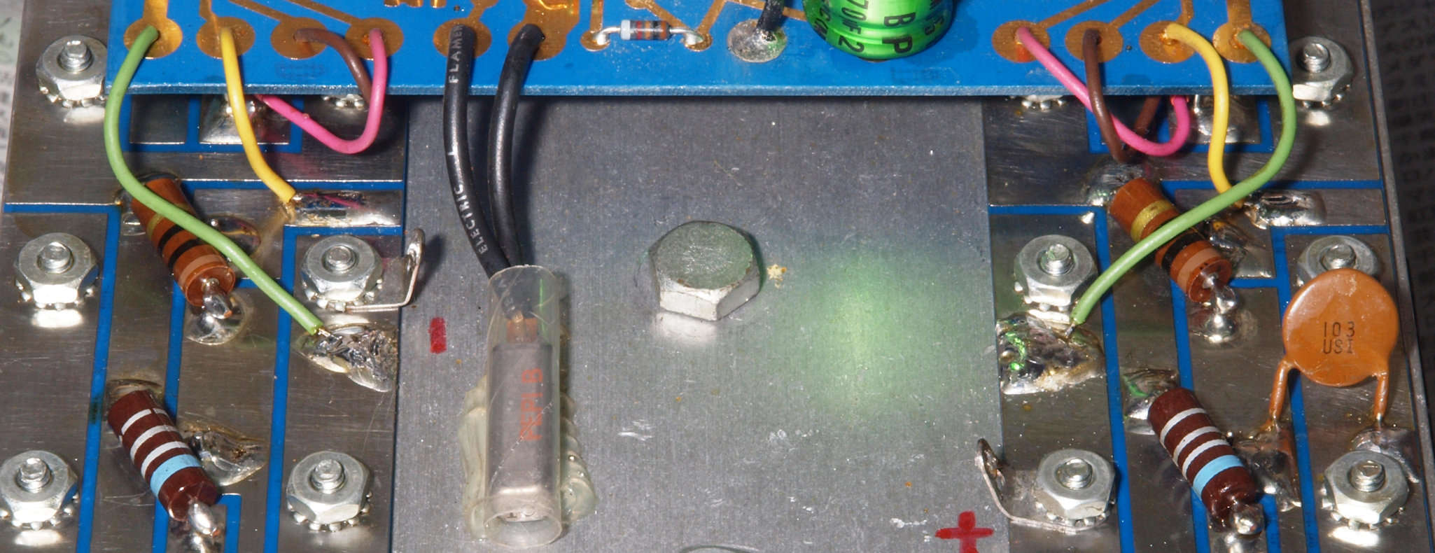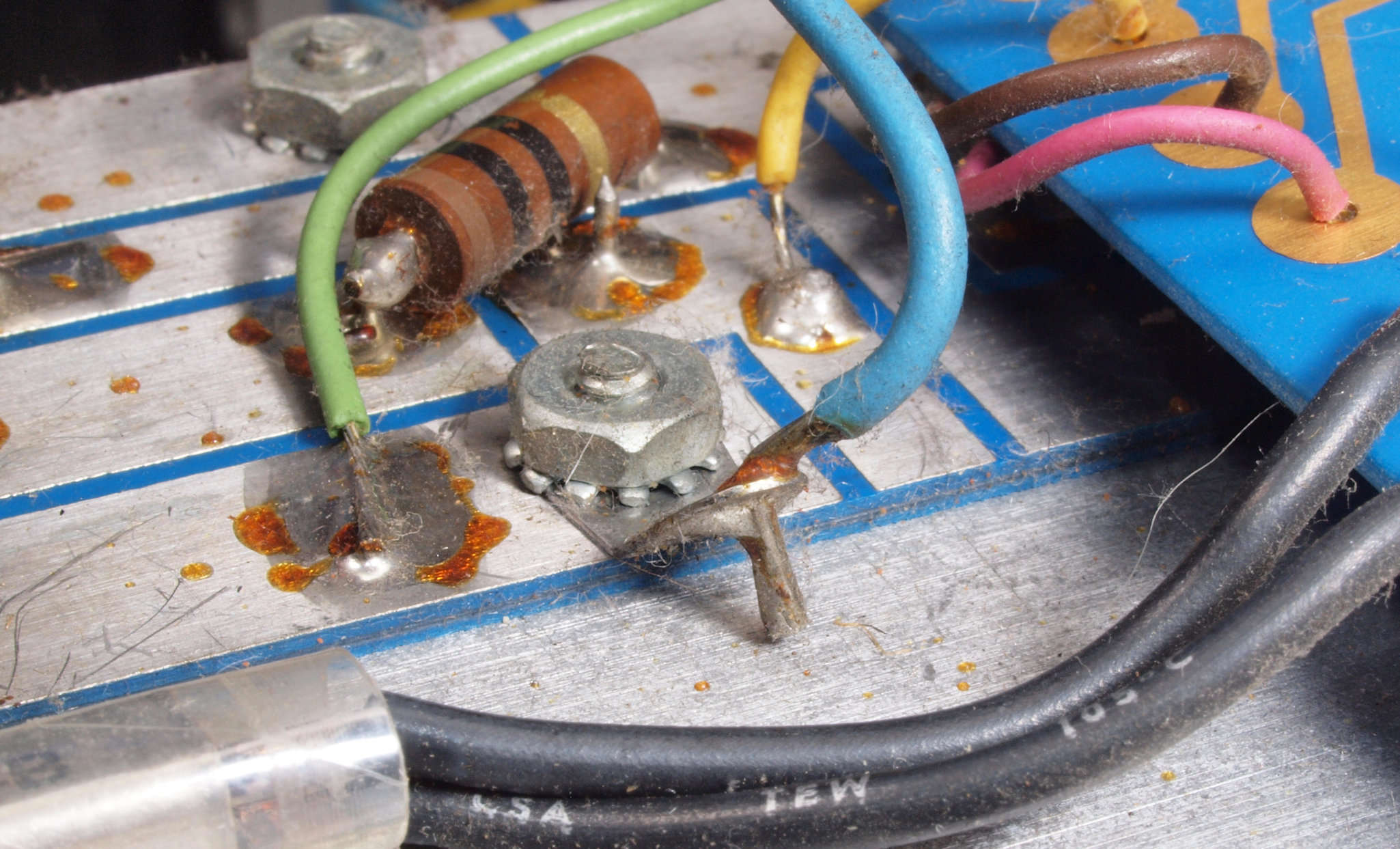 C112. 修理中 右AMPブロック裏。終段−電源供給ラグ板半田付け線(空色)が短絡寸前!