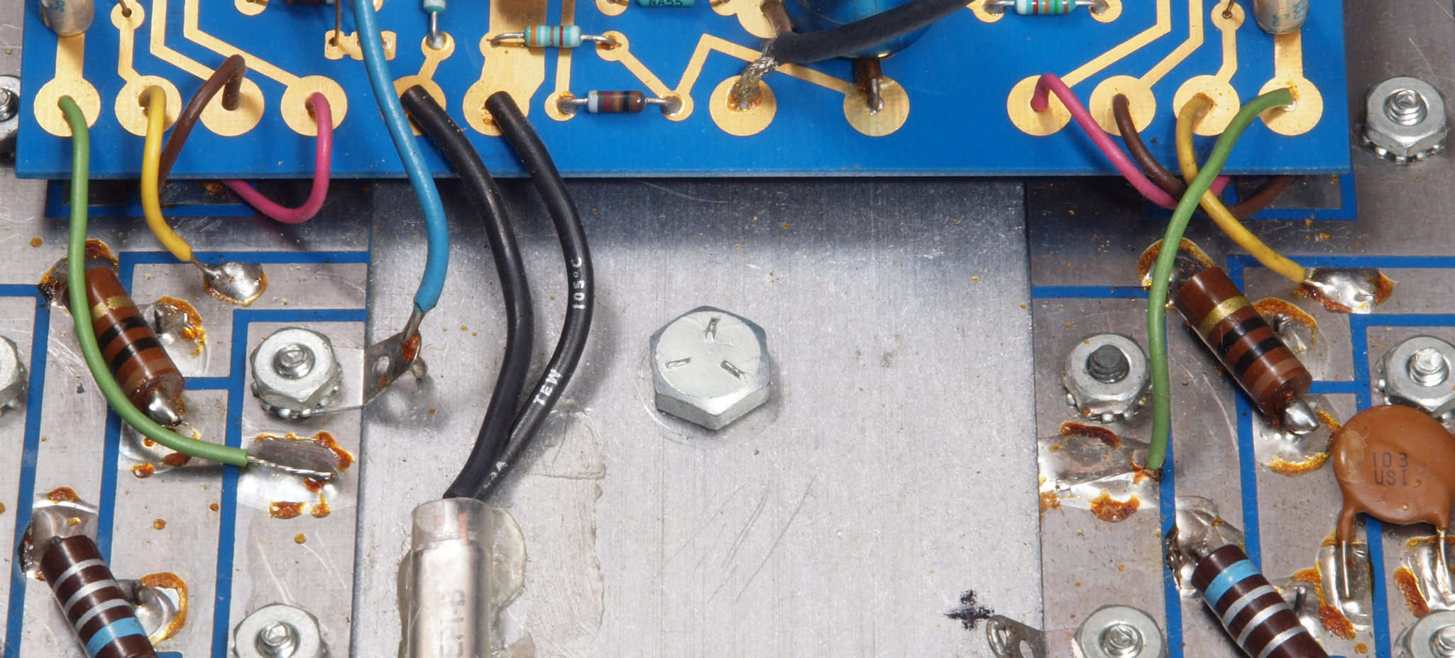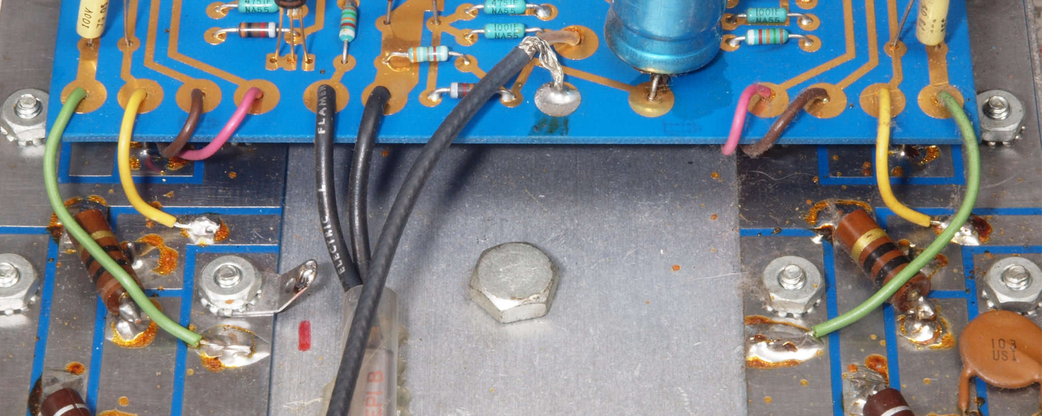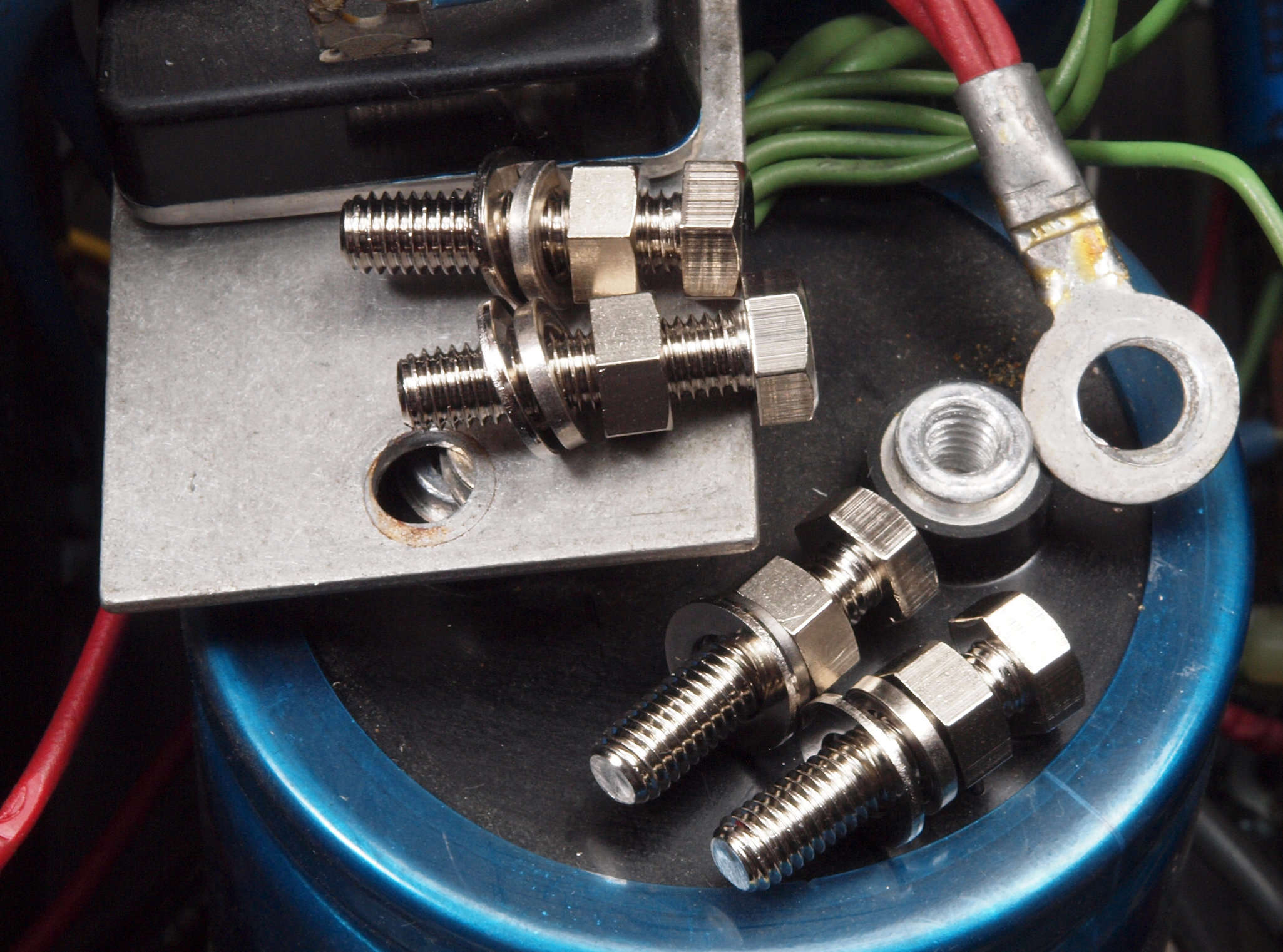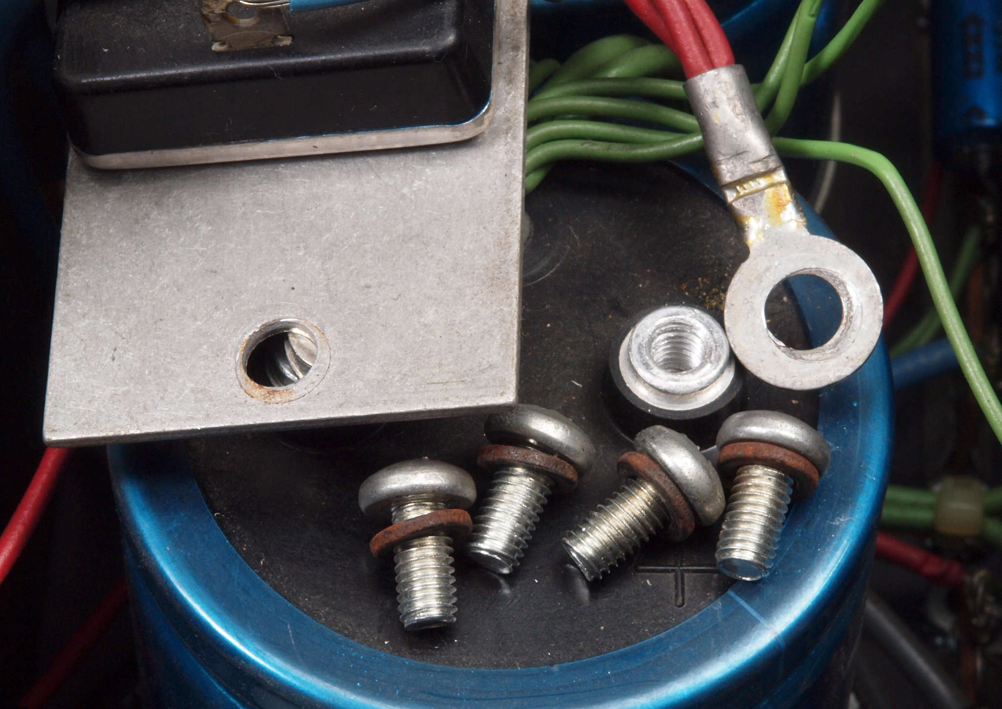 C93. 修理中 電源ブロック電解コンデンサーへの配線固定ビス。ボルト、スプリングワッシャーは鉄製、スプリングワッシャーに錆が出て入る。