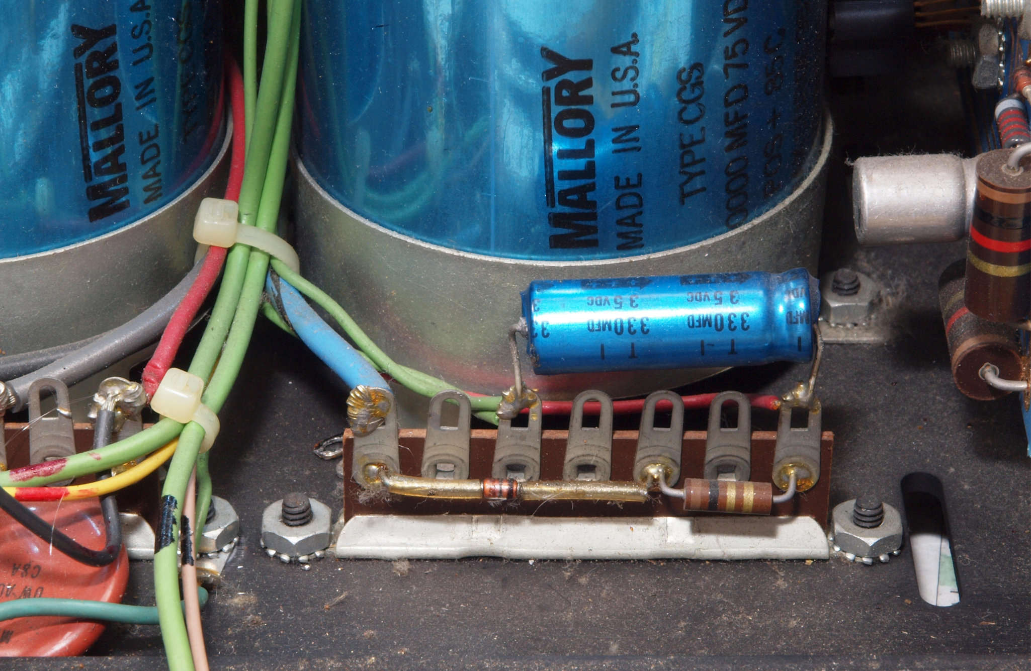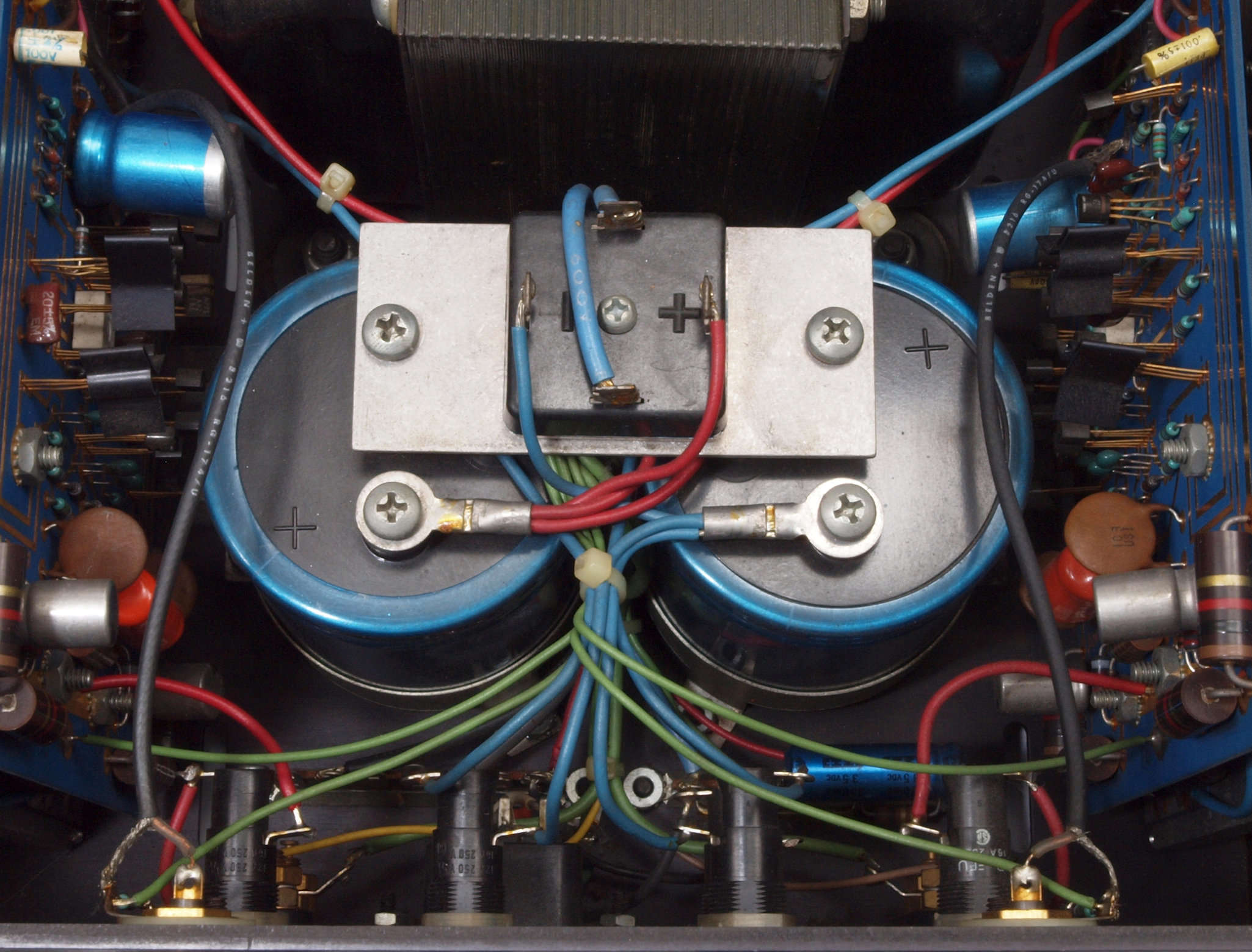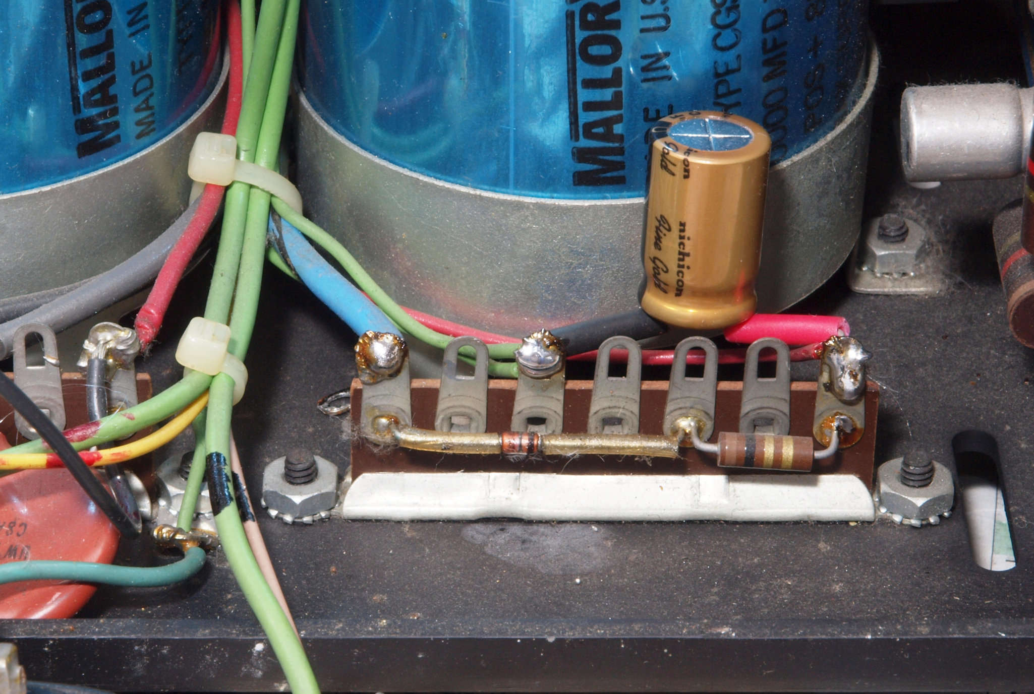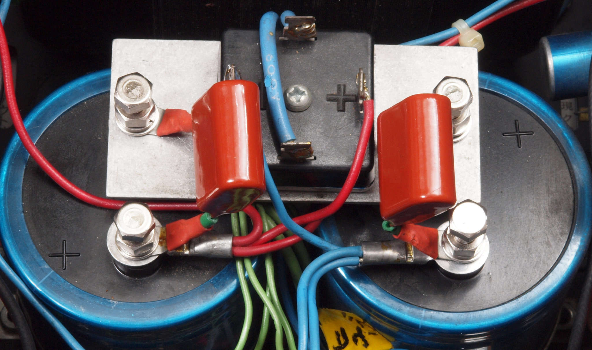 C92. 修理後 電源ブロック電解コンデンサー周り配線。コンデンサー2個追加。