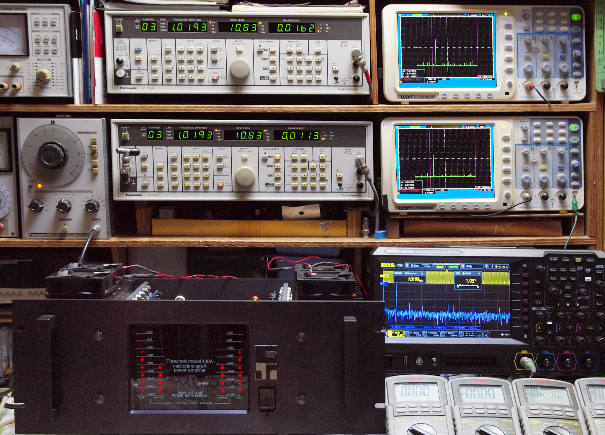 下段左端 オーディオ発振器 VP−7201A より50Hz〜100kHzの信号を出し(歪み率=約0.003%)、ATT+分配器を通し、AMPに入力。