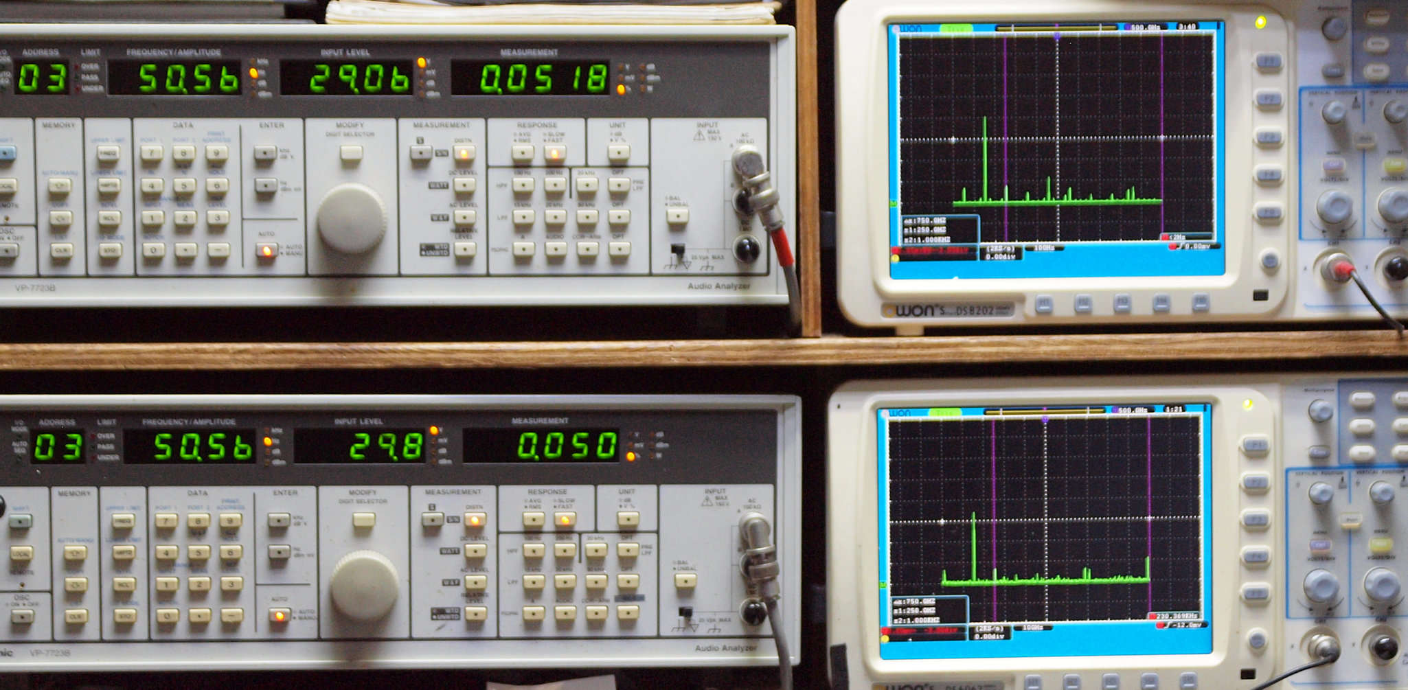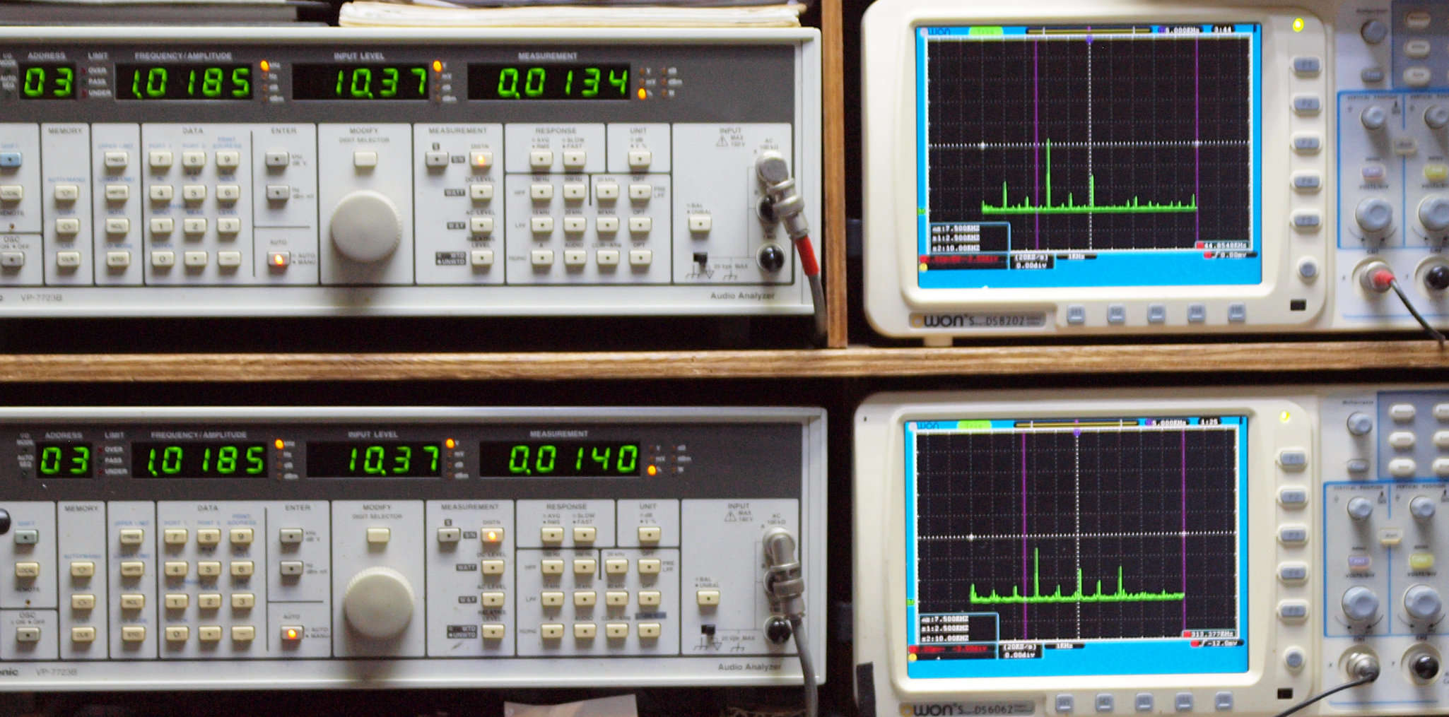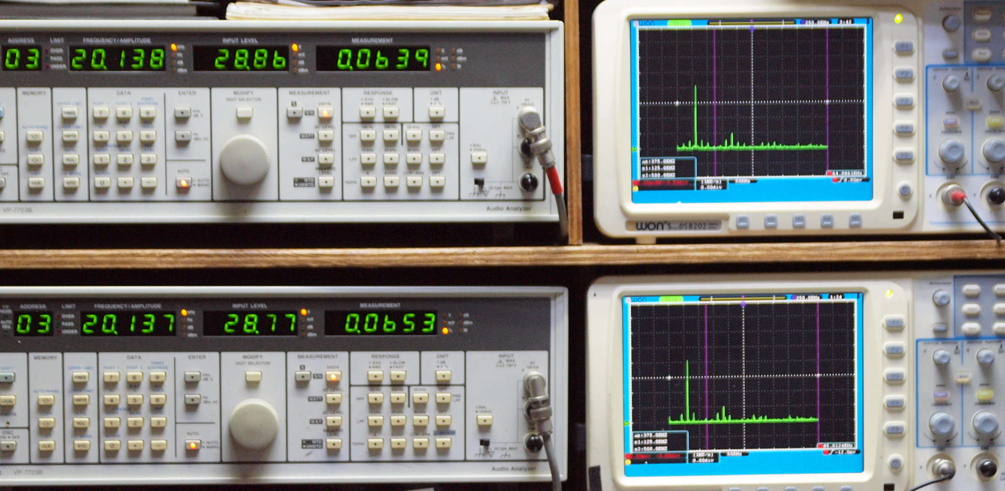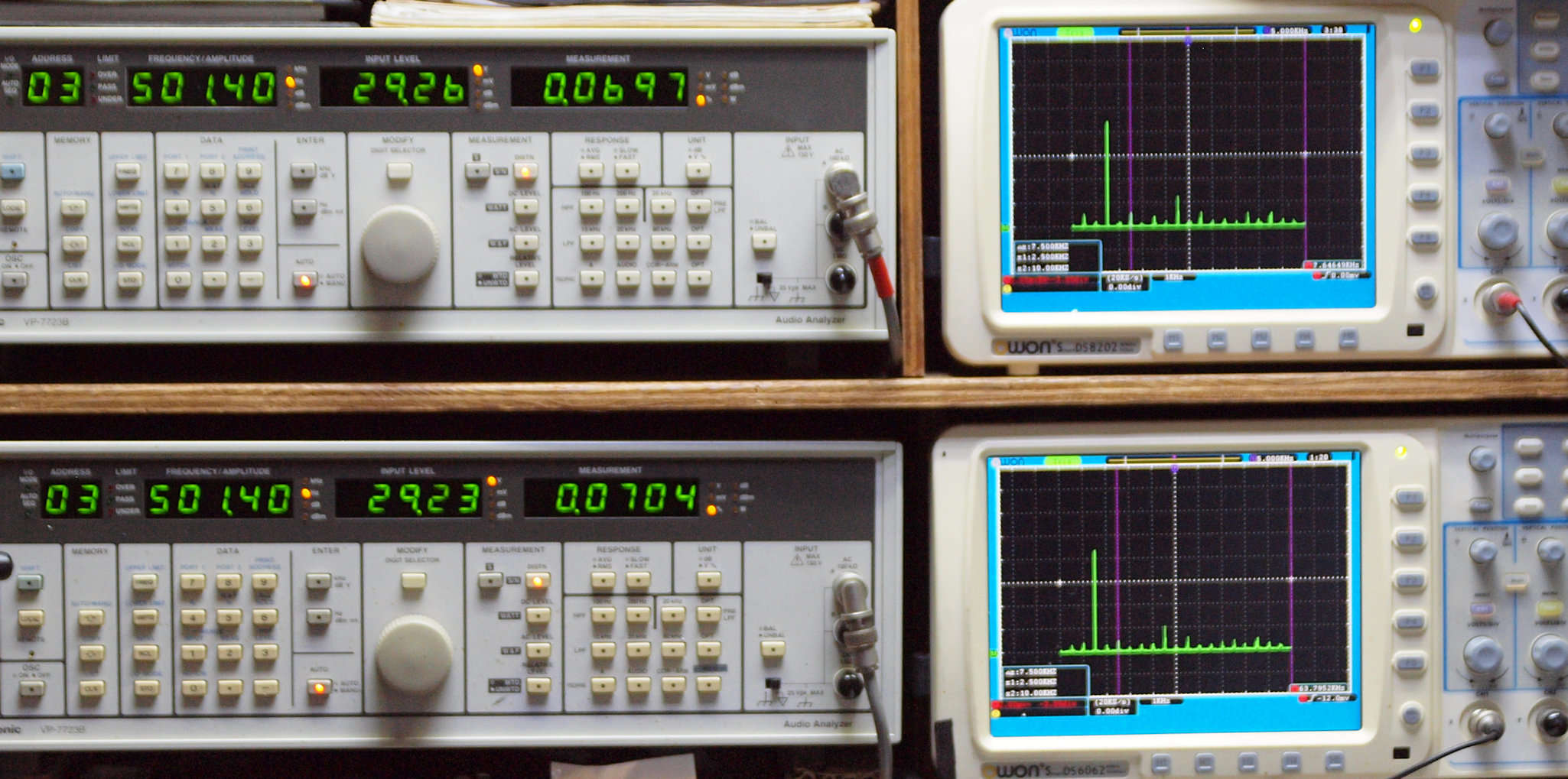 よって、ダイアル設定出力レベルより低くなります。測定機器の仕様や整備の様子はこちら、「VP−7723B」「VP−7201A」。 FFT画面の見方はこちら。