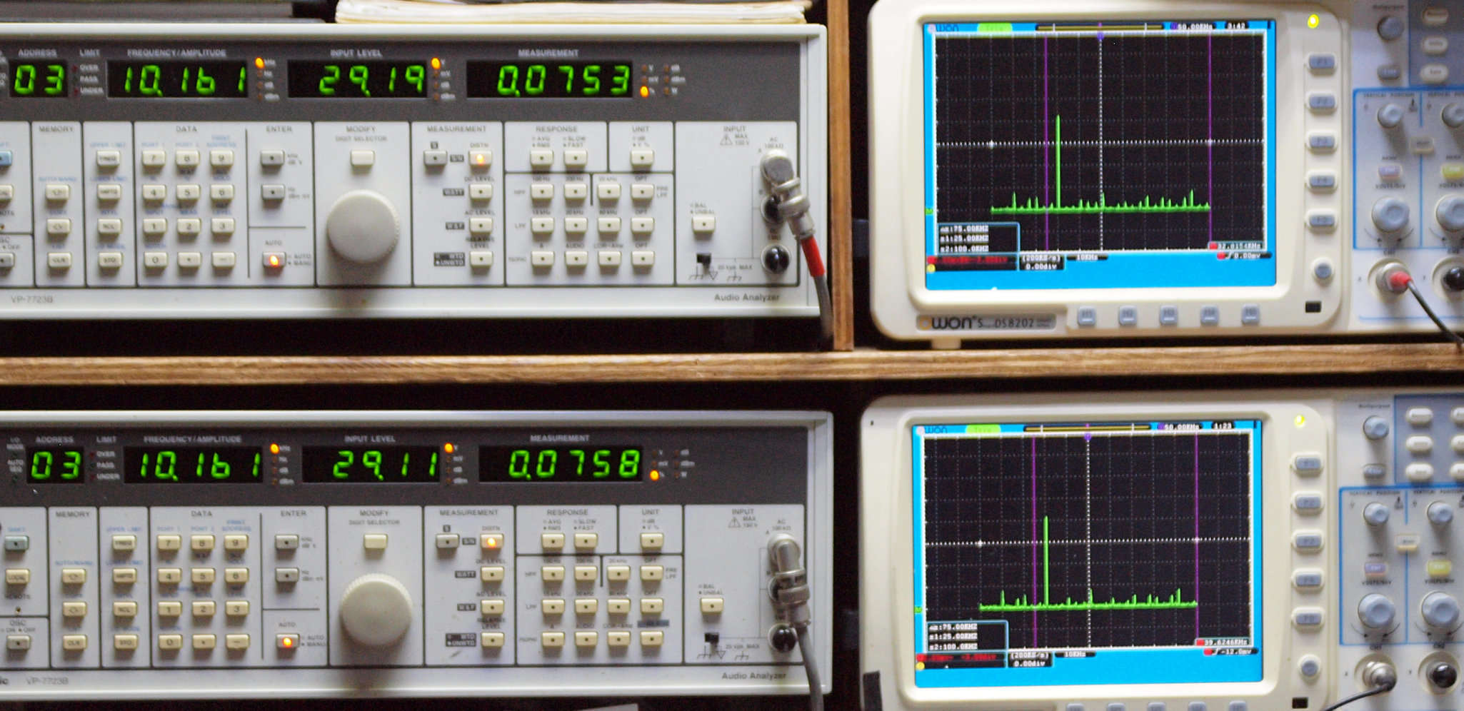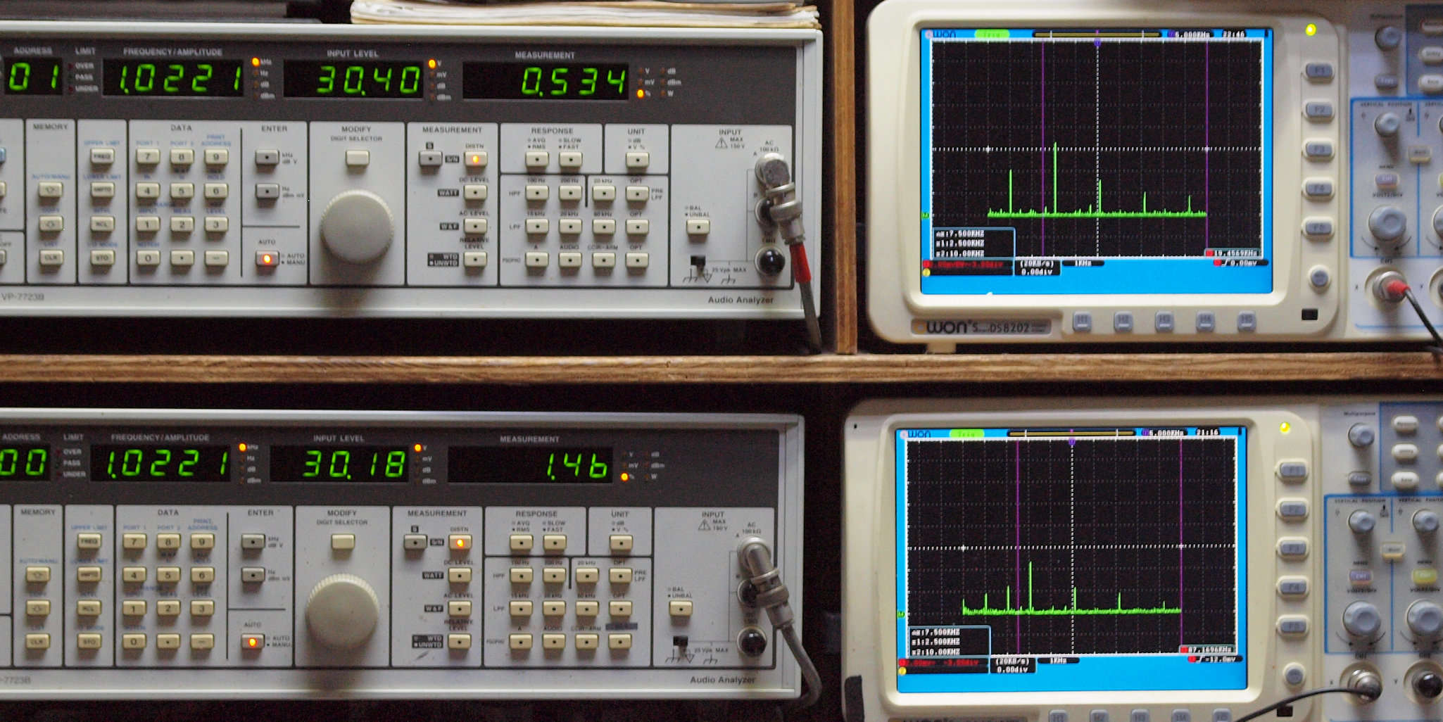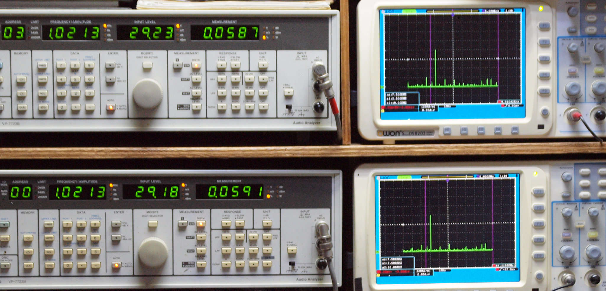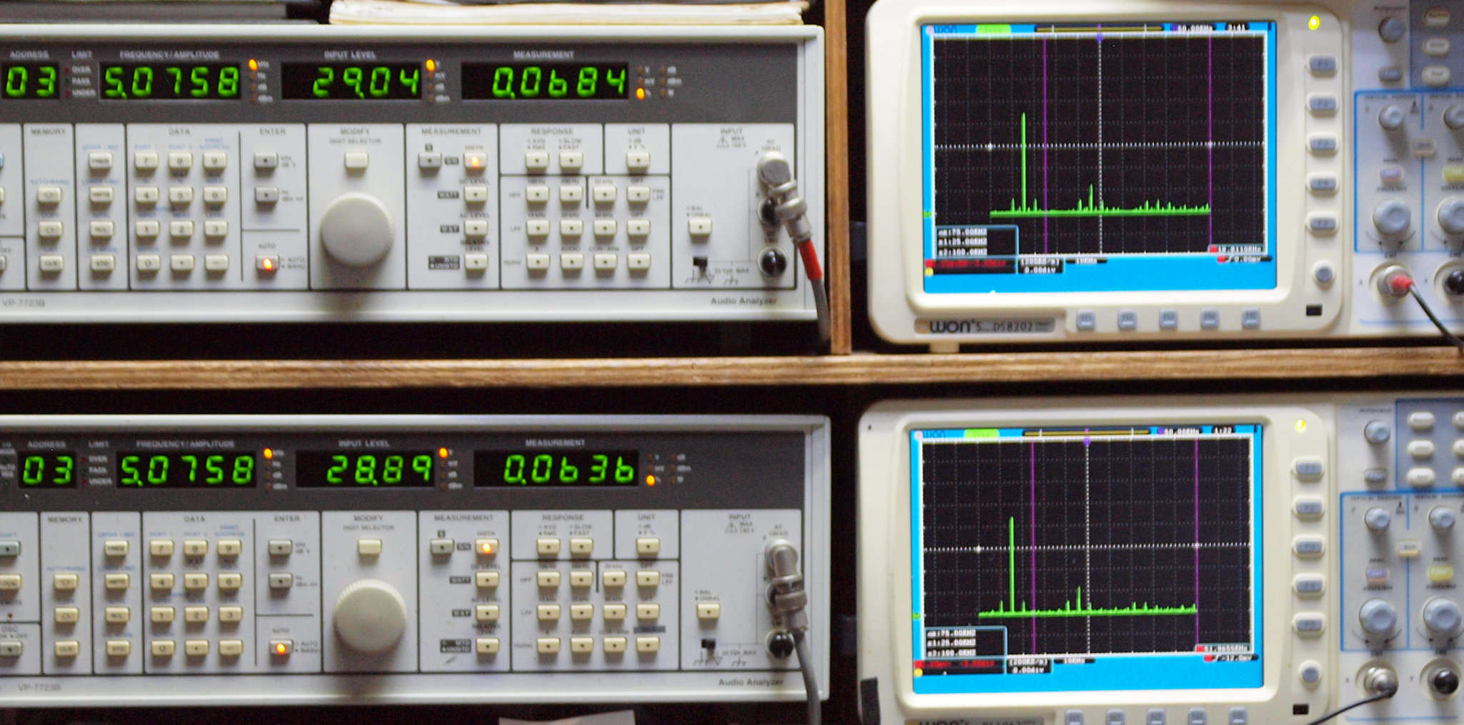 よって、ダイアル設定出力レベルより低くなります。測定機器の仕様や整備の様子はこちら、「VP−7723B」「VP−7201A」。 FFT画面の見方はこちら。