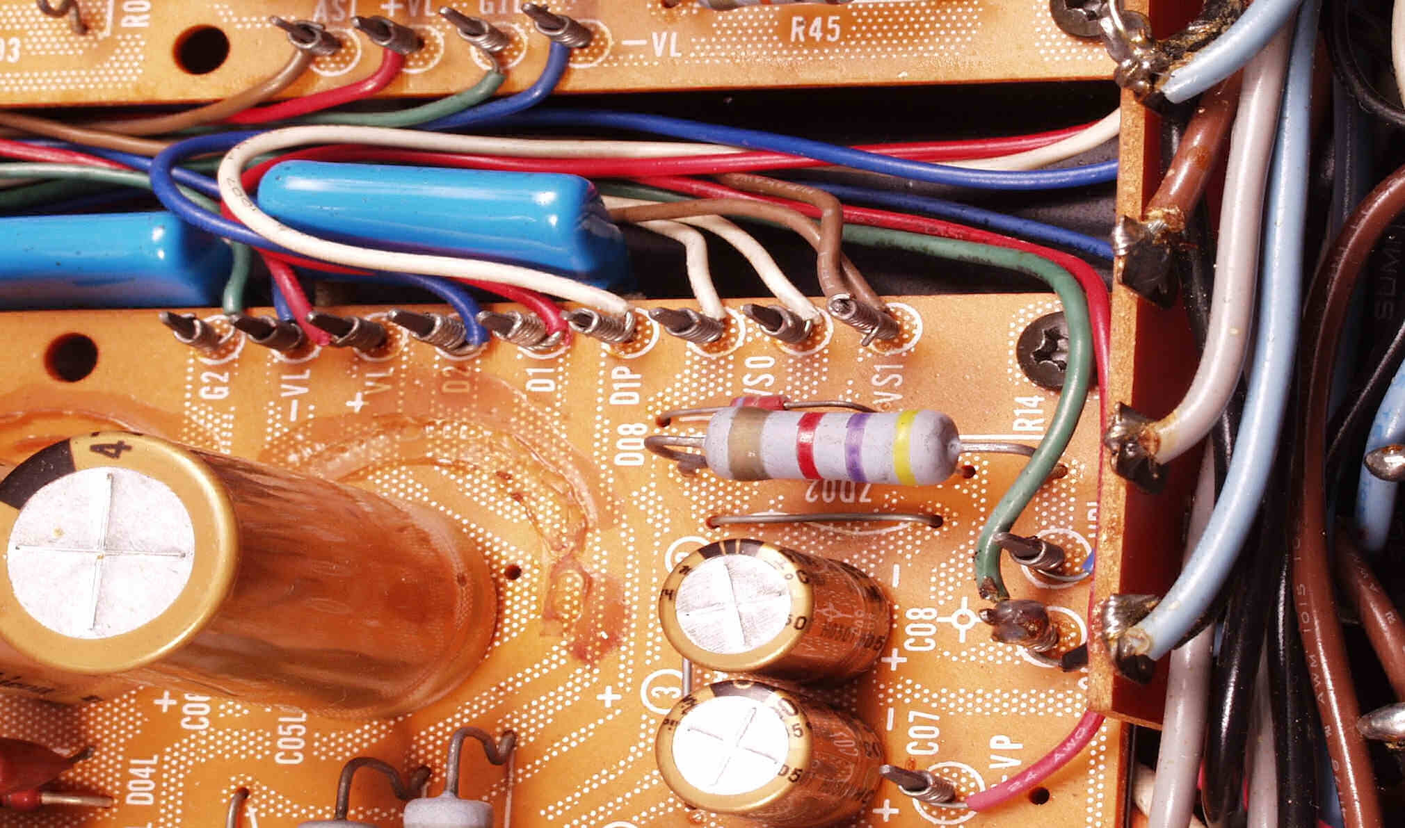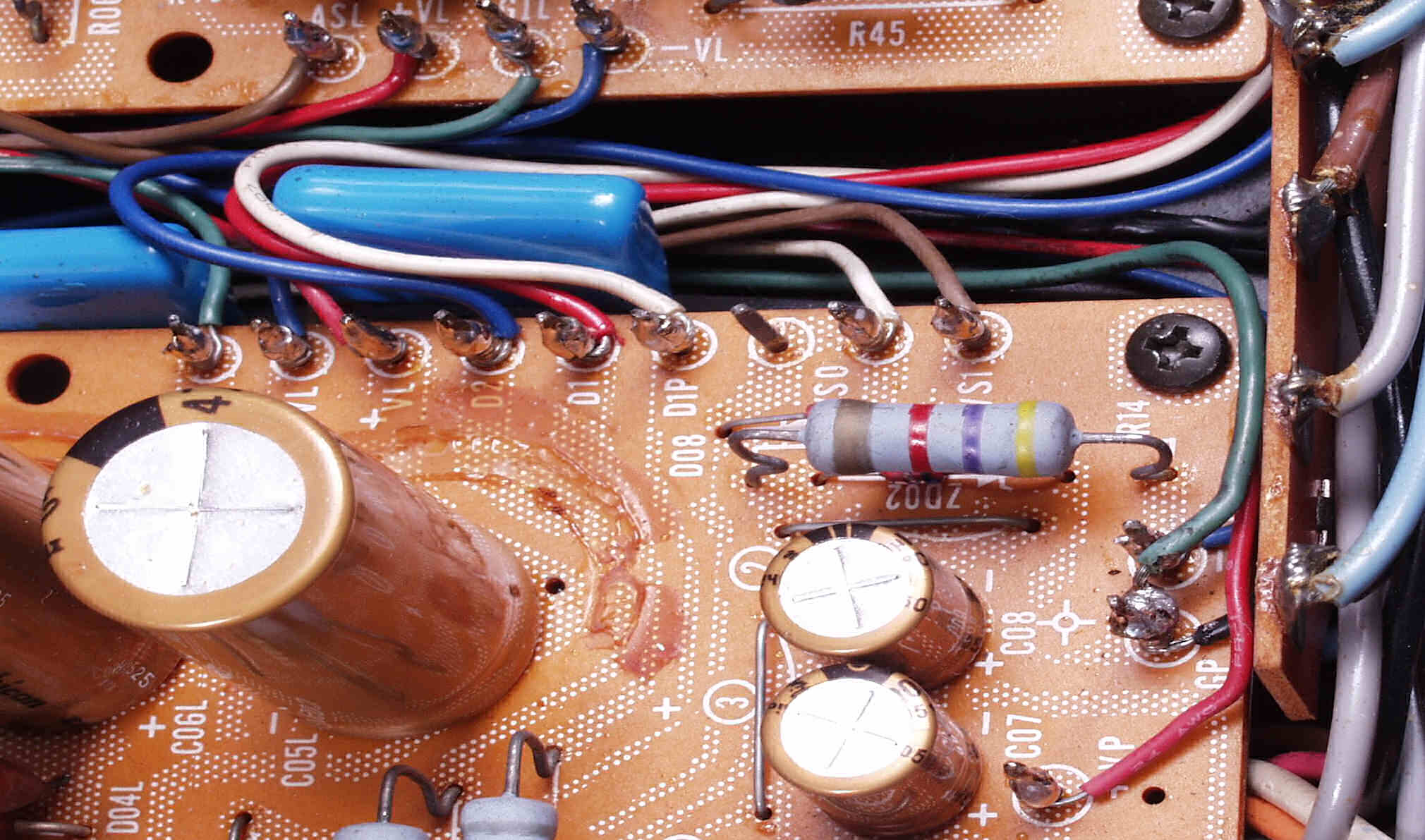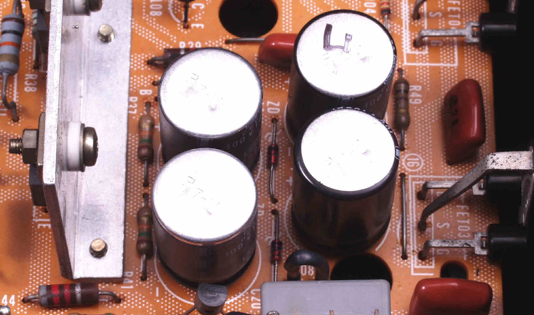 A5B. 修理前見積り点検中 L側AMP基板の電解コンデンサーが熱のため、頭のビニールが剥けた