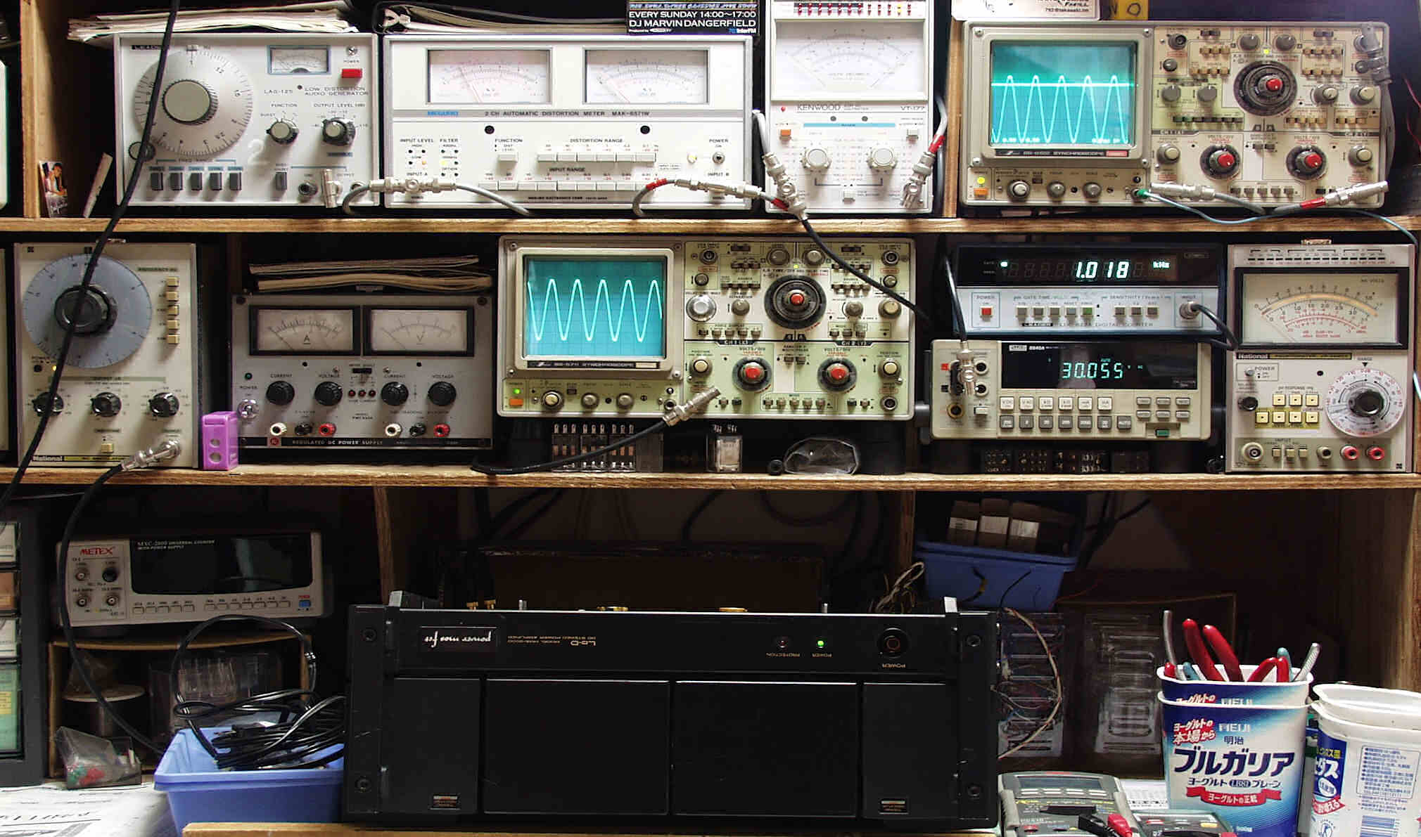 上中左=SP出力の歪み率測定 左メータ=L出力、右メータ=R出力