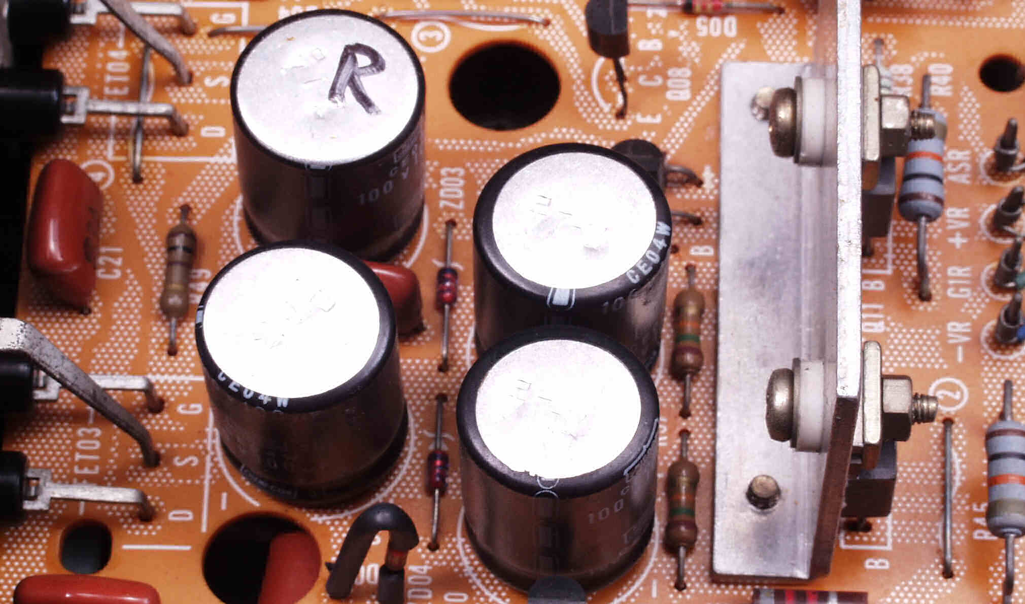 A5A. 修理前見積り点検中 R側AMP基板の電解コンデンサーが熱のため、頭のビニールが剥けた