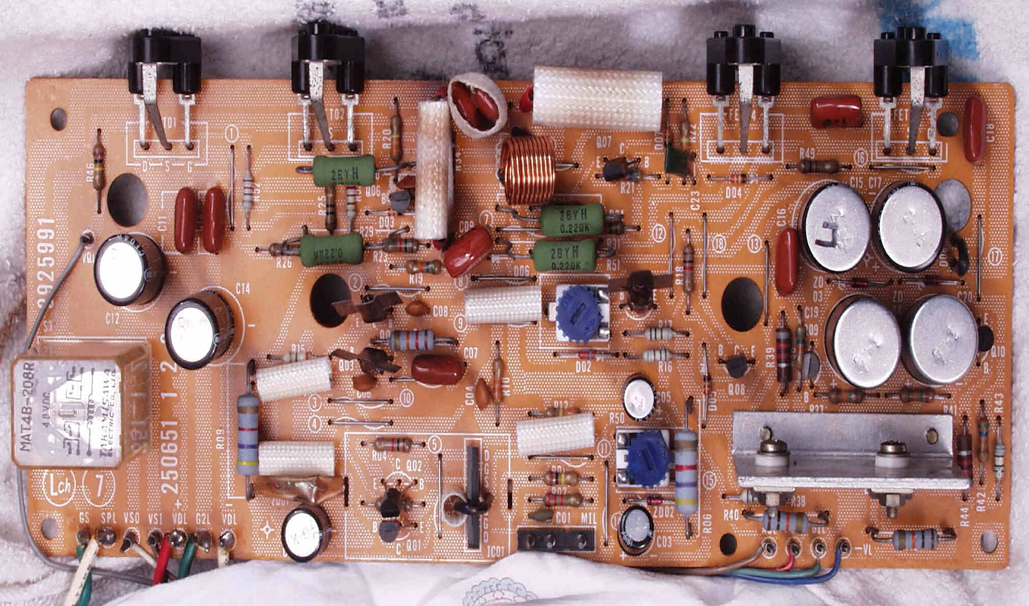 C2B. 修理後 Lドライブ基板 初段FET(電界効果トランジスター)、バランス/バイアス調整用半固定VR2個、SP接続リレー交換