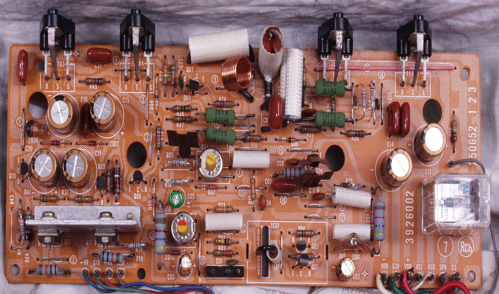 C1B. 修理後 Rドライブ基板 初段FET(電界効果トランジスター)、バランス/バイアス調整用半固定VR2個、SP接続リレー交換