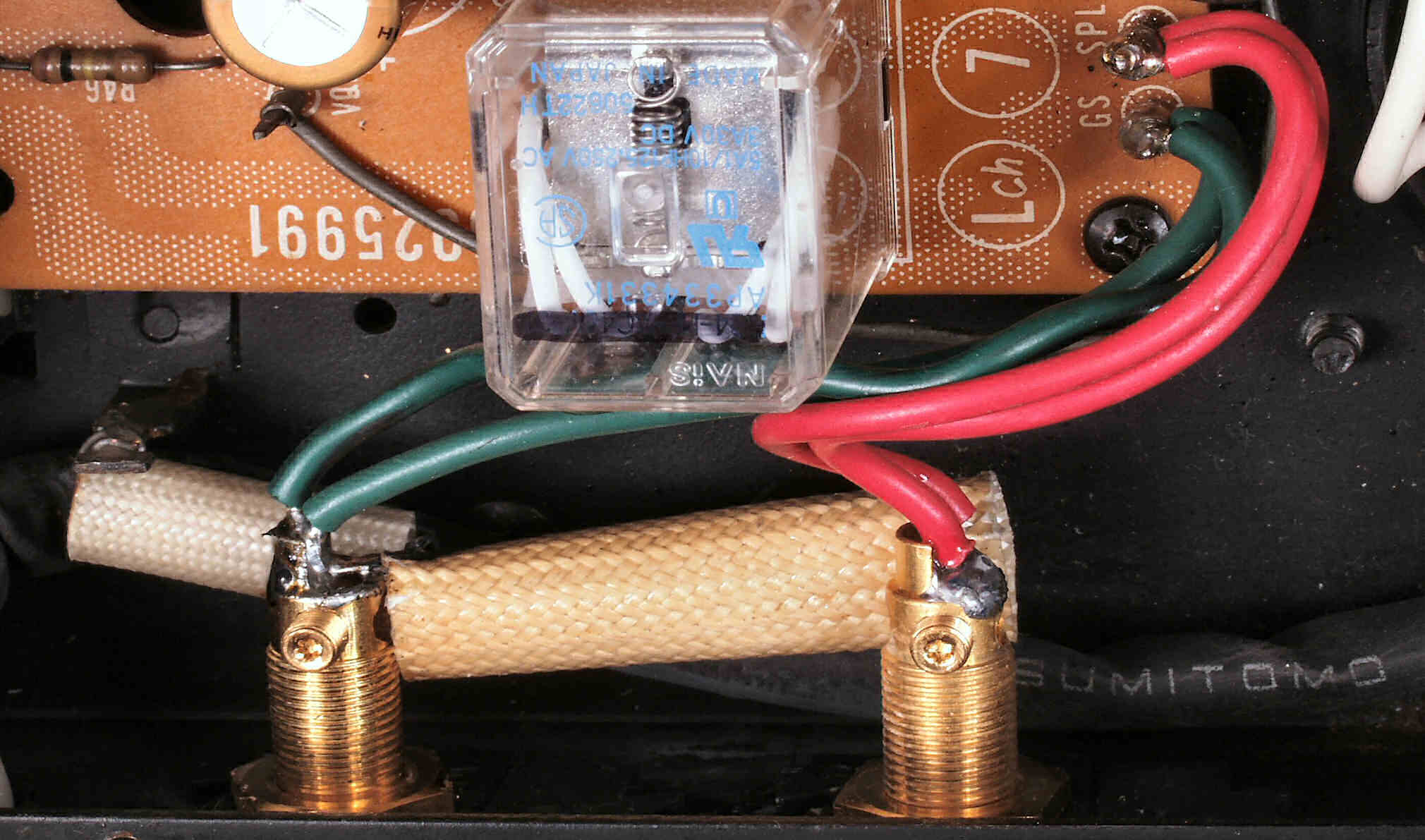 C6H. 修理後 L−SP端子への接続 WBTのネジ止めを生かし、ネジ止め接続+半田接続のW配線にした