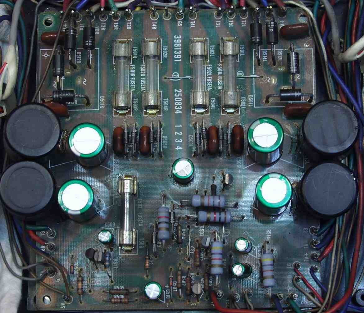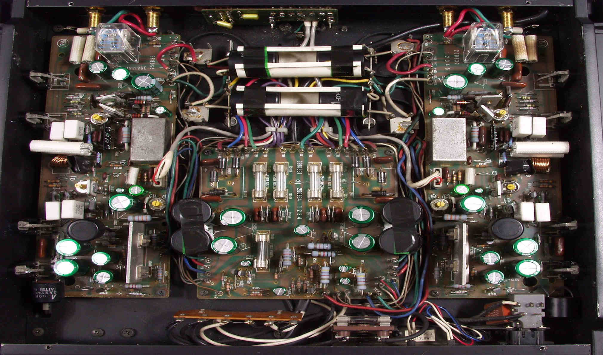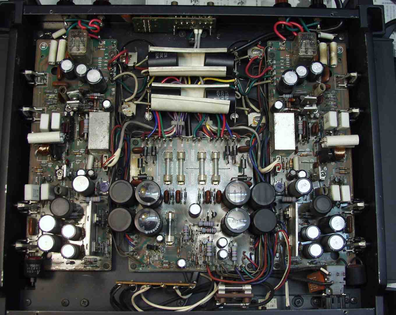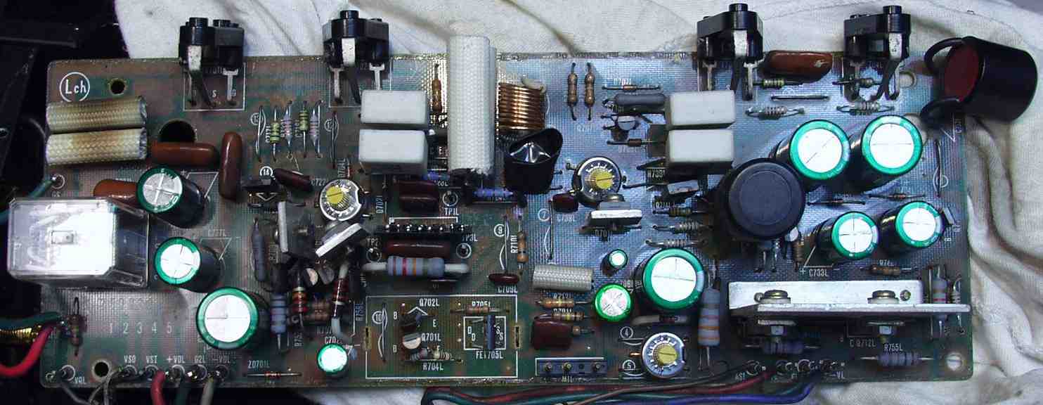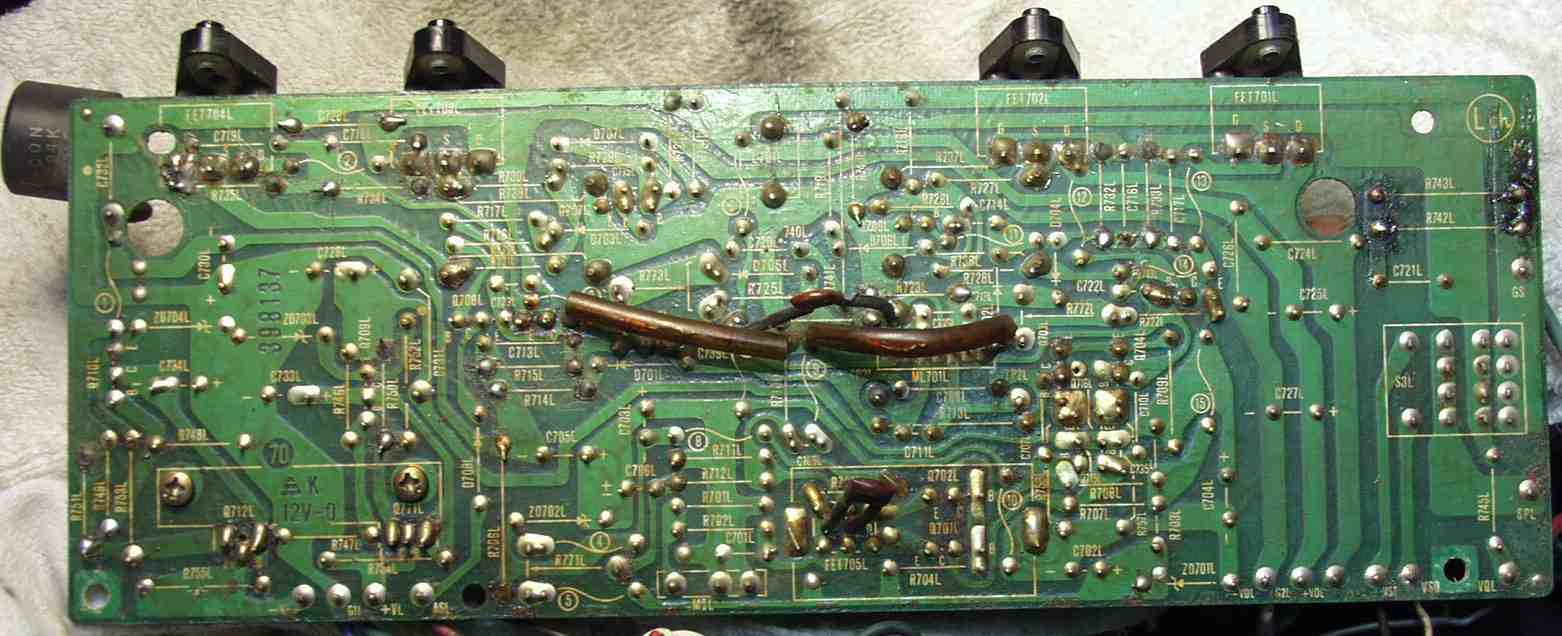 | C−2C. 修理後 Lドライブ基板 初段FET、バランス/バイアス調整用半固定VR、SP接続リレー交換 フューズ入り抵抗も全部交換 全電解コンデンサー交換 モジュール修理 ダイオード2個交換 |