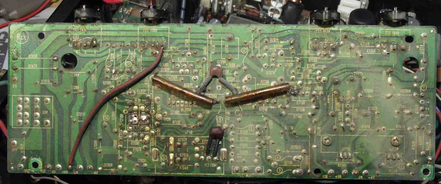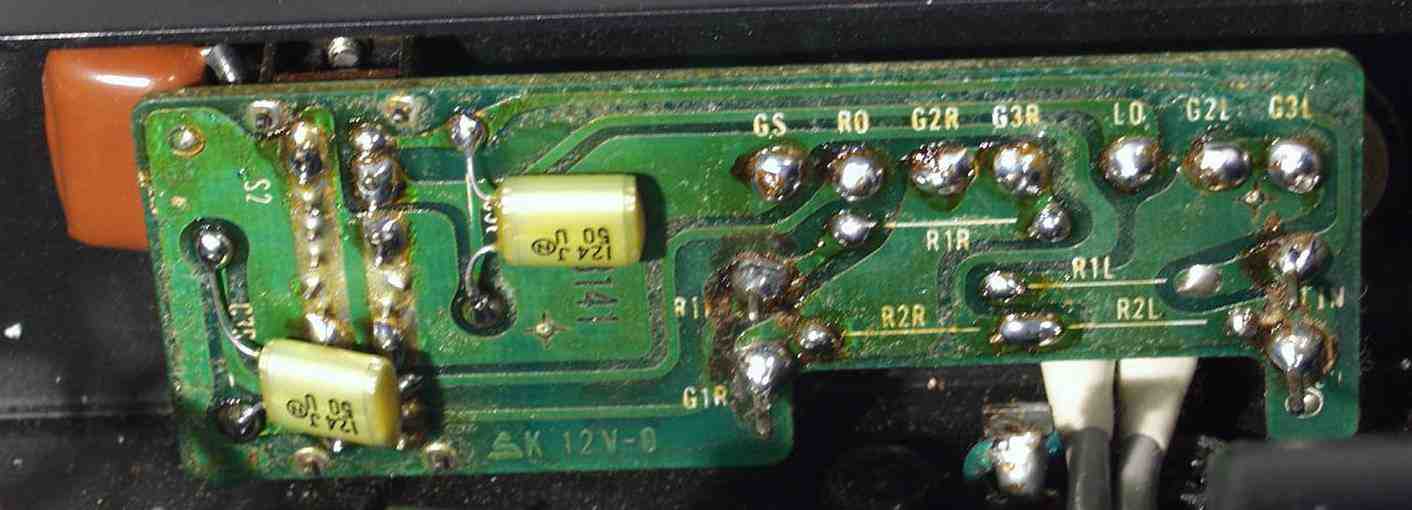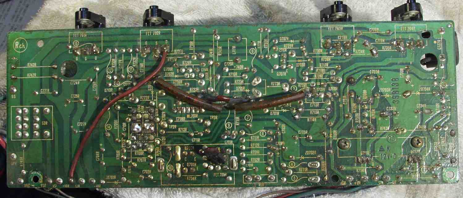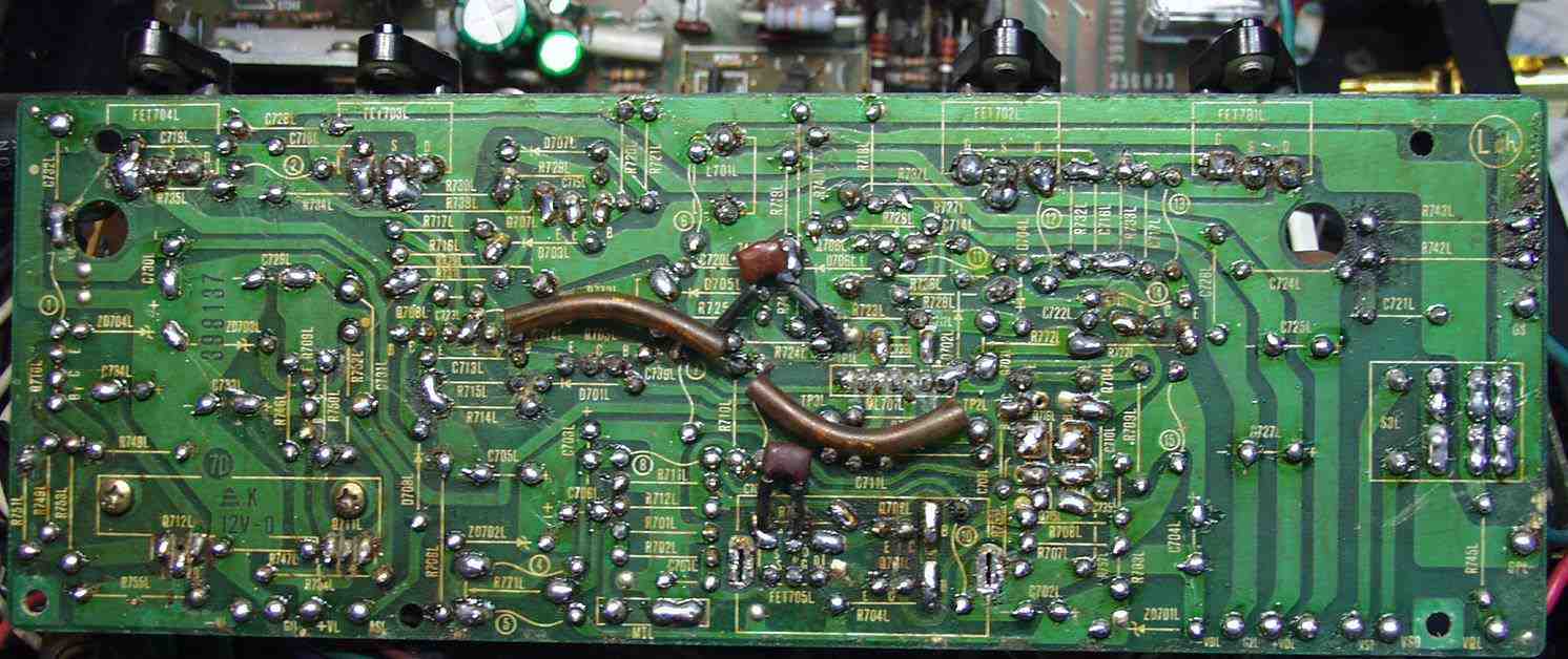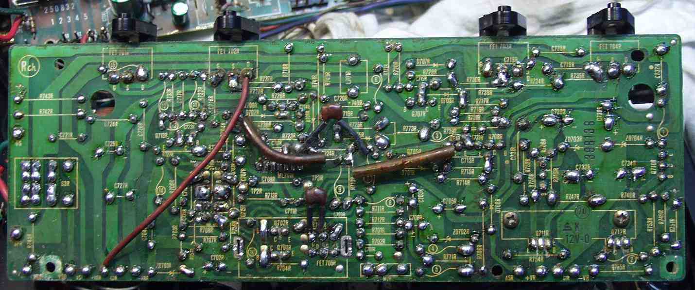 | C−5B. 修理(半田補正)後 入力RCA基盤裏 全ての半田をやり修す フイルムコンデンサー2個追加 |