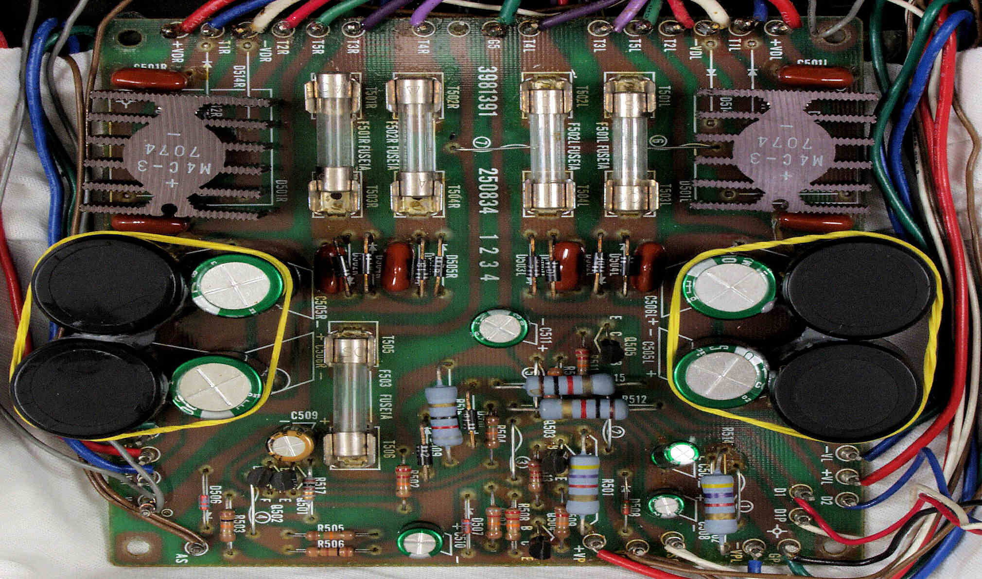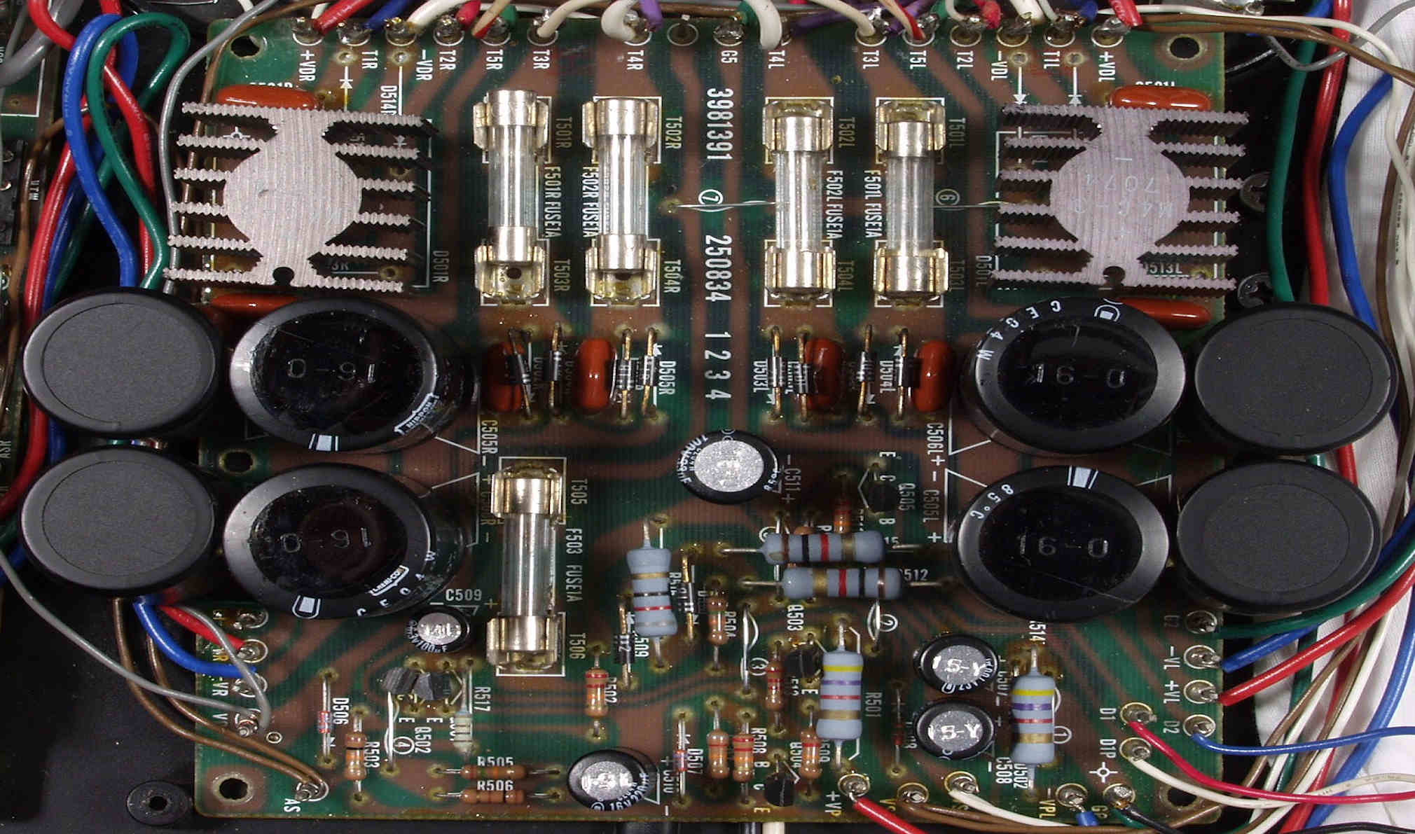 | C. 修理状況 C1A. 修理前 Rドライブ基板 フューズ入抵抗が判断線してバイアス・電流が異常に多い 半固定VRは皆真ん中? |