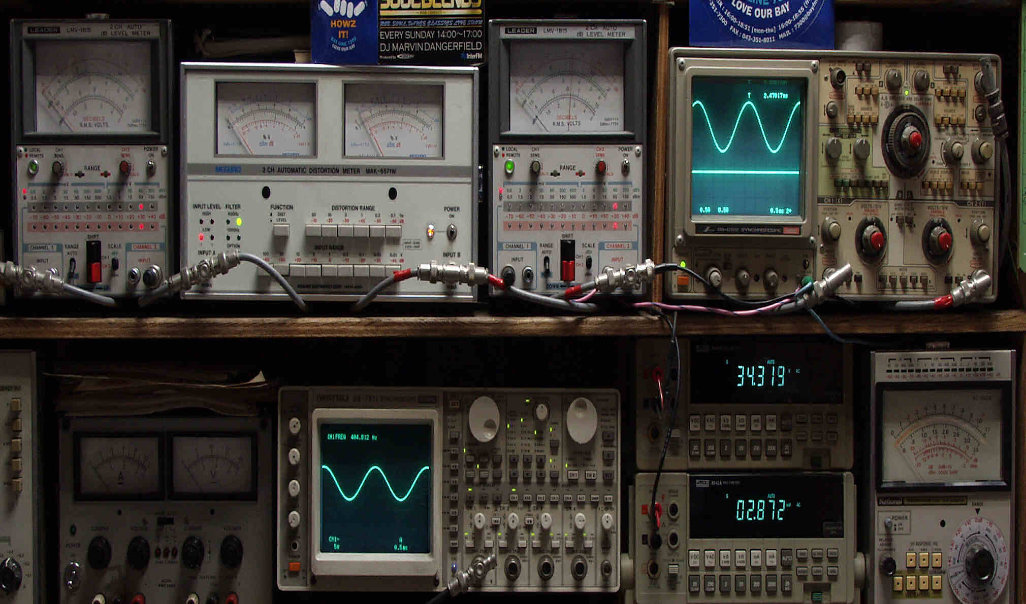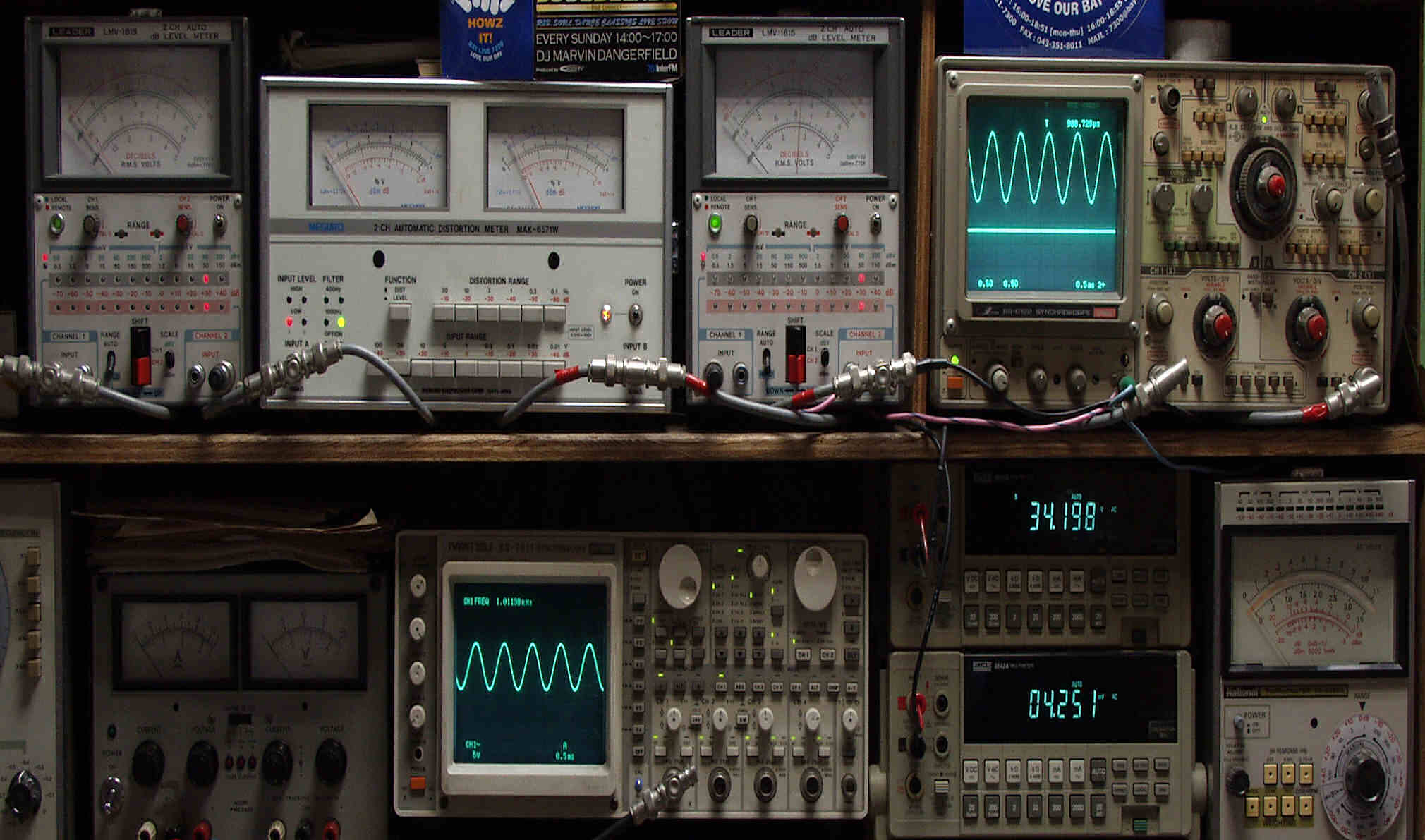 | E. 調整・測定 E1. 出力・歪み率測定・調整 <見方> 下段左端 オーディオ発振器より400HZ・1KHZの信号を出し(歪み率=約0.003%)これをAMPに入力し、出力を測定 下段中左 オシロ=入力波形(オーディオ発振器のTTLレベル) 下段中右上=周波数計 上段左端 電圧計=L側出力電圧測定、黒針のみ使用 上段中左 歪み率計=出力の歪み率測定 左メータ=L出力、右メータ=R出力 上段中右 電圧計=R側出力電圧測定、赤針のみ使用 上段右端 オシロ=出力波形 上=R出力、下=L出力(実際にはRL電圧計の出力「Max1V」を観測) 下段中右上 デジタル電圧計=R出力電圧測定 下段中右下 デジタル電圧計=L出力電圧測定 |