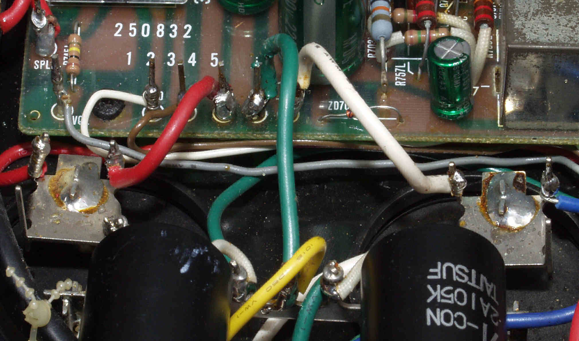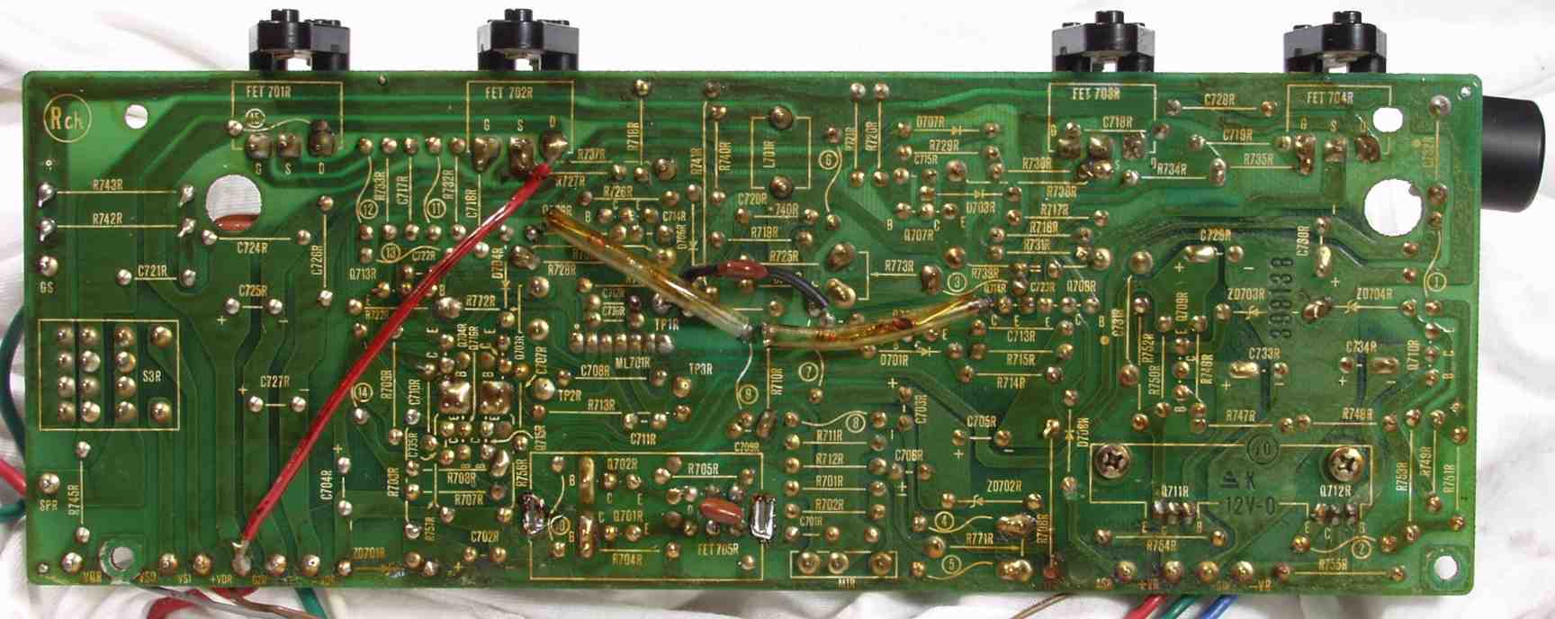 | C7C. 修理後 R側ドライブ基板−電源基板へのラッピング線に半田を浸み込ませる |