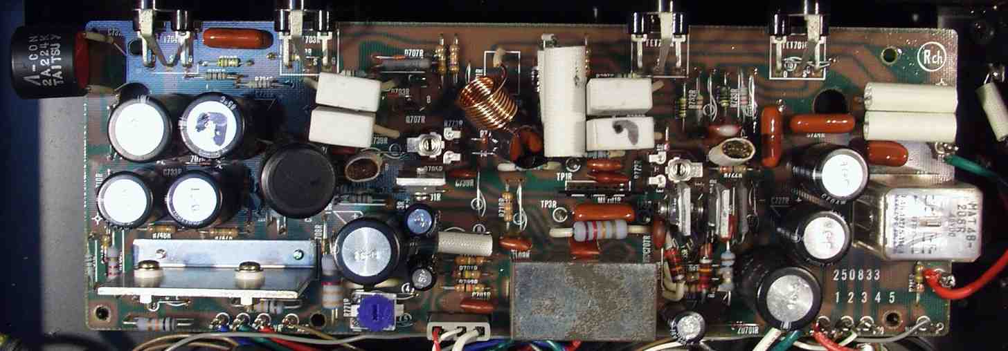 | A. 修理前の状況 A1. 修理前 下から見る、非常に綺麗です。 AMP部の電解コンデンサーのビニールの後退も少ない。 依頼者コメント ”小生は転勤族でアンプは実家に置いてあり年に数回しか鳴らしていなかったので、使用時間はそれほどでもなかったのですが?” を裏付ける。 |