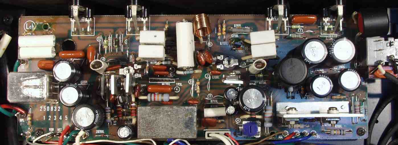 | C2A. 修理前 Lドライブ基板 フューズ入抵抗が断線して、前段TR(トランジスター)短絡し、終段FETが短絡状態 終段FETが心配? 半固定VRは皆真ん中? |