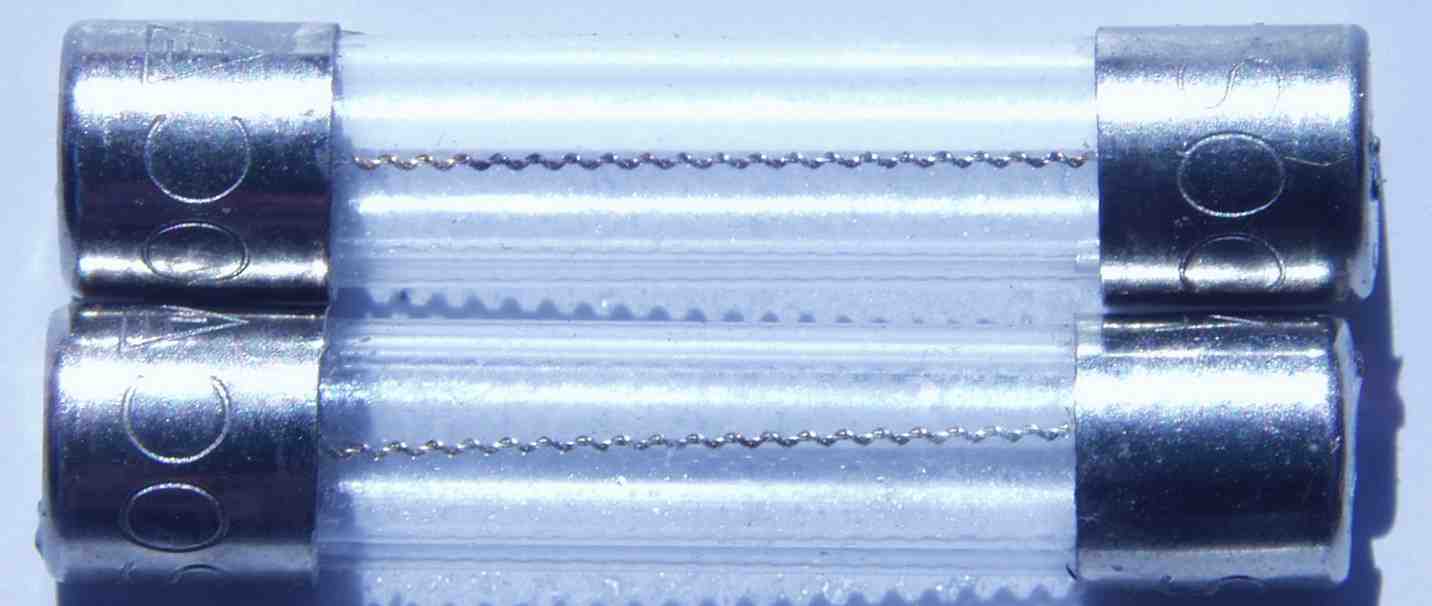 | A3. 点検中 電源トランスの100Vの1次巻き線の前に入るフューズ 上が断線したトランスに入っていた物、焼けた後が有る |