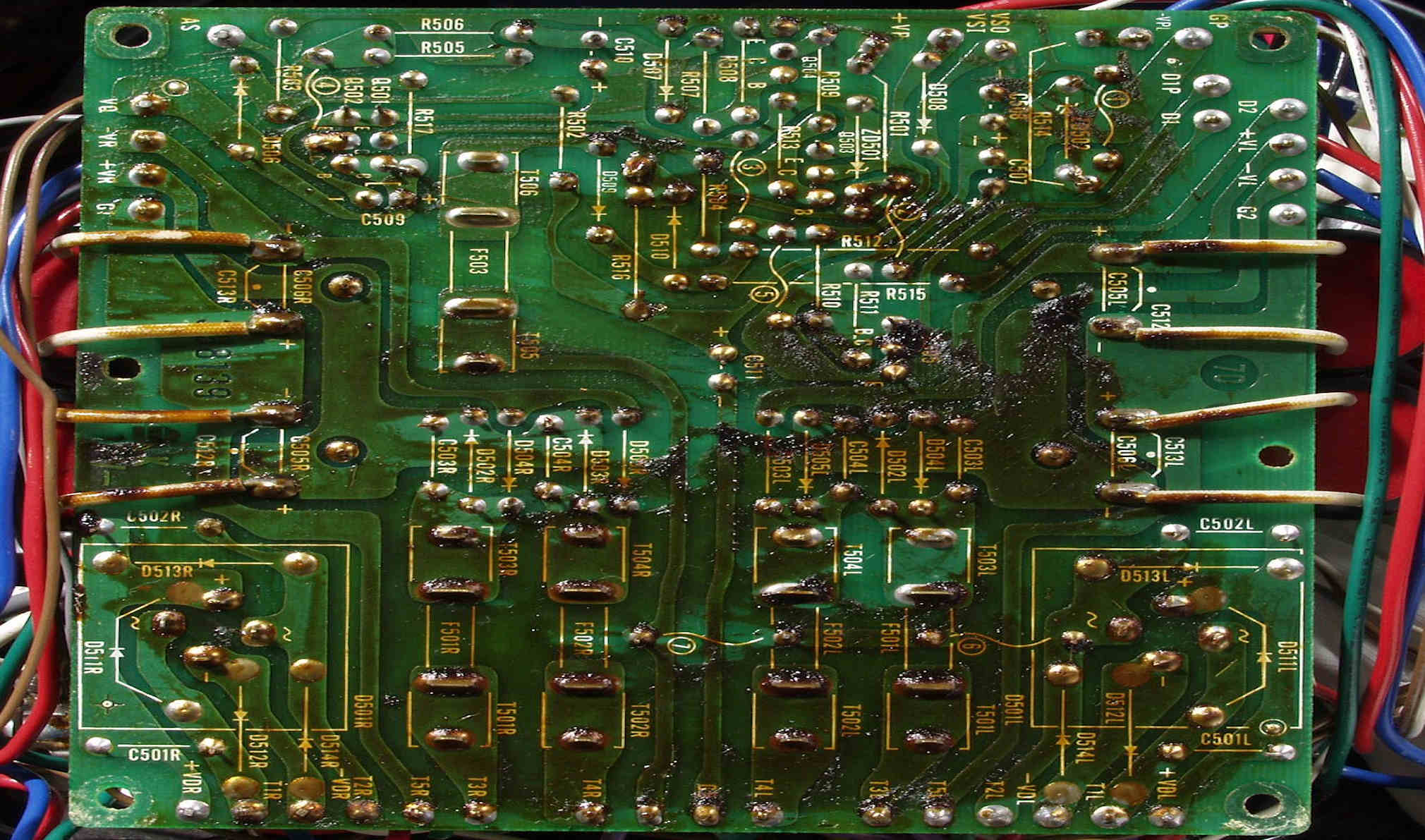 | C2C. 修理前 Lドライブ基板裏 熱の為焼けた基板 C−1C.と比較すると良く解る |