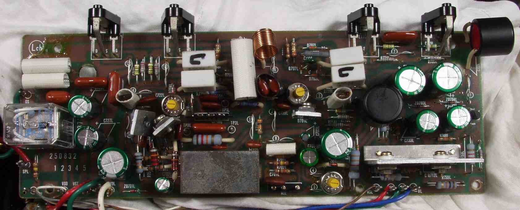 | C2B. 修理後 Lドライブ基板 初段FET、バランス/バイアス調整用半固定VR3個、SP接続リレー交換 フューズ入り抵抗全部、電解コンデンサー11個交換 モジュール修理 |
