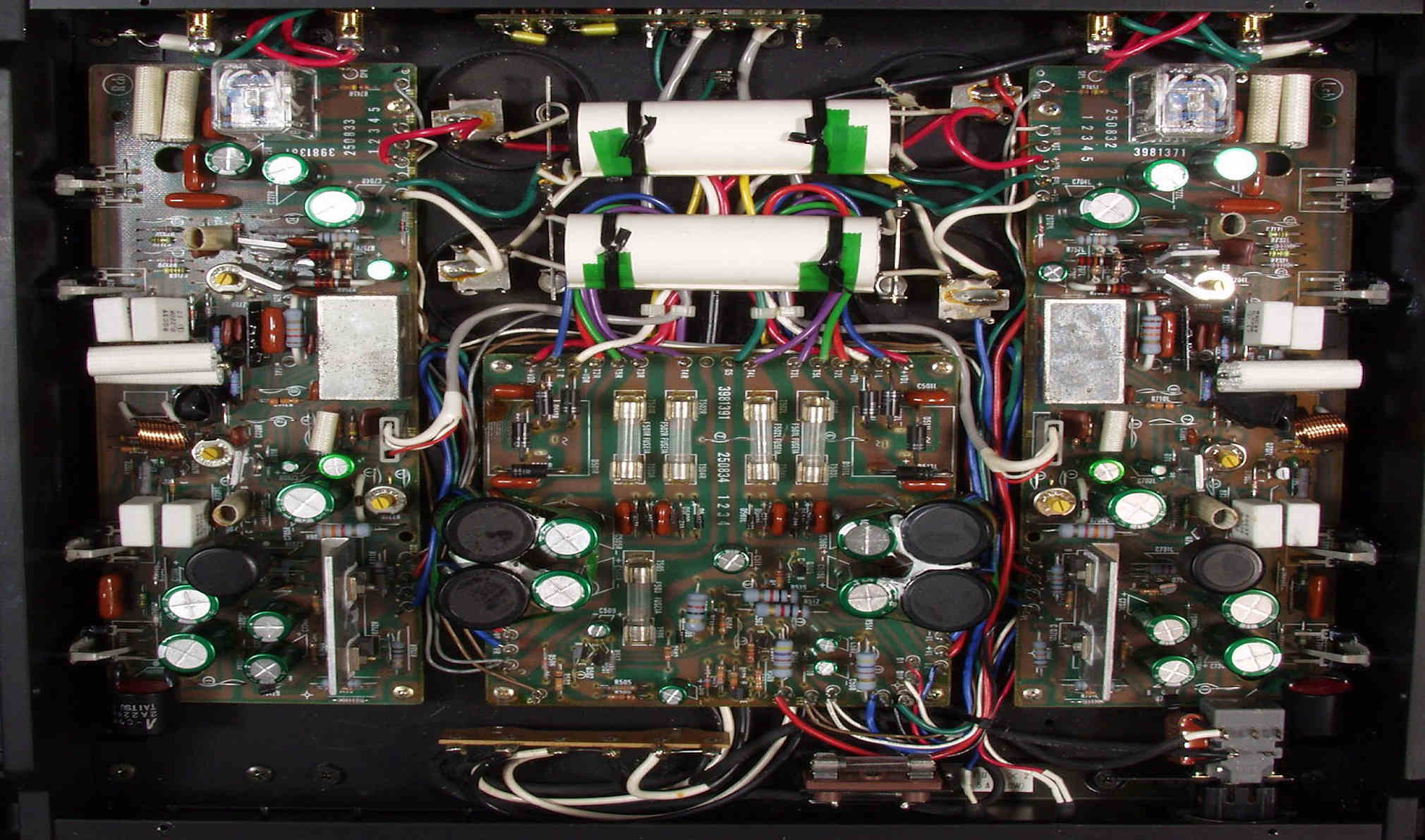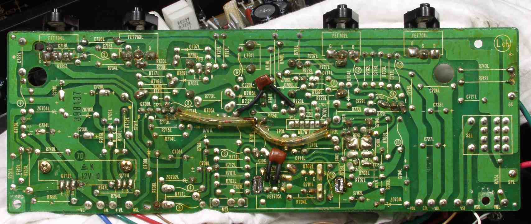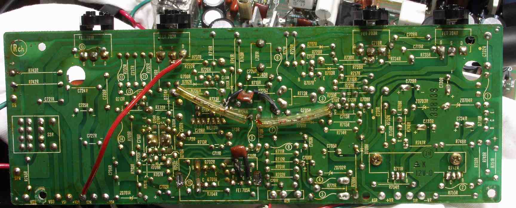 | A. 修理前の状況 A1. 修理前点検中 下から見る、非常に綺麗です AMP部の電解コンデンサーのビニールの後退も少ない |