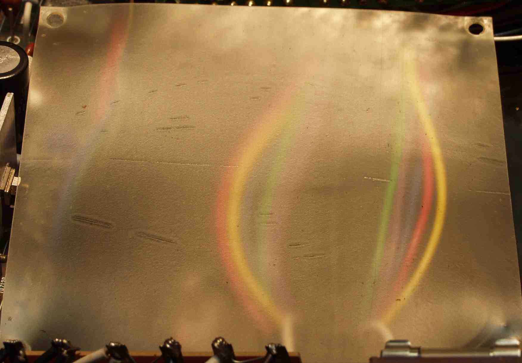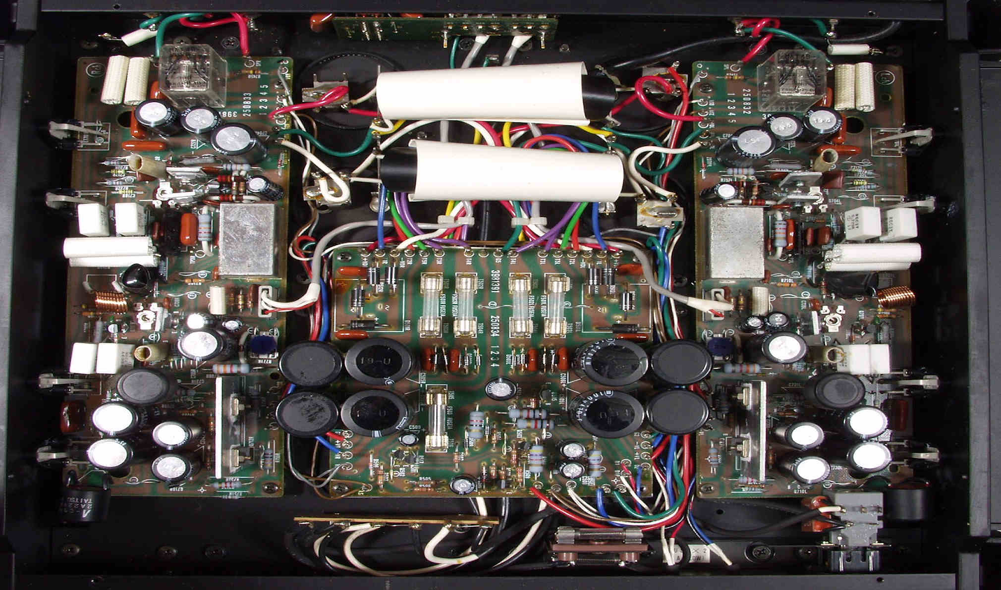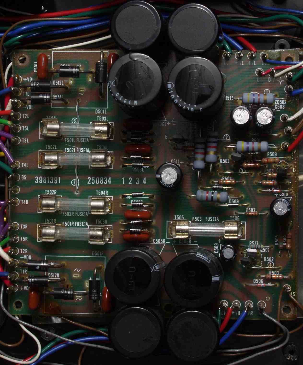 | A. 修理前の状況 A1. 修理前点検中 下から見る、非常に綺麗です AMP部の電解コンデンサーのビニールの後退も少ない |