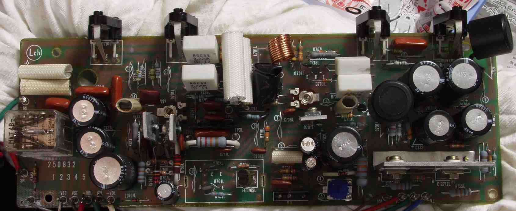 | C2B. 修理後 Lドライブ基板 初段FET、バランス/バイアス調整用半固定VR3個、SP接続リレー交換 フューズ入り抵抗全部、電解コンデンサー11個交換 モジュール修理 |