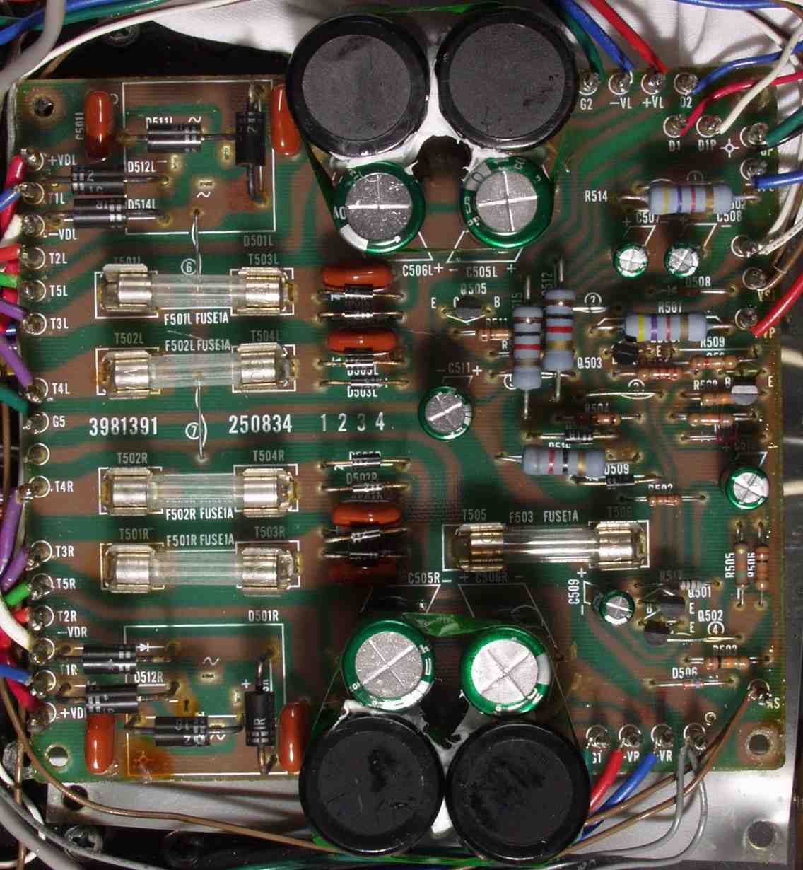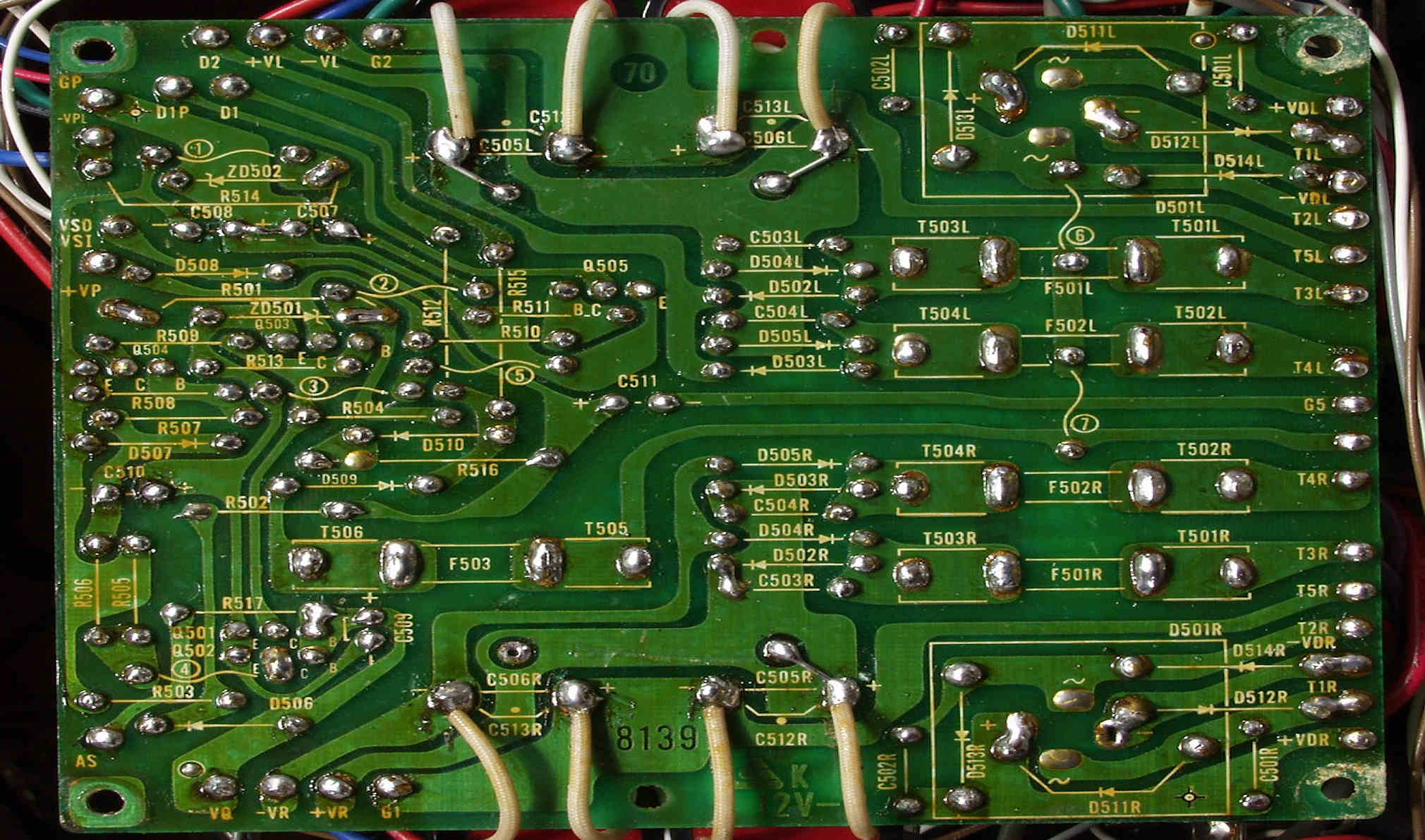 | C3B. 修理後 電源基盤 フューズ入り抵抗全部、電解コンデンサー9個交換 ジャンパー線も半田を浸み込ませる |