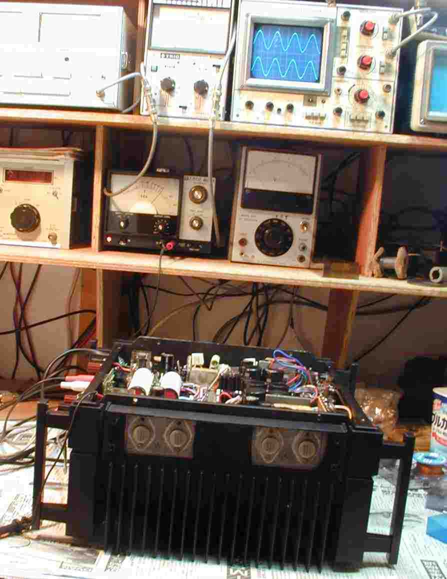 | A. 修理前の状況 左側の放熱器の異常発熱に気がつき、さらに大音量時に歪む。 メーカーに修理の問い合わせをしたのですが、部品がないとのことで断られました。 そこでインターネットで回路図を手に入れ、自分で直すことにしました。 回路図を見ながら抵抗値等を確認していたところ、回路をショートさせてしまったのです。 電源が入りません。 B.原因 短絡(ショート)による基板剥離、抵抗焼損、TR(トランジスター)破損。 C. 修理状況 RL AMPのTR(トランジスター)交換 RL ICモジュール、修理・製作 プリント基板補修 配線手直し、補強 D.使用部品 終段FET(電界効果トランジスター) 持参20個の中から選別して、使用 TR(トランジスター) 20個 電解コンデンサー 12個 抵抗 10個 E. 修理費 45,000円 「通常修理」 終段FET(電界効果トランジスター)は別途支給。 S. HITACHI Lo−D HMA−9500mkU の仕様(マニアルより) |