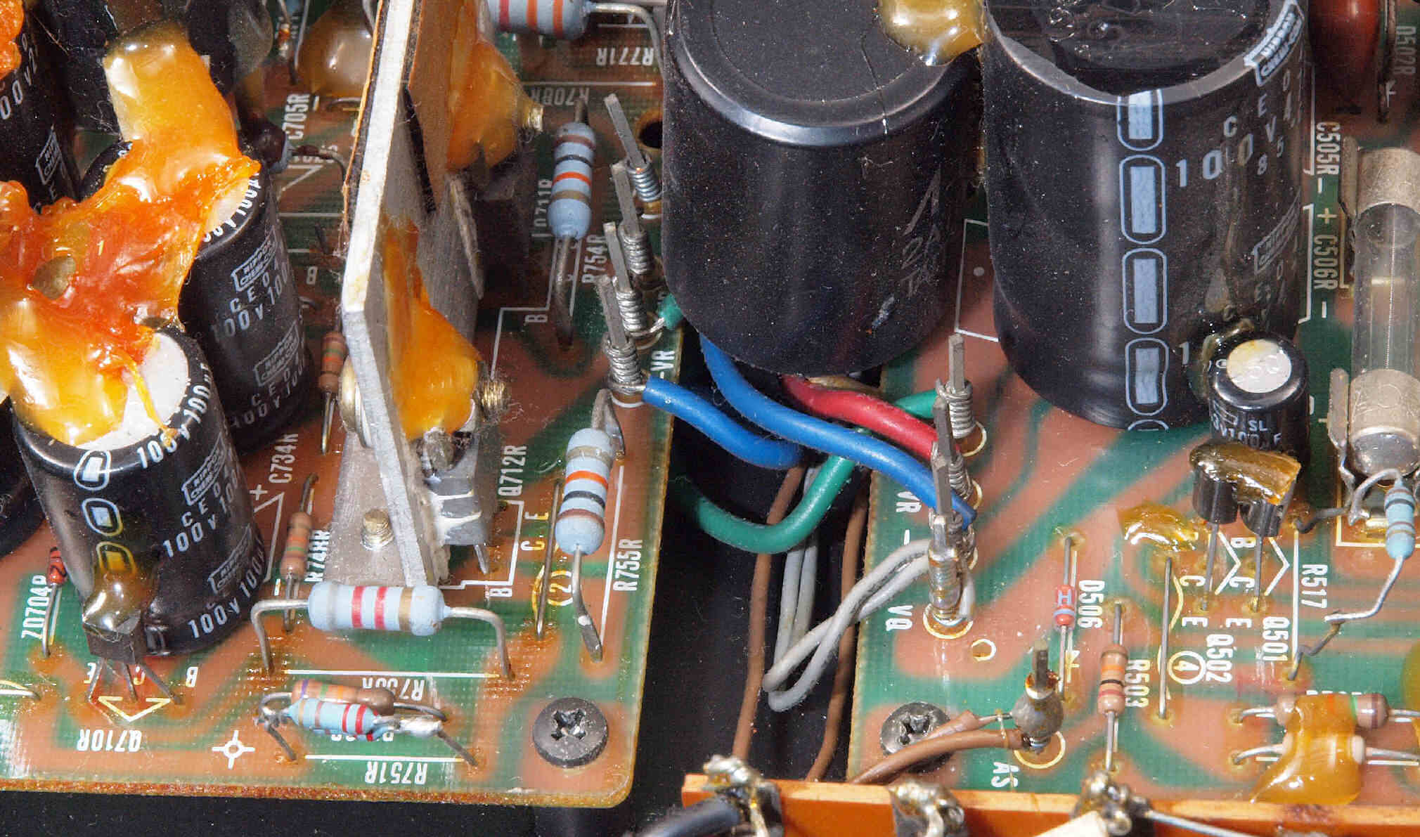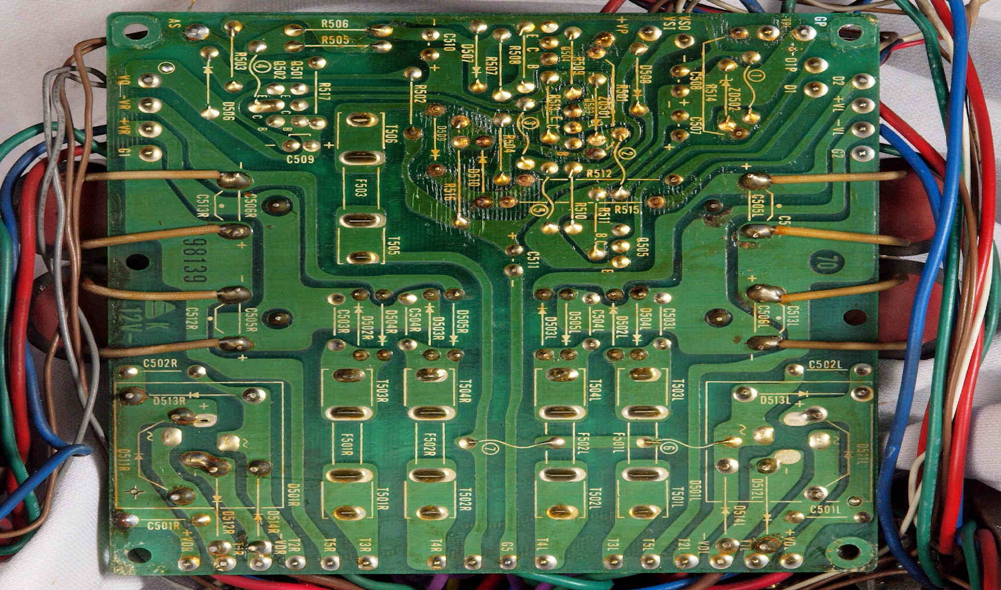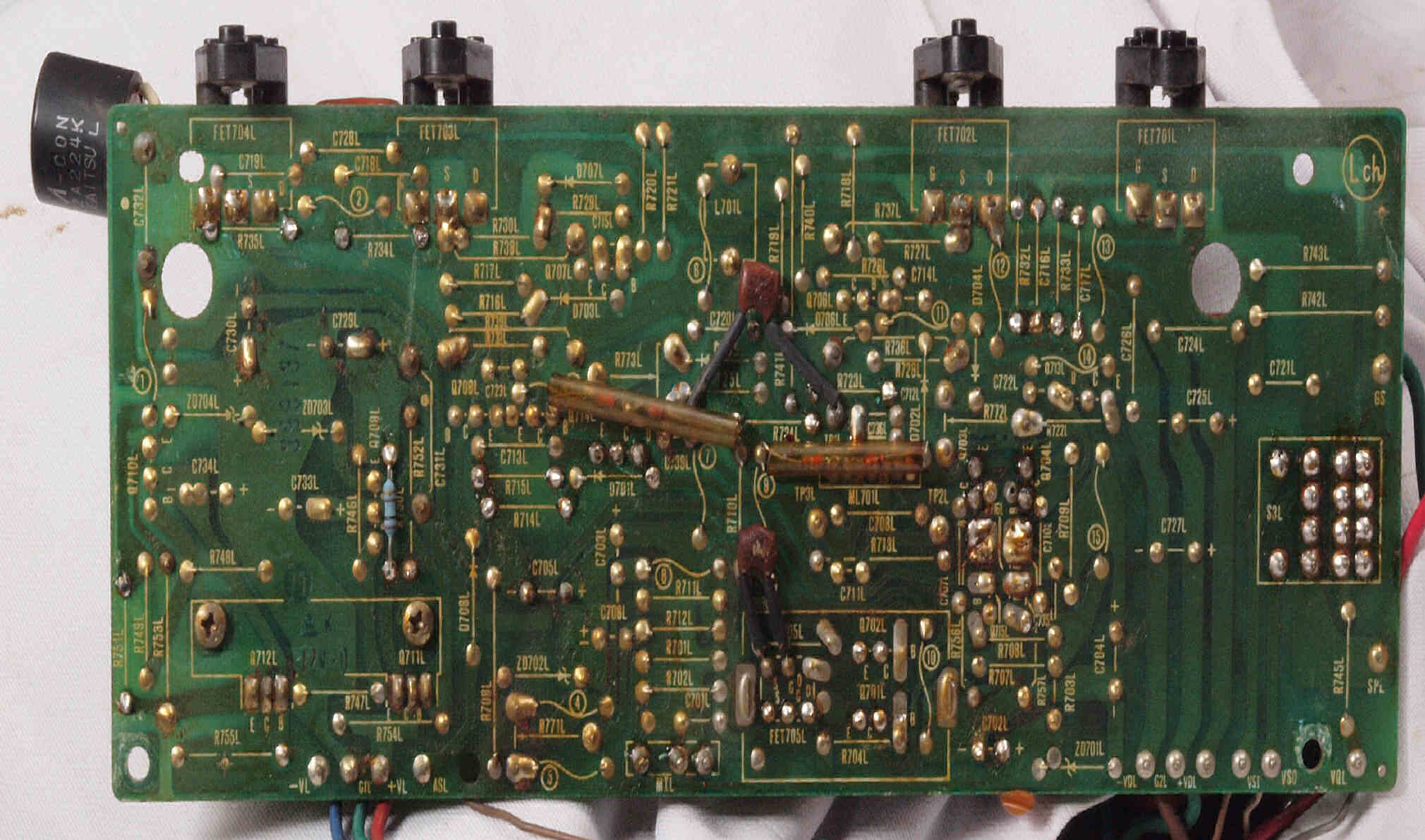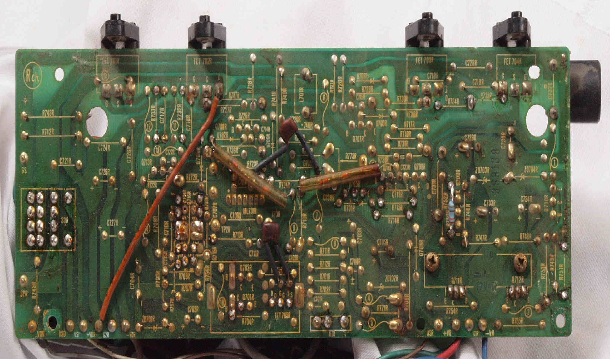 | C112. 修理前 R側ドライブ基板、 エポキシ系接着剤(アラルダイト)が多用されている。 トルエンでも溶解不可なので、剥離は大変で、基板や素子の破壊危険が伴う! |