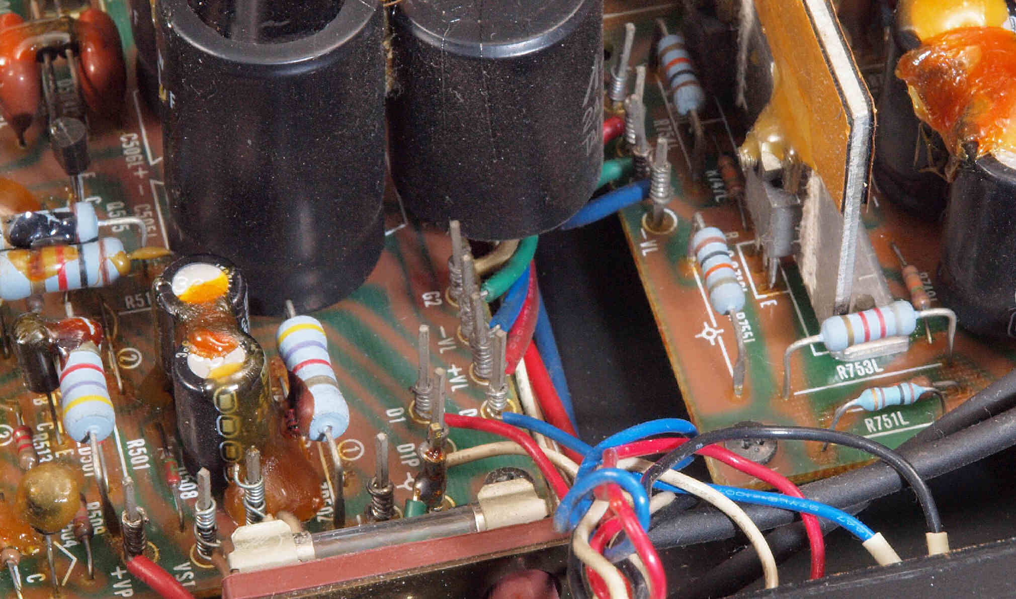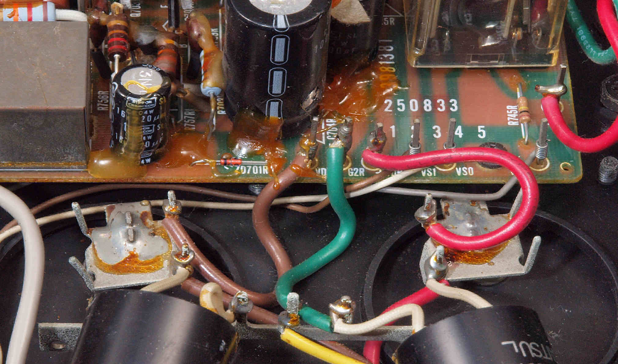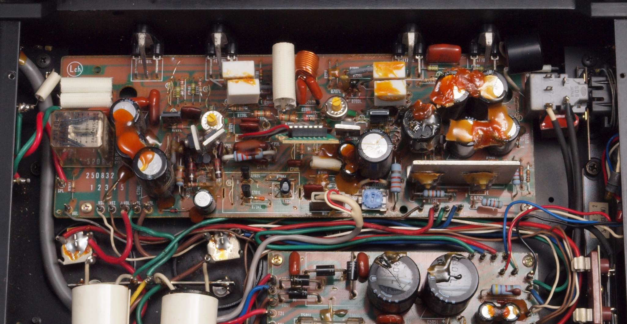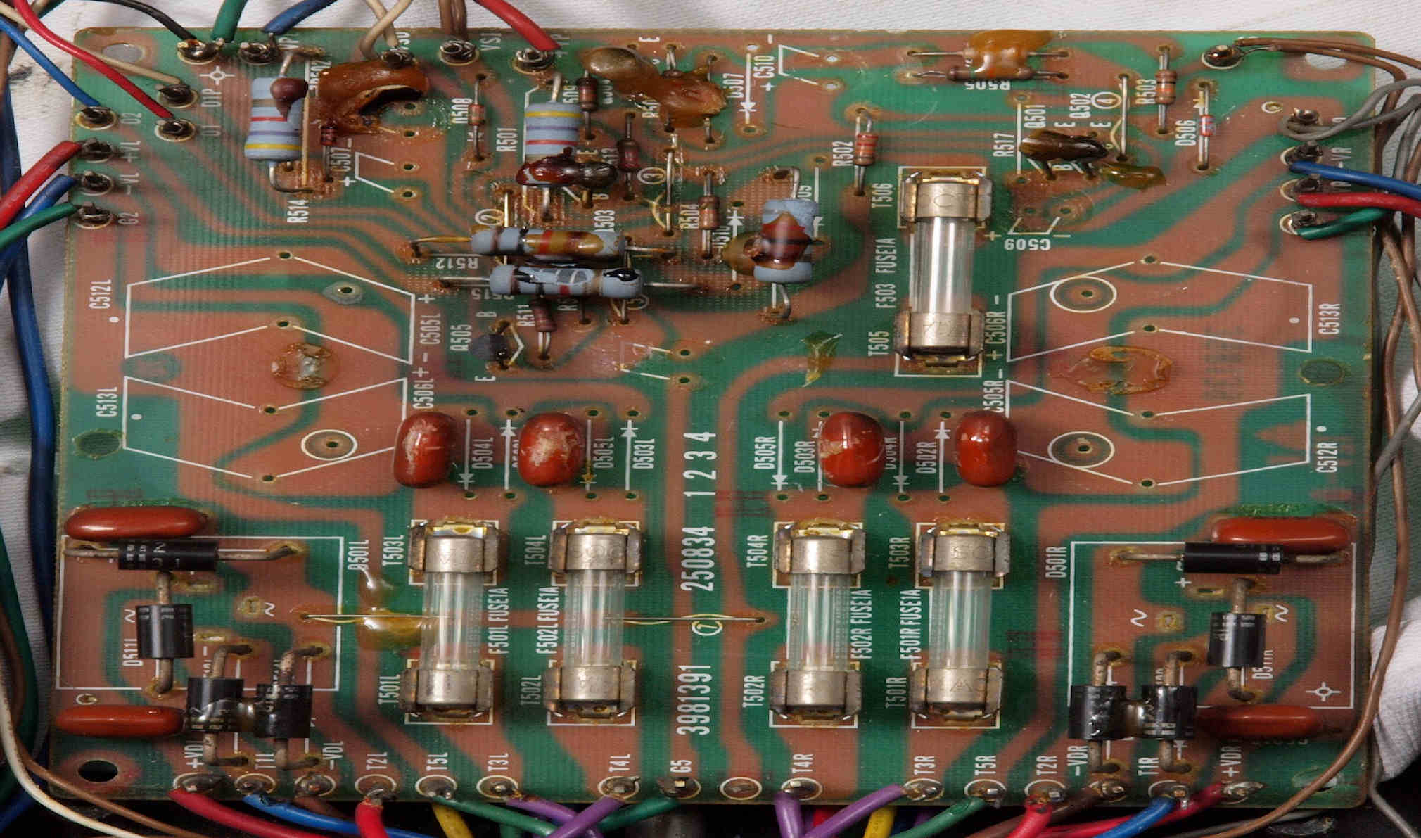 | C112. 修理前 R側ドライブ基板、 エポキシ系接着剤(アラルダイト)が多用されている。 トルエンでも溶解不可なので、剥離は大変で、基板や素子の破壊危険が伴う! |