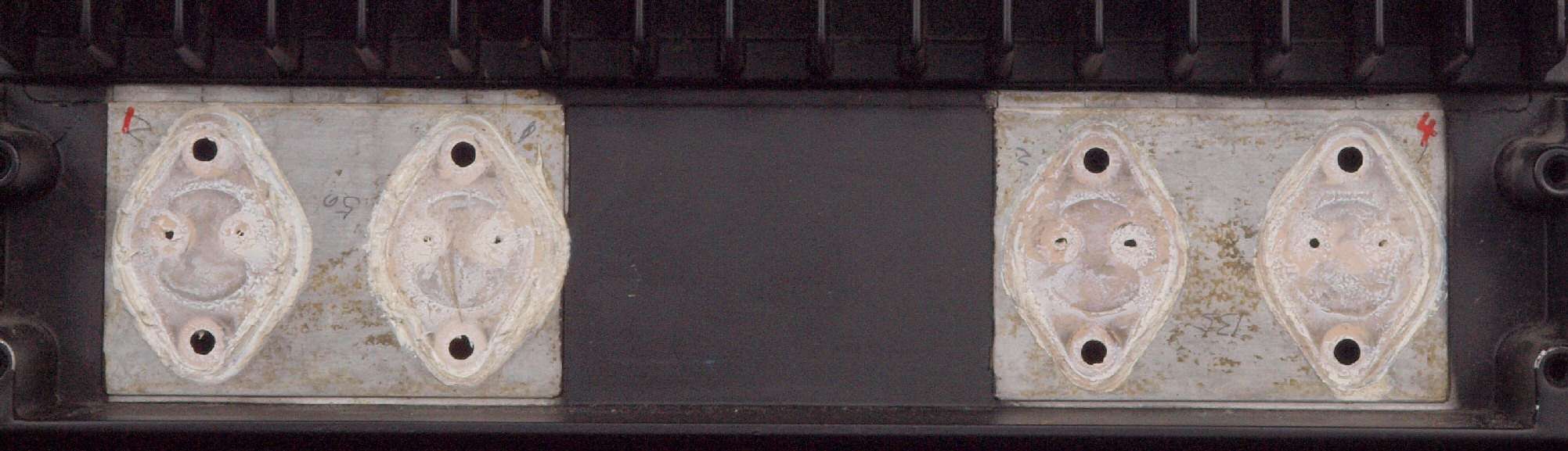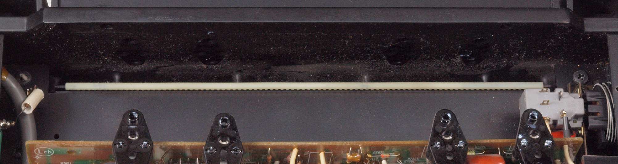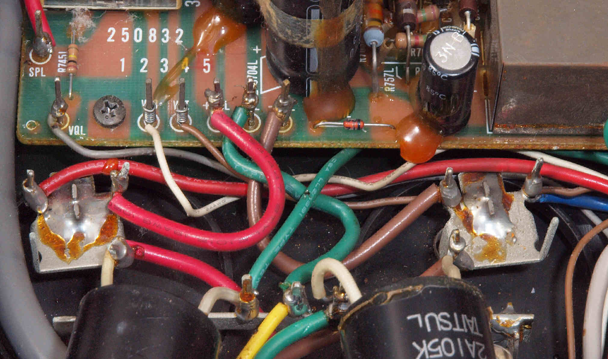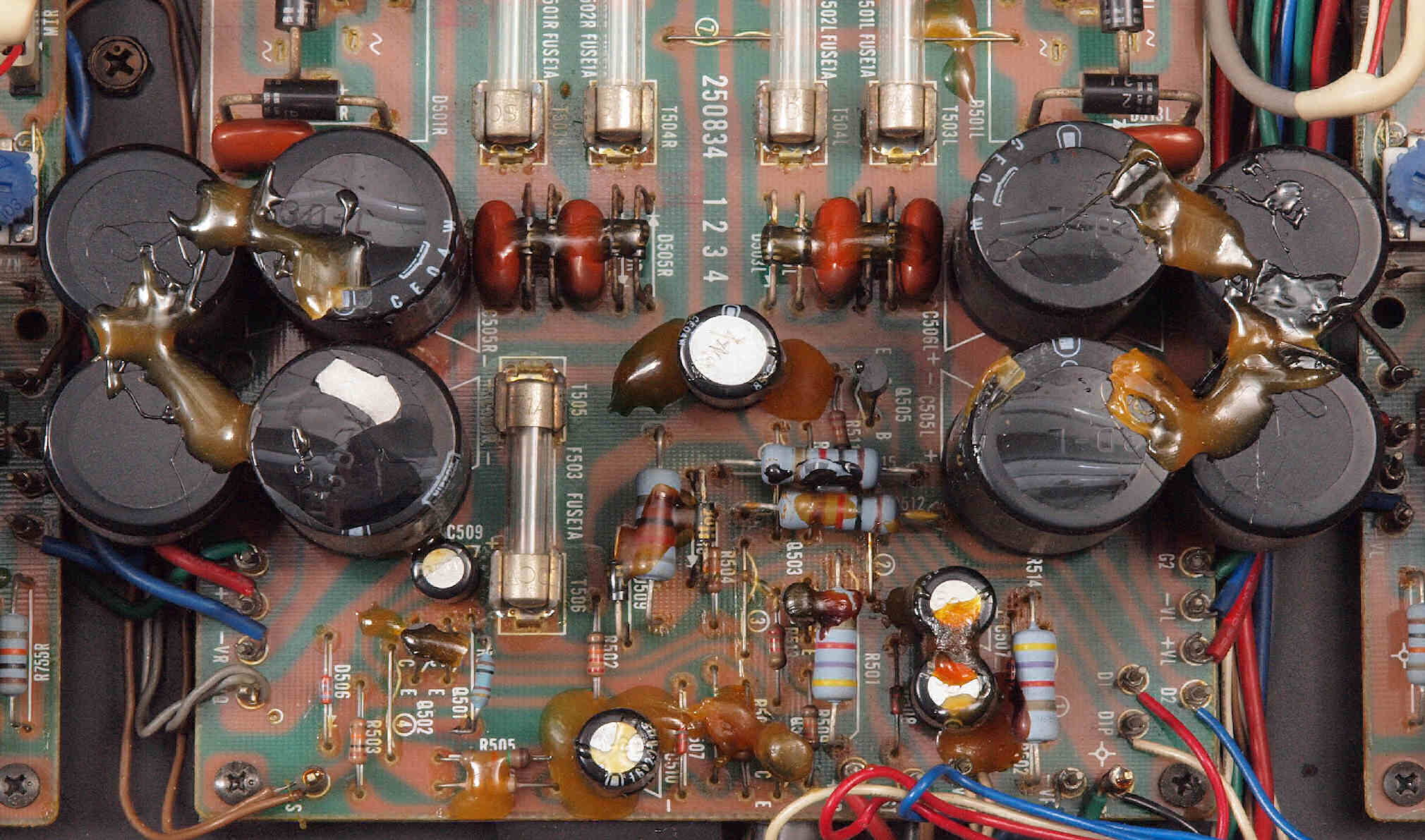 | C112. 修理前 R側ドライブ基板、 エポキシ系接着剤(アラルダイト)が多用されている。 トルエンでも溶解不可なので、剥離は大変で、基板や素子の破壊危険が伴う! |