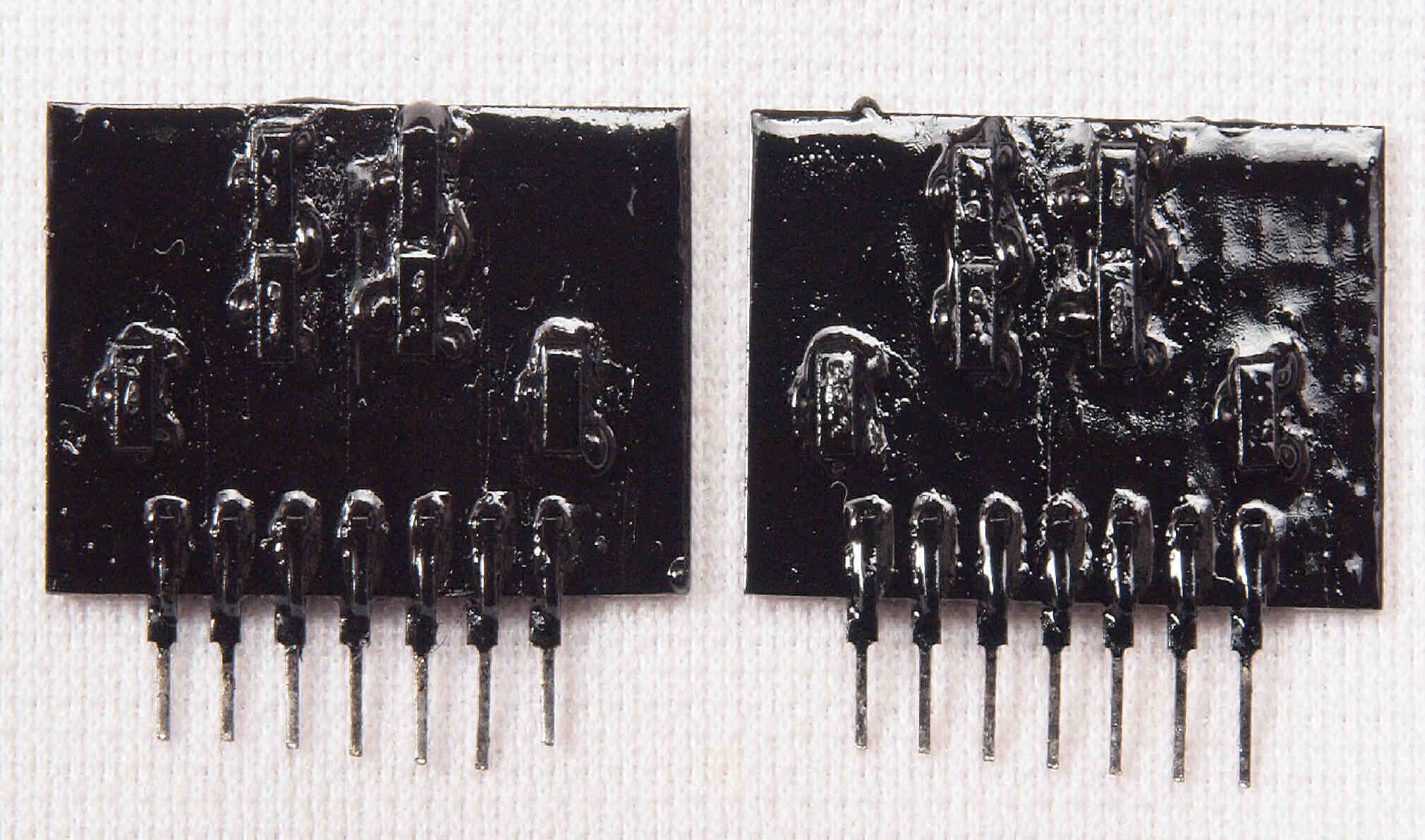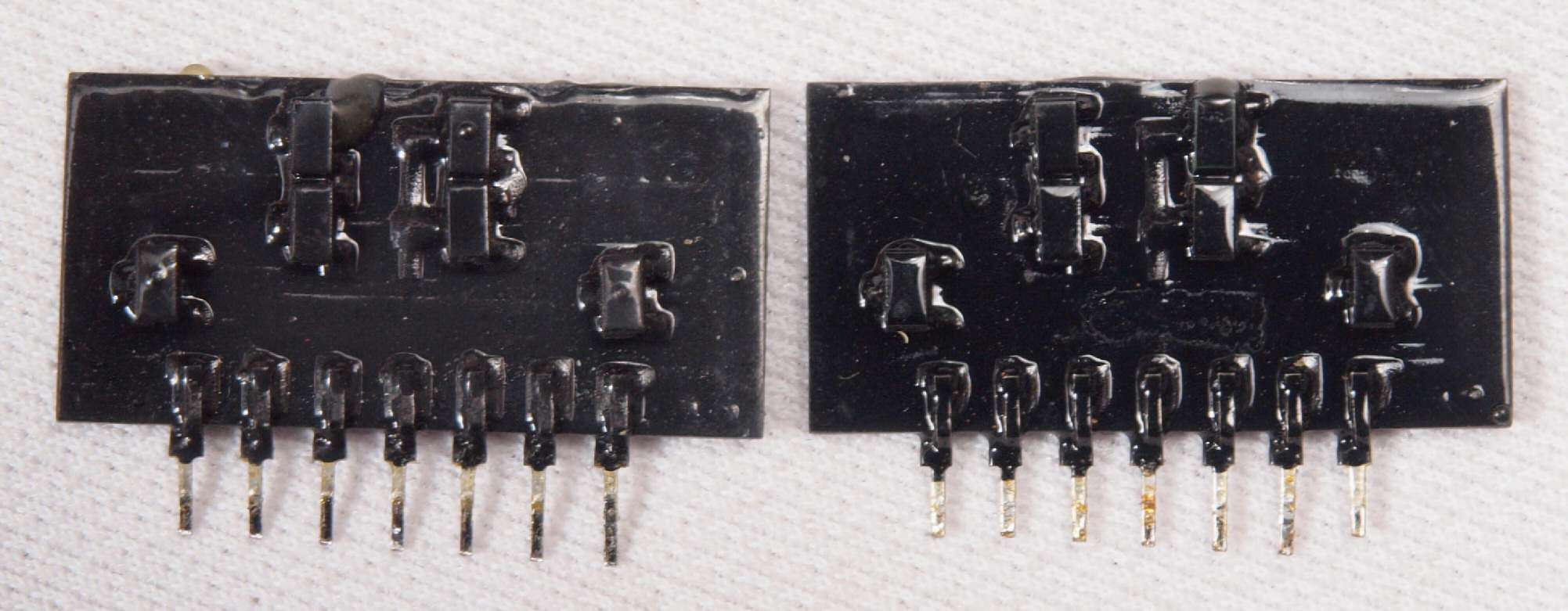 | C42. 修理前 RLモジュール裏、ここにもエポキシ系接着剤(アラルダイト)が付着している。 トルエンでも溶解不可なので、?離は大変で、基板や素子の破壊危険が伴う!。 |