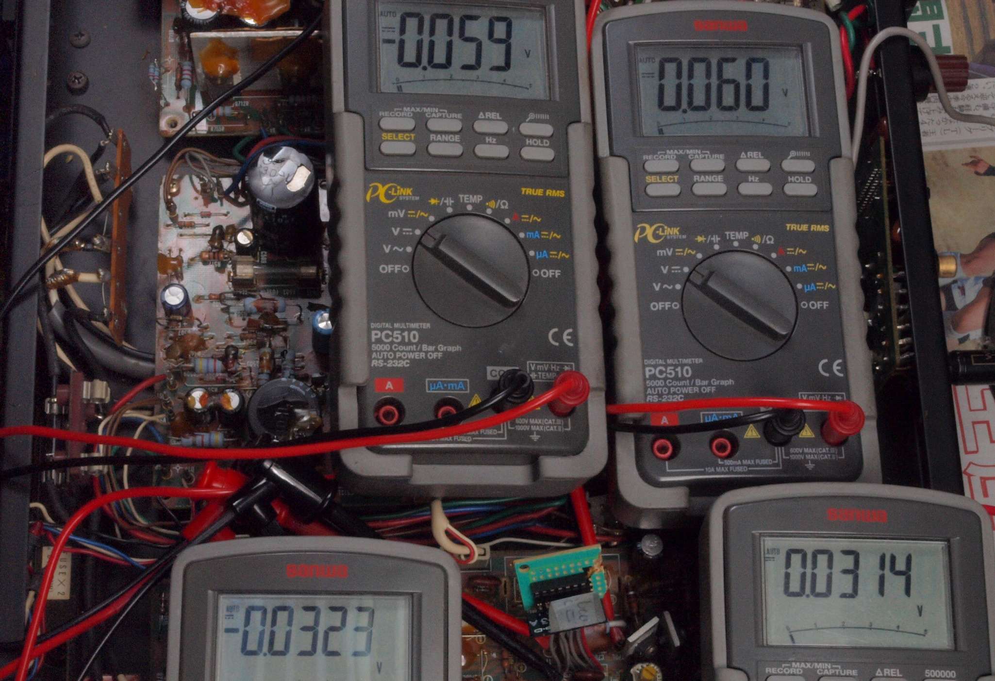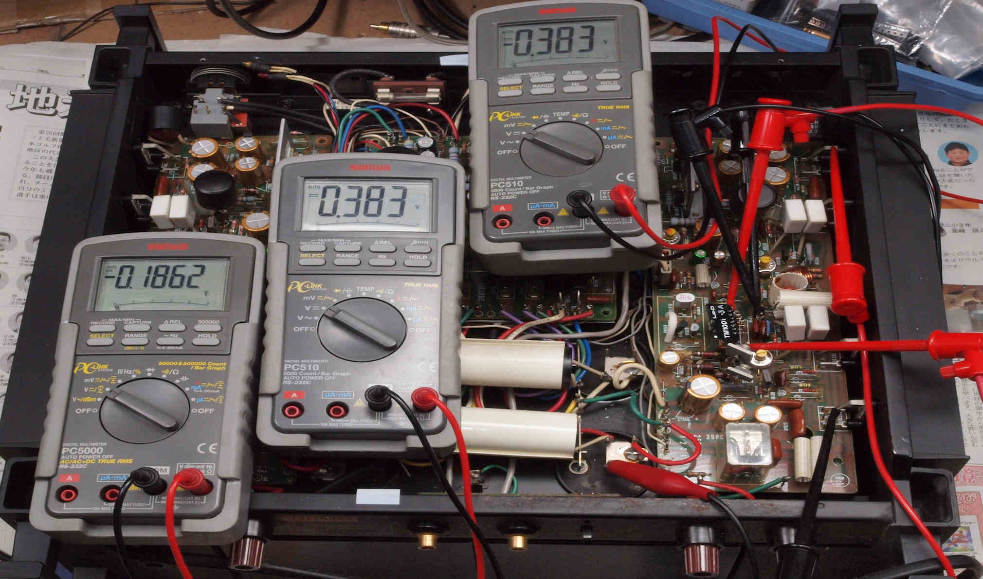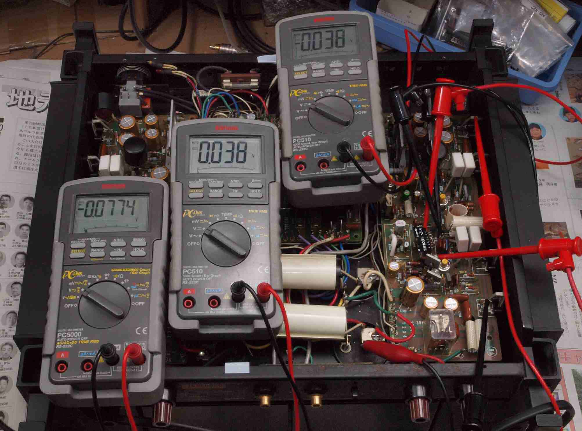 | M. 故障機器のモジュール修理。 画像をクリックすると、大きく(横幅2050ドット)表示されます。 M1. 他の修理品のモジュール検査・修理・調整中。 +−終段FET(電界効果トランジスター)へのバイアス電圧=+38mV/−38mV、半固定VRを同位置にて、左右同値。 |
