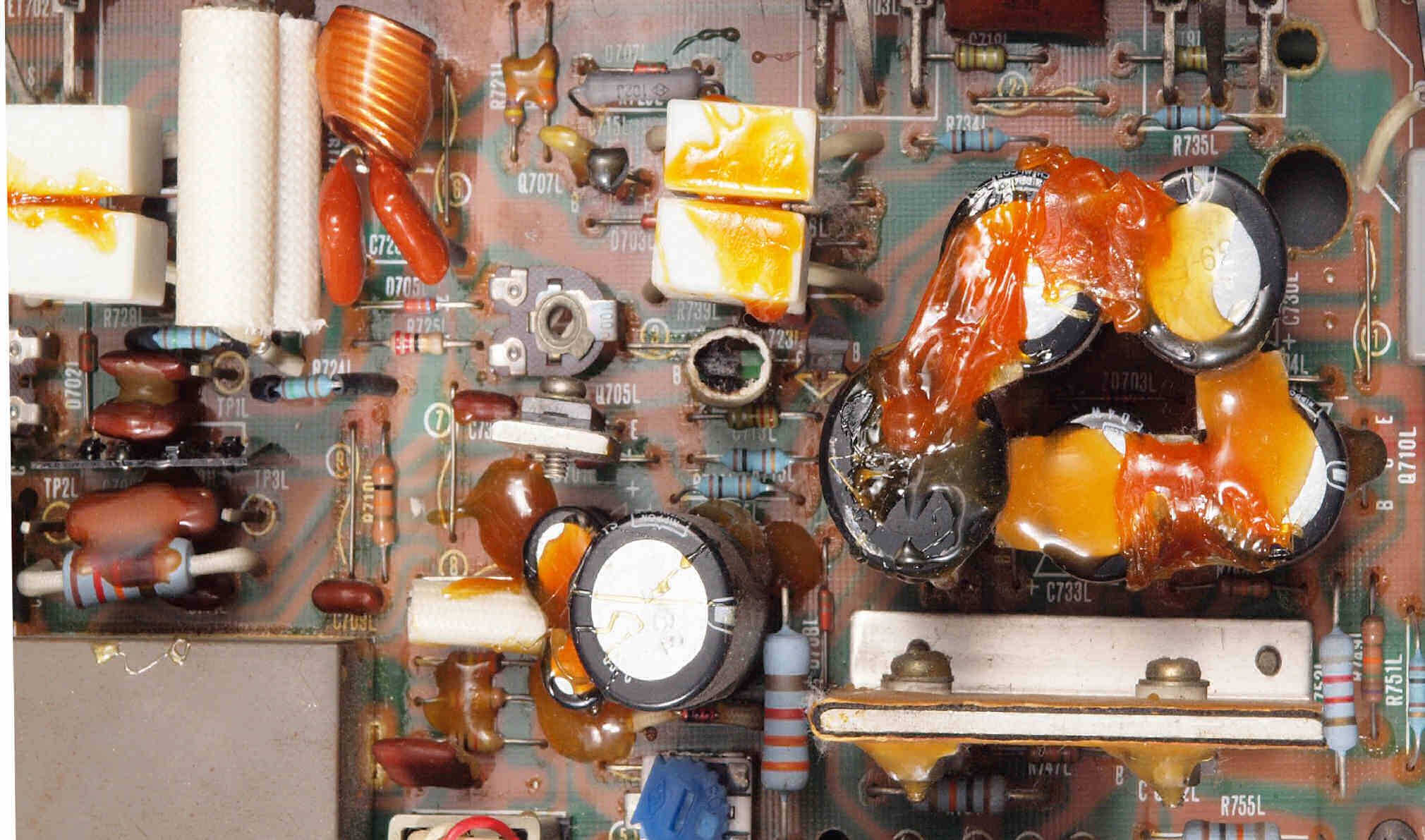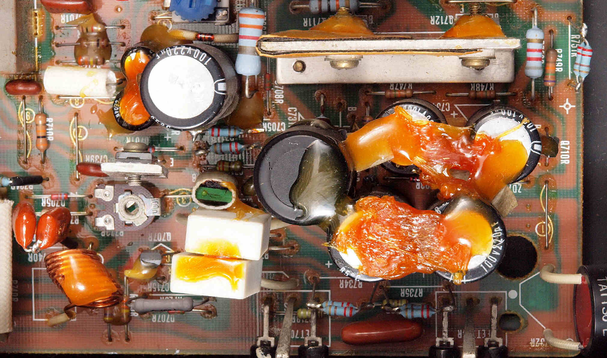 | C512. 修理前 電源基板、 エポキシ系接着剤(アラルダイト)が多用されている。 トルエンでも溶解不可なので、?離は大変で、基板や素子の破壊危険が伴う! |