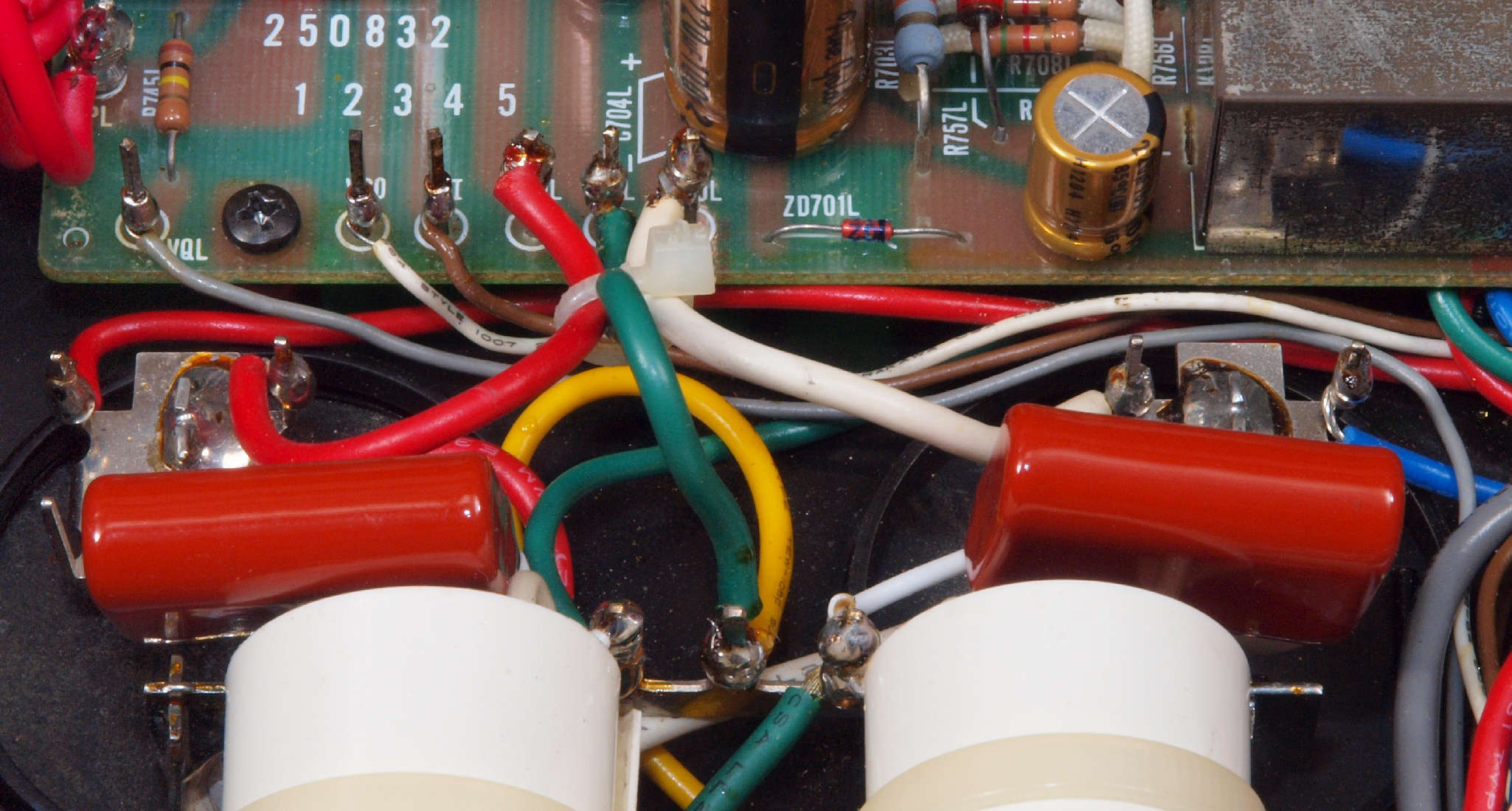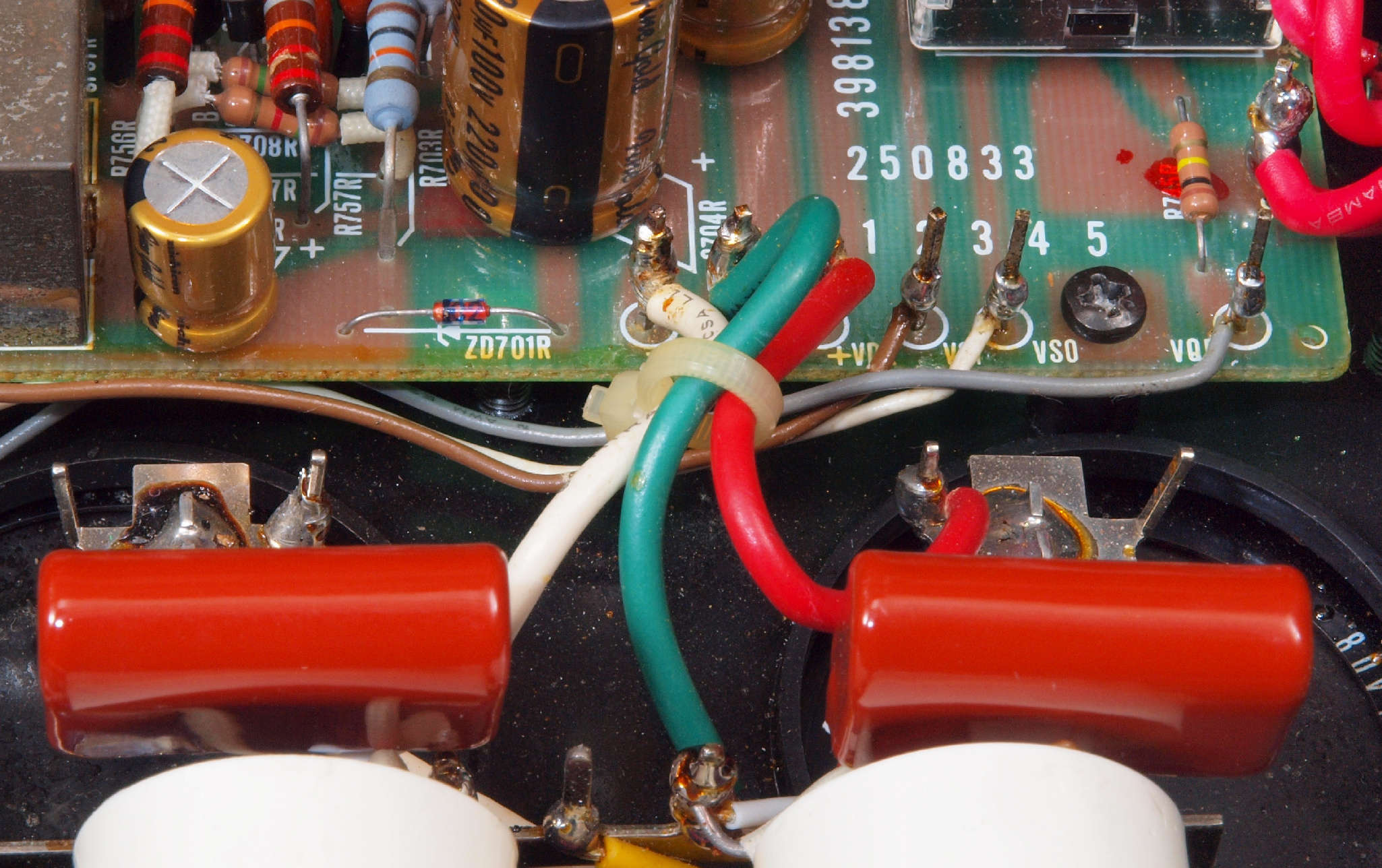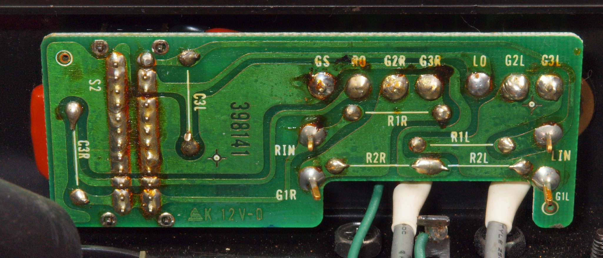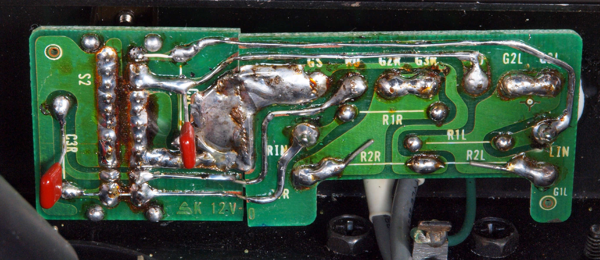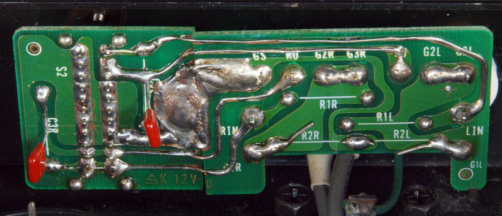 | C67. 修理(半田補正)後 RCA端子基板裏 半田を全部やり直す フイルムコンデンサー2個増設 |