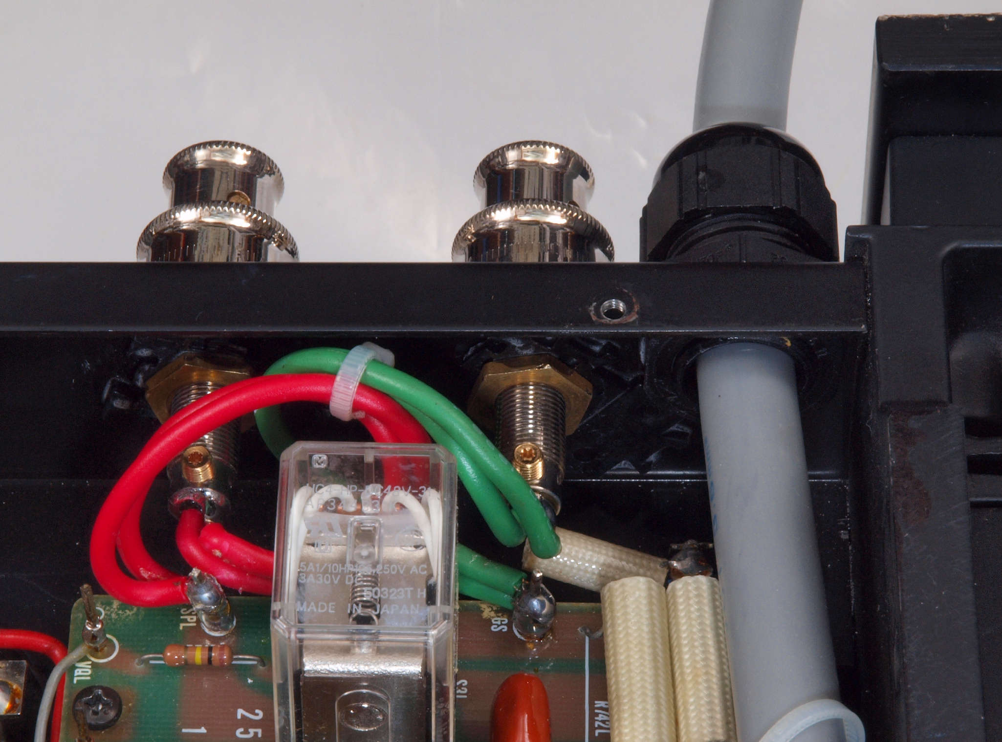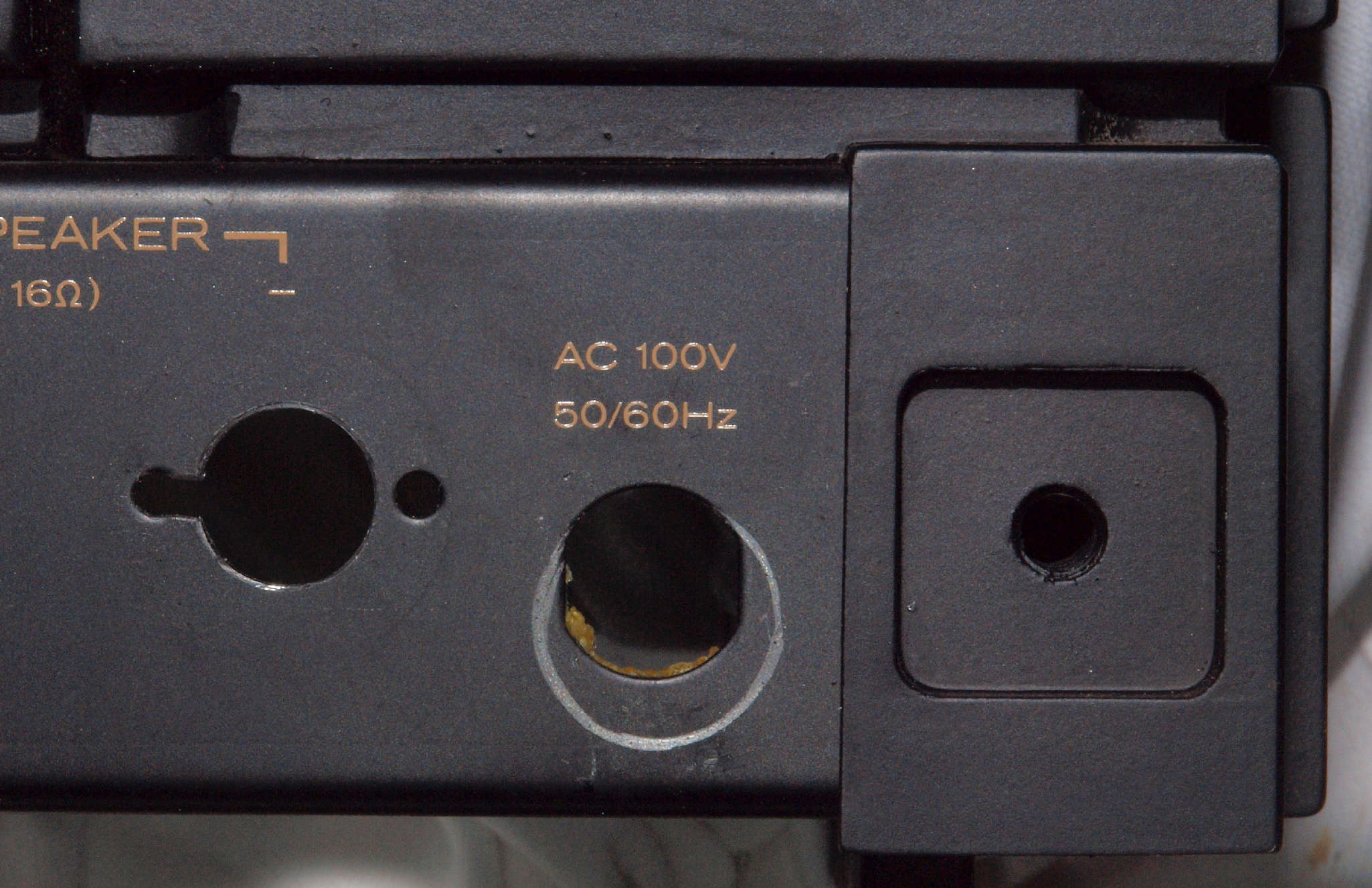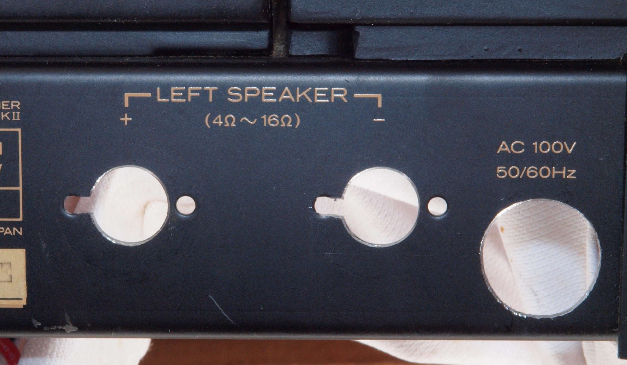 | C92. 修理中 電源ケーブル取り付け部穴加工前。 SP接続端子との距離を取る為に、下右方向へ広げる為、昔ながらのヤスリで削る。 |