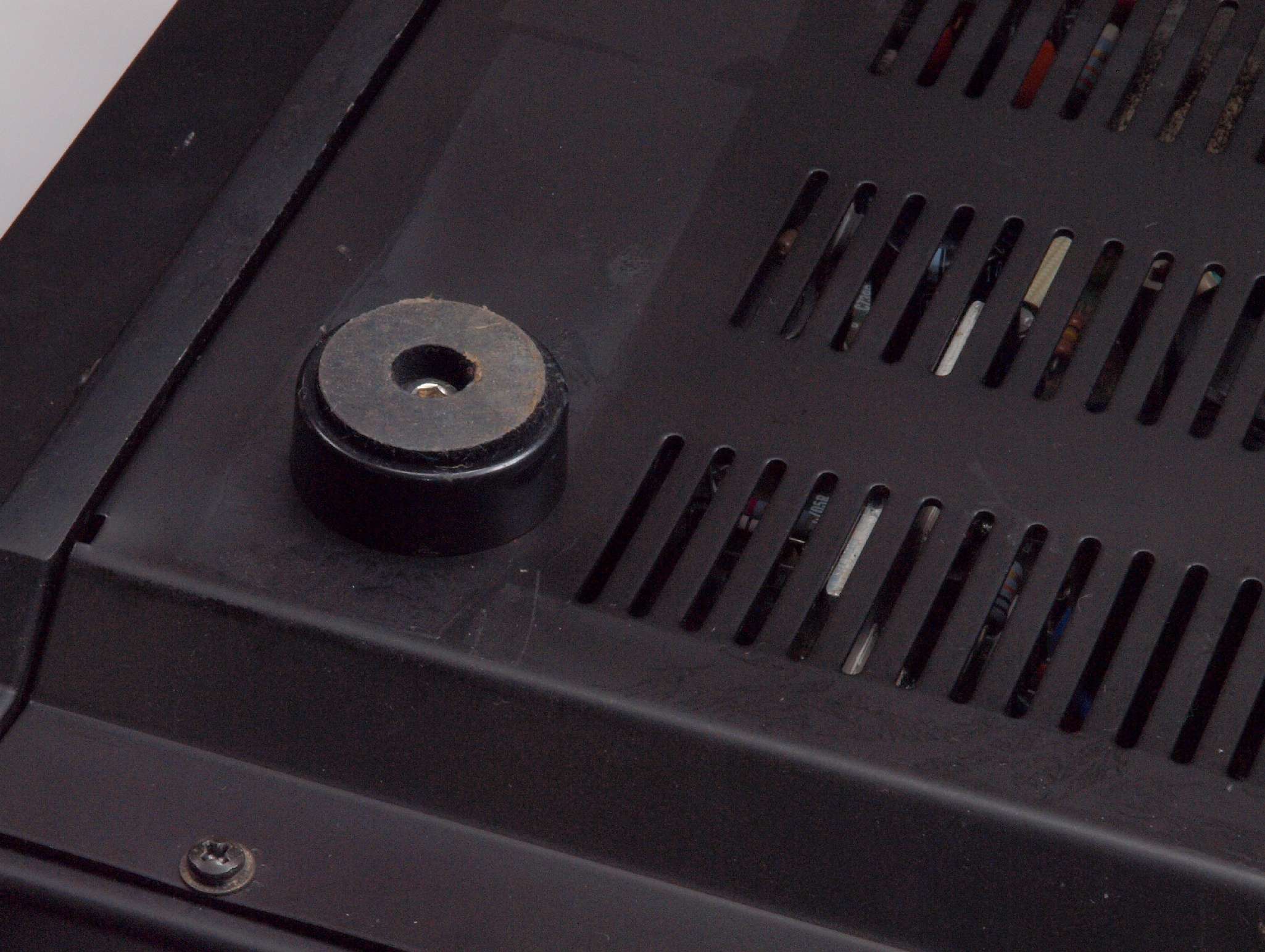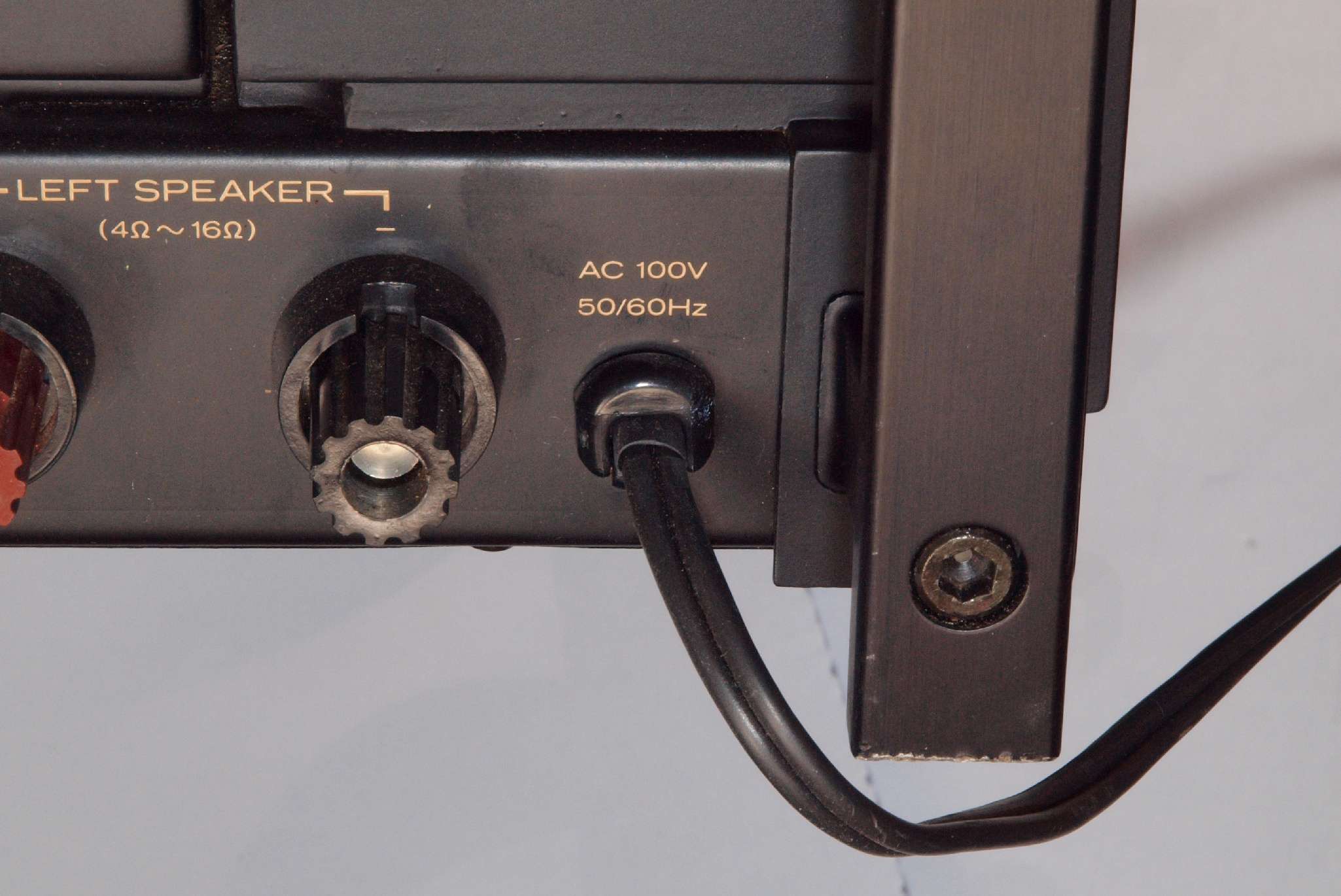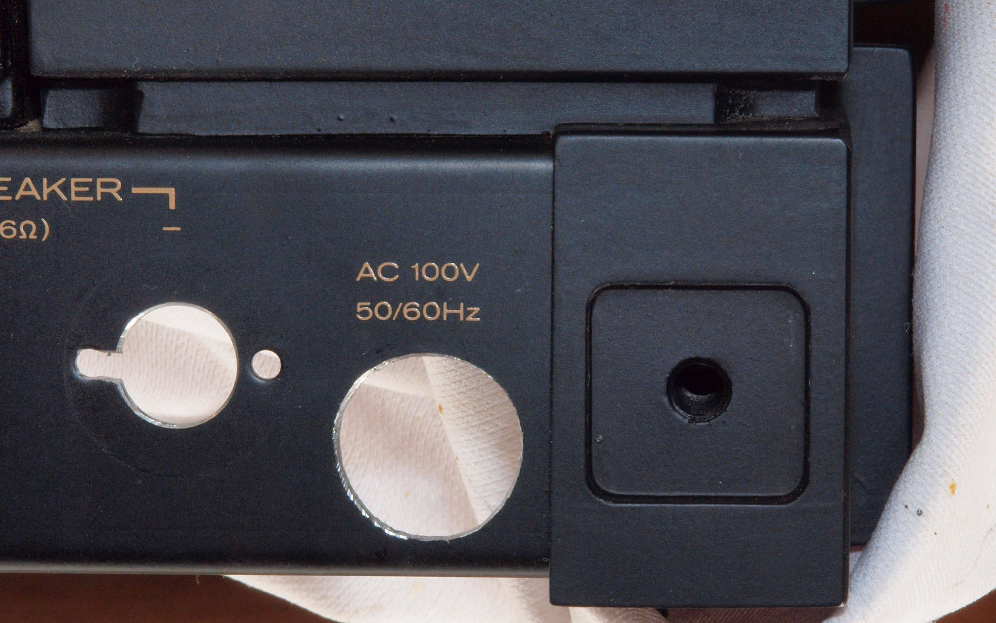 | C92. 修理中 電源ケーブル取り付け部穴加工前。 SP接続端子との距離を取る為に、下右方向へ広げる為、昔ながらのヤスリで削る。 |