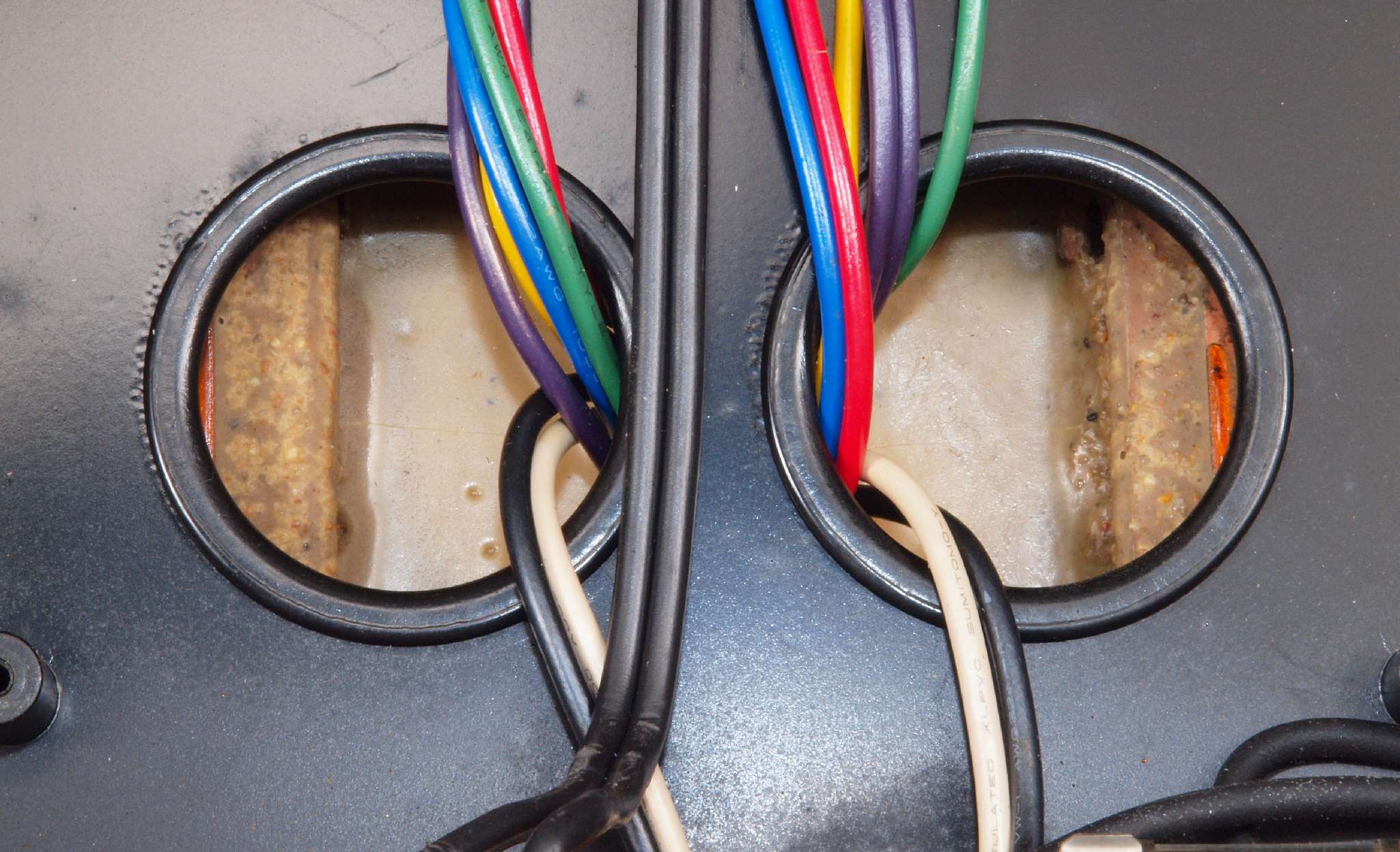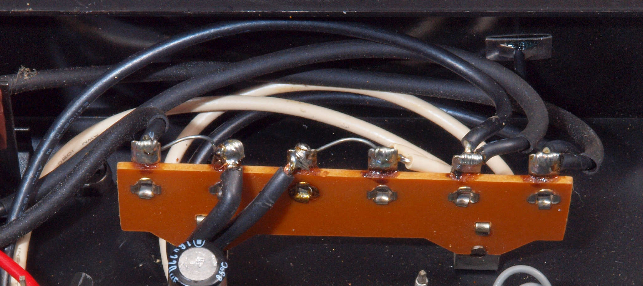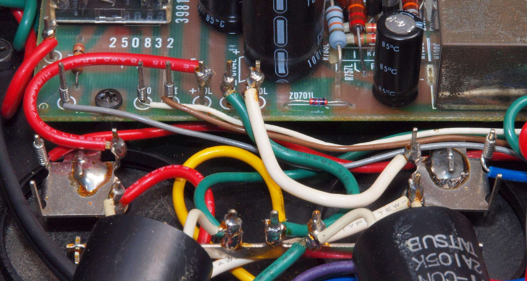| C85. 修理前 L−SP端子裏配線。 電源コードが接着材で固定? |
