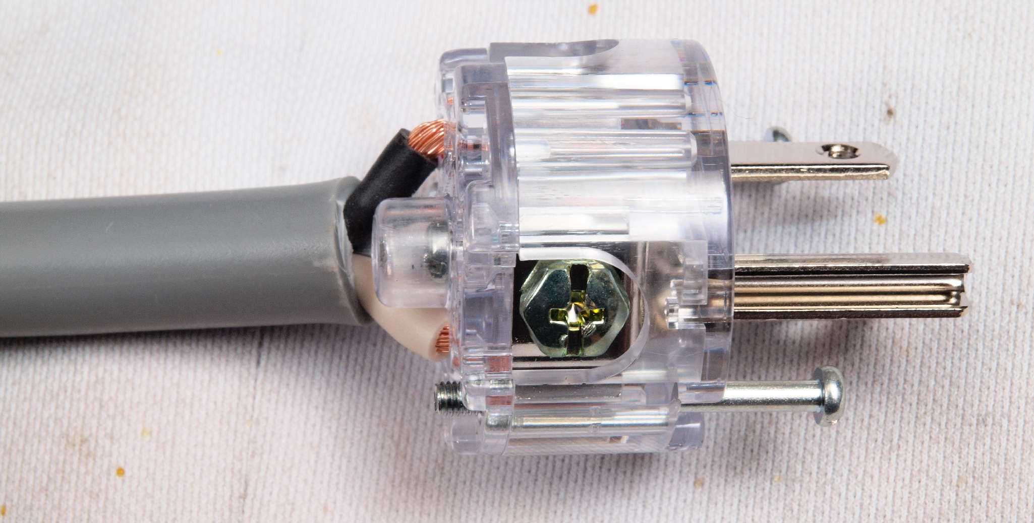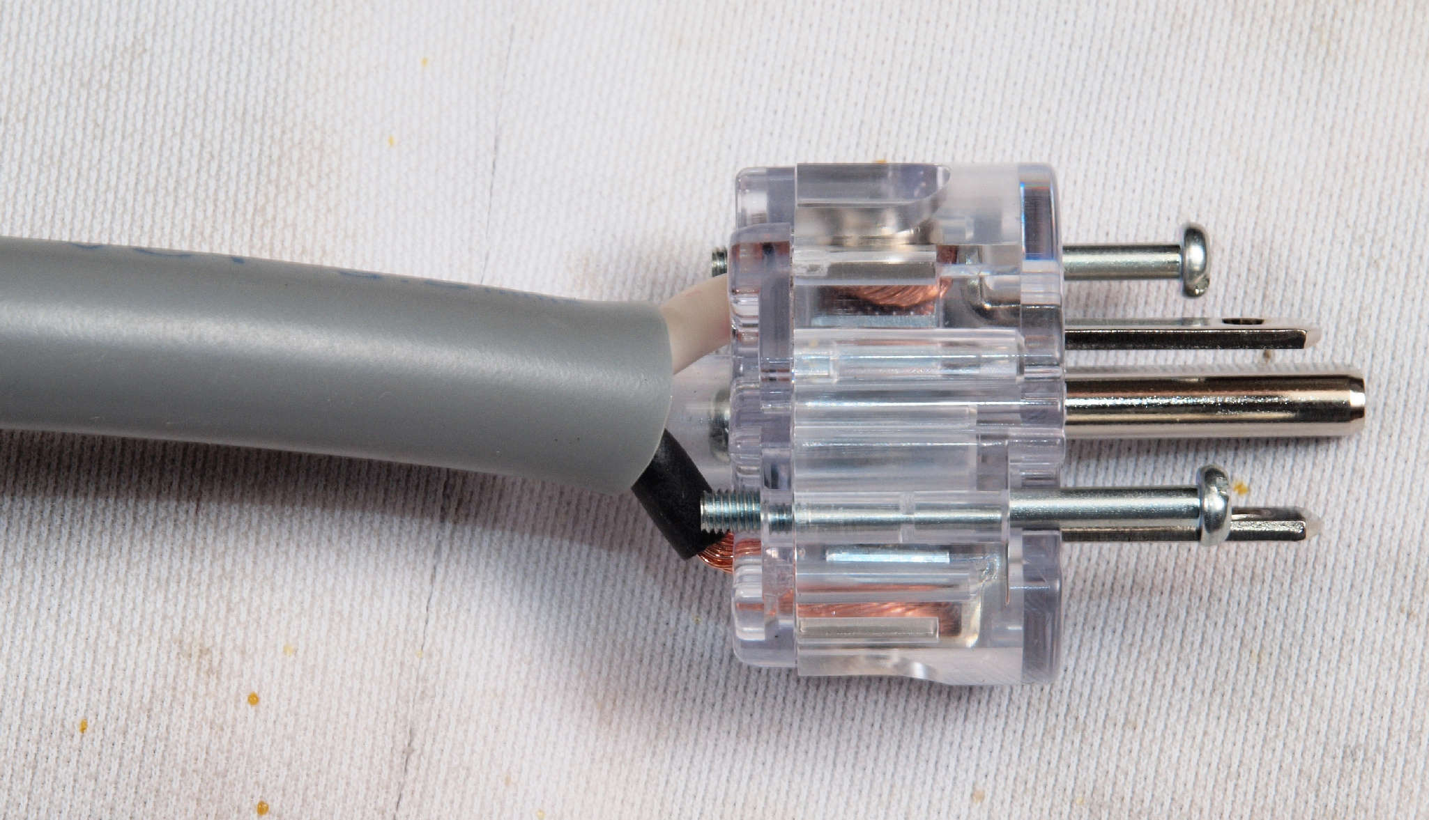 | C99. 修理中 3Pプラグにケーブル取り付。 差し込み固定が一般ですが、時計方向に巻き付けると良い。 上のK線=巻き付いた端側、 下の白線=挿入した側。止めビスは未締結です。 これで差し込み固定の3倍位接触面積が増し、接触抵抗が低くなる。 |