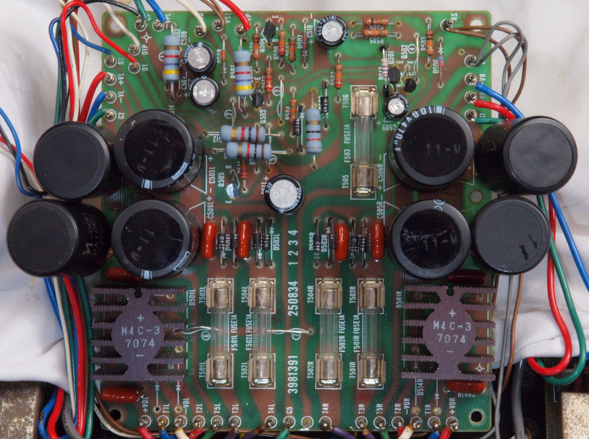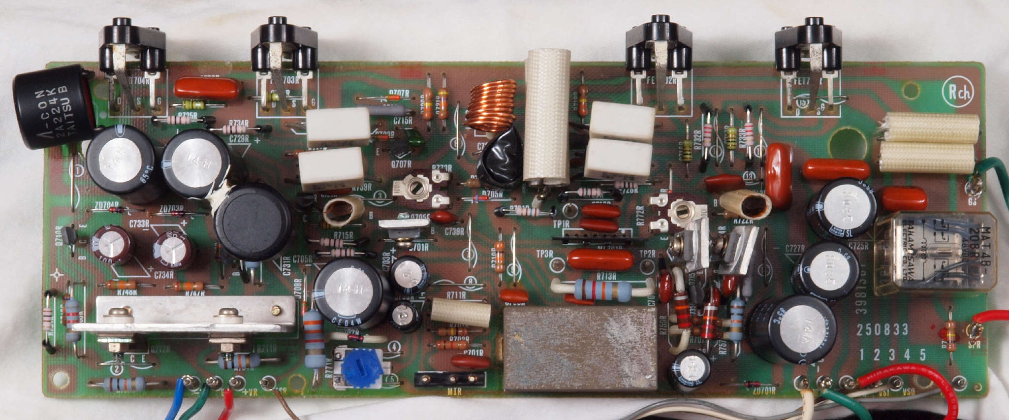 | C12. 修理後 R側ドライブ基板 初段FET、バランス・バイアス調整用半固定VR3個、SP接続リレー交換 ヒューズ入り抵抗全部、電解コンデンサー11個交換。 |