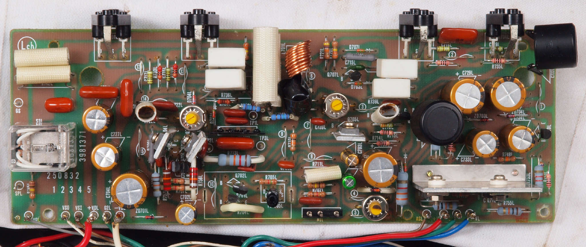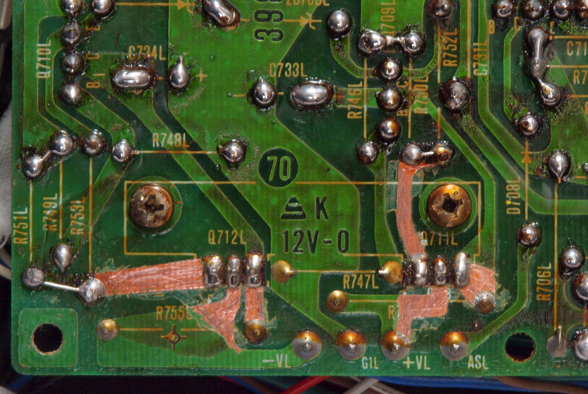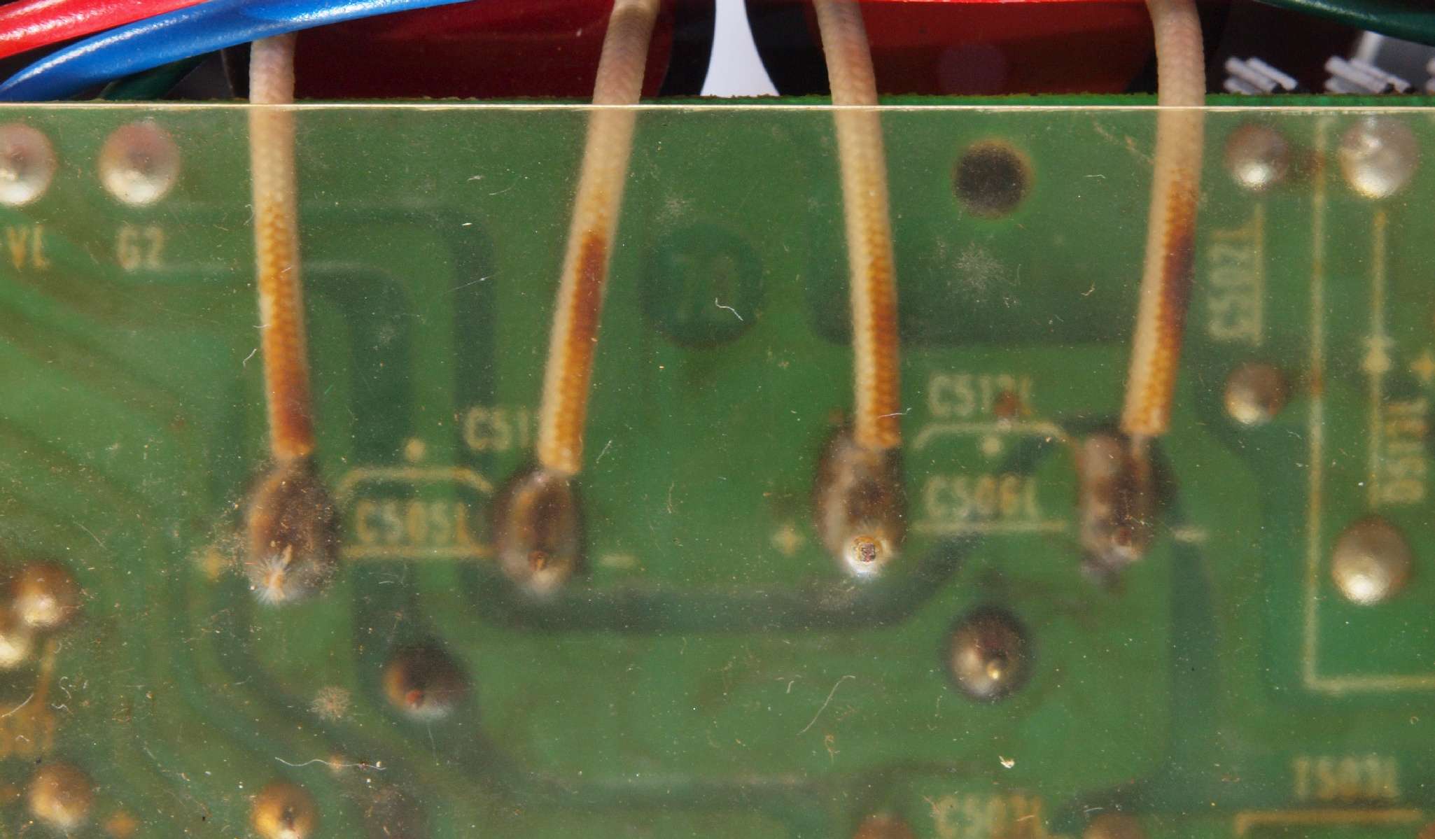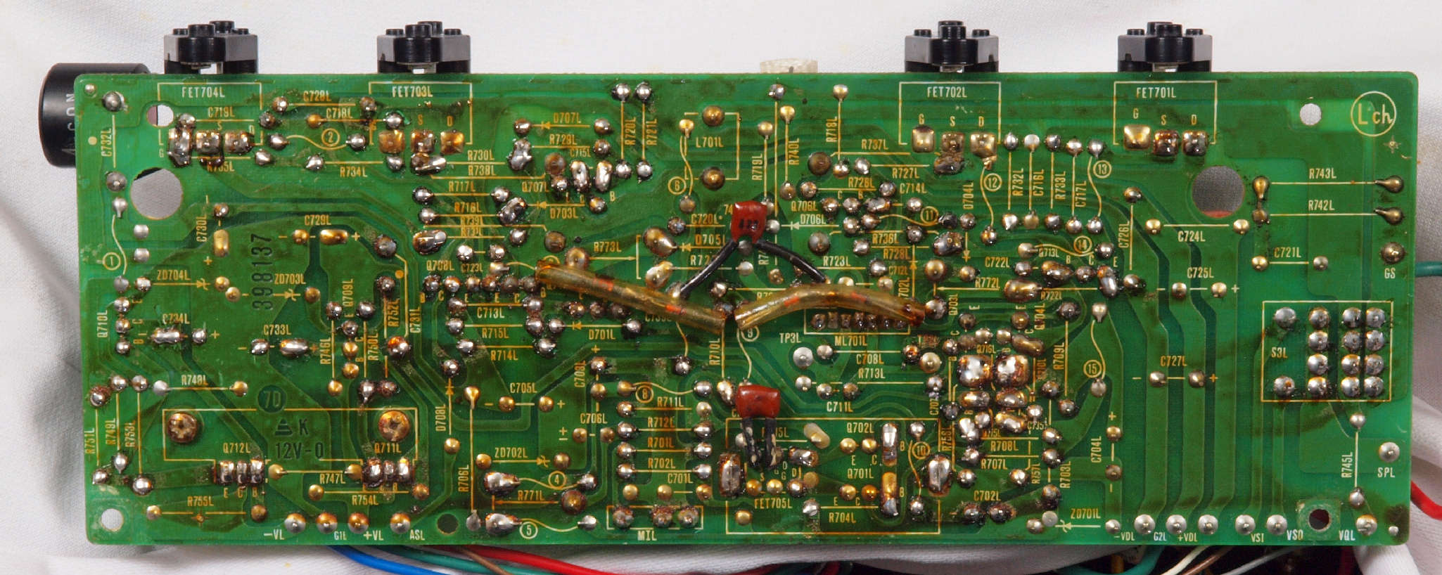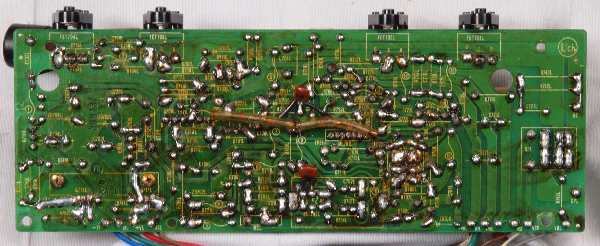 | CA32. 修理中 L側ドライブ基板へのラッピング線。 ヒゲが出ている! |