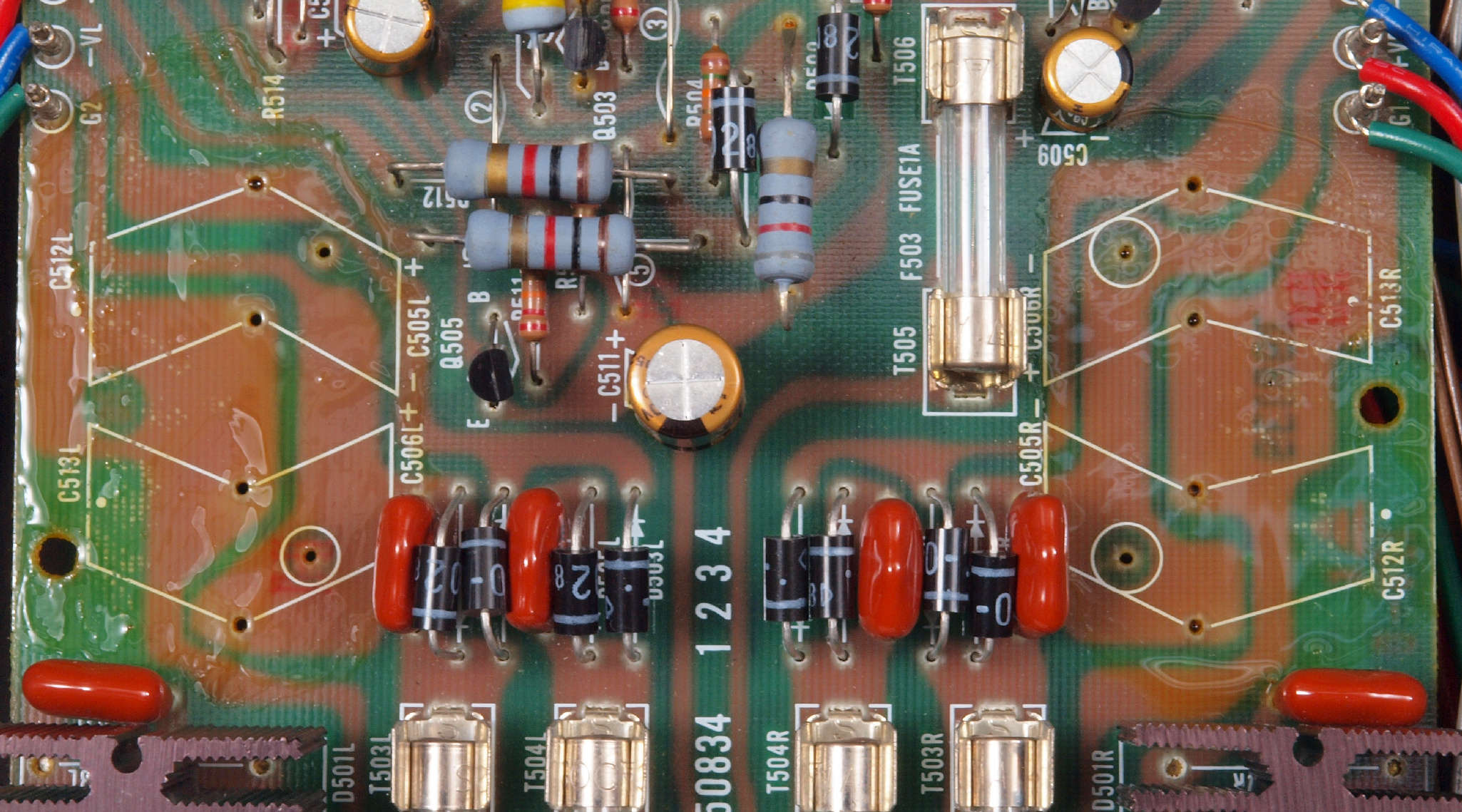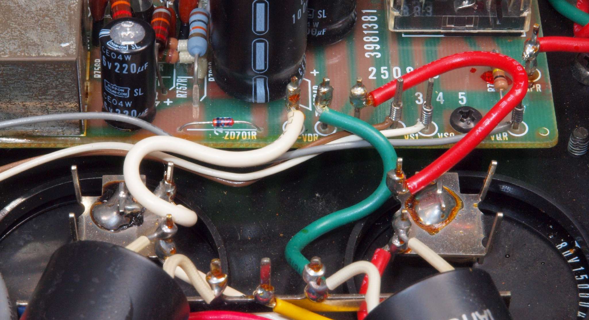 | CA6. 修理後 R側ドライブ基板−電源基板へのラッピング線に半田を浸み込ませる |