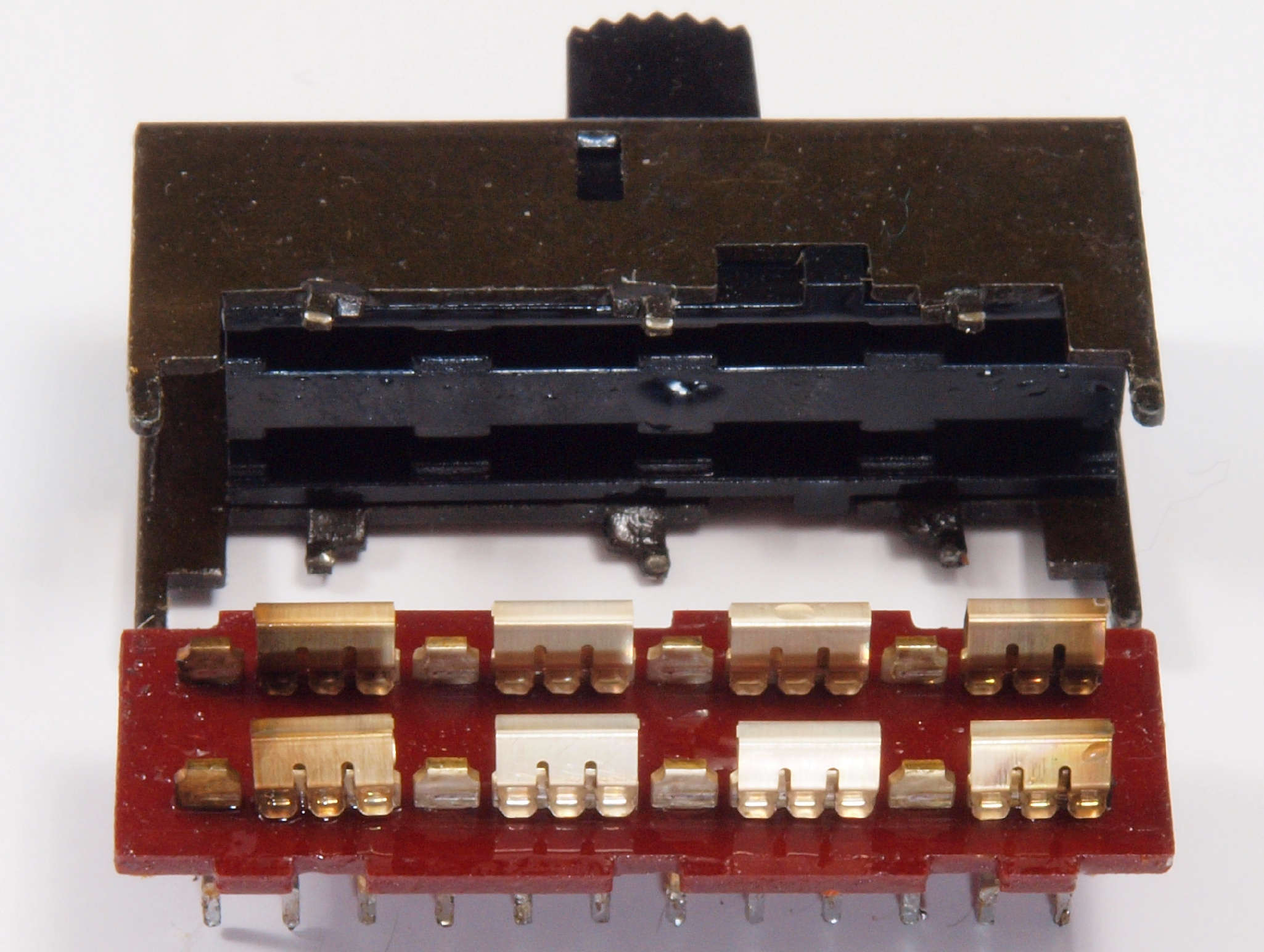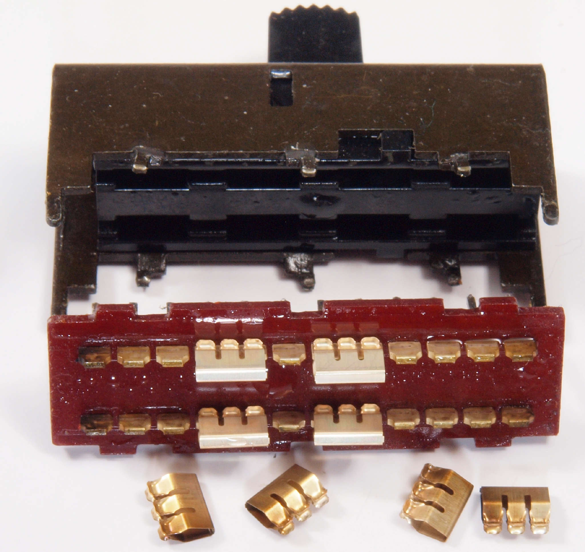 | C6B. 修理中 RCA端子基板の切り換えSW分解。 使用するのは端の1回路のみ、内側の綺麗な接触子と交換して組む。 |