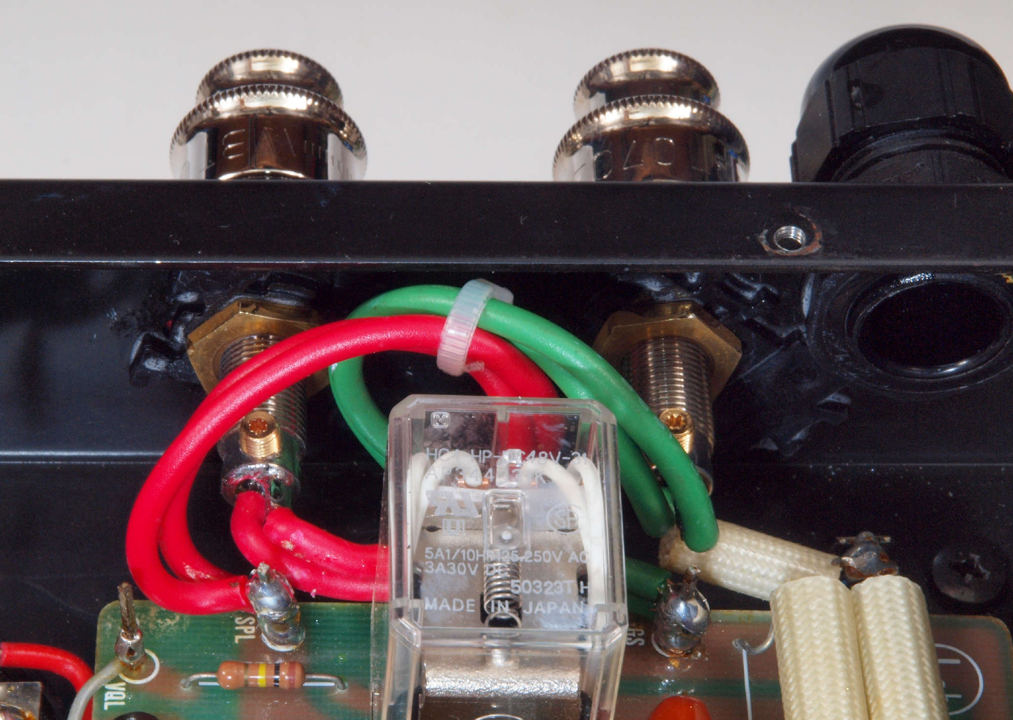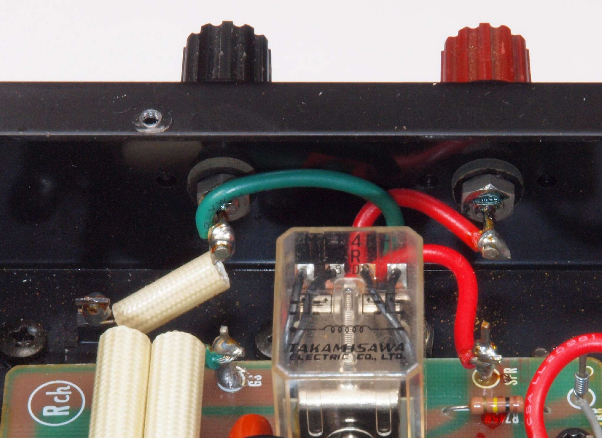 | C76. 修理後 R−SP端子裏配線。 WBTのネジ止めを生かし、ネジ止め接続+半田接続のW配線にした。理由はこちら |