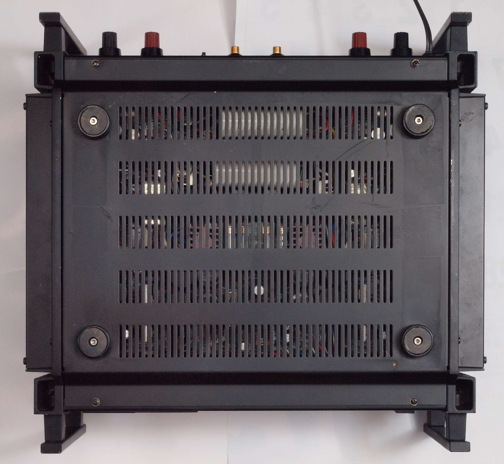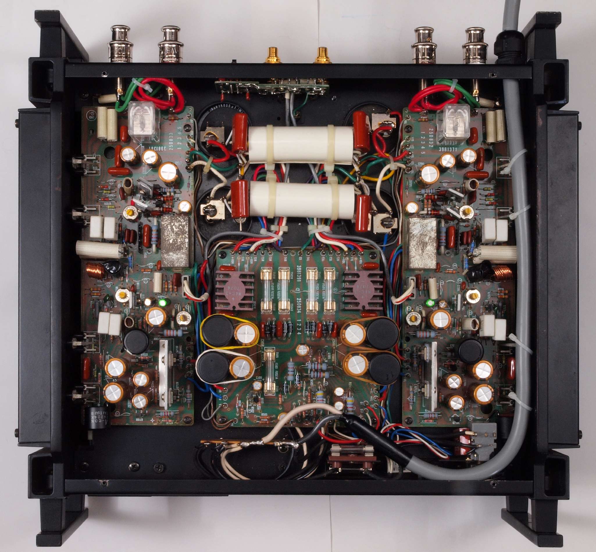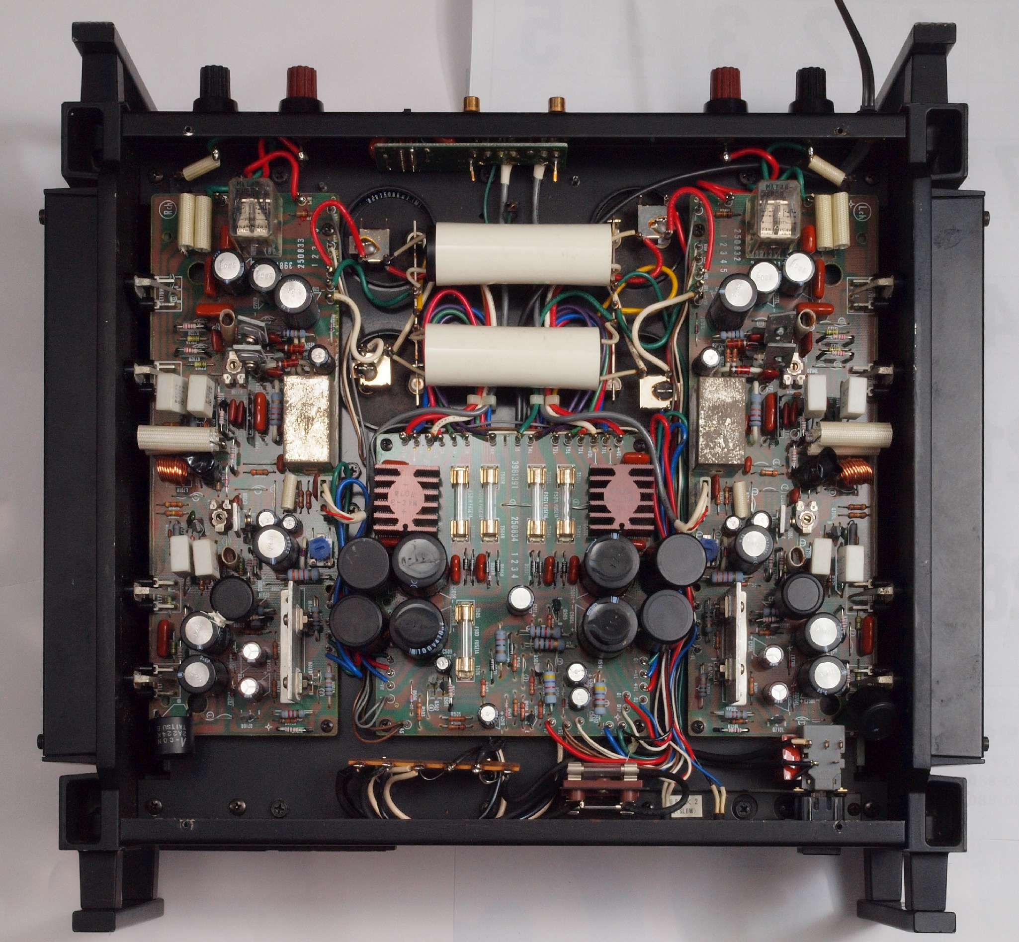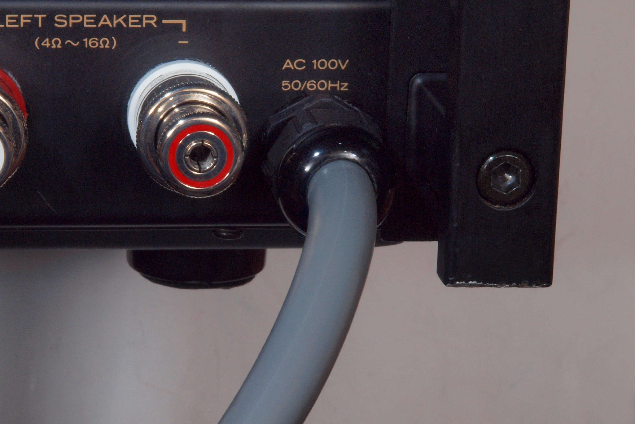 | 注意 このAMPはアースラインが浮いています。 AMPのシャーシにSPの線(アース側)やプリAMPのアースもも接続してはいけません。 RL−SPのアース線も接続(共通)してもいけません、+−の撚りのあるのも使用出来ません。 又、DC(directconnection)入力が可能ですが、絶対に使用しないこと=ここ参照 |