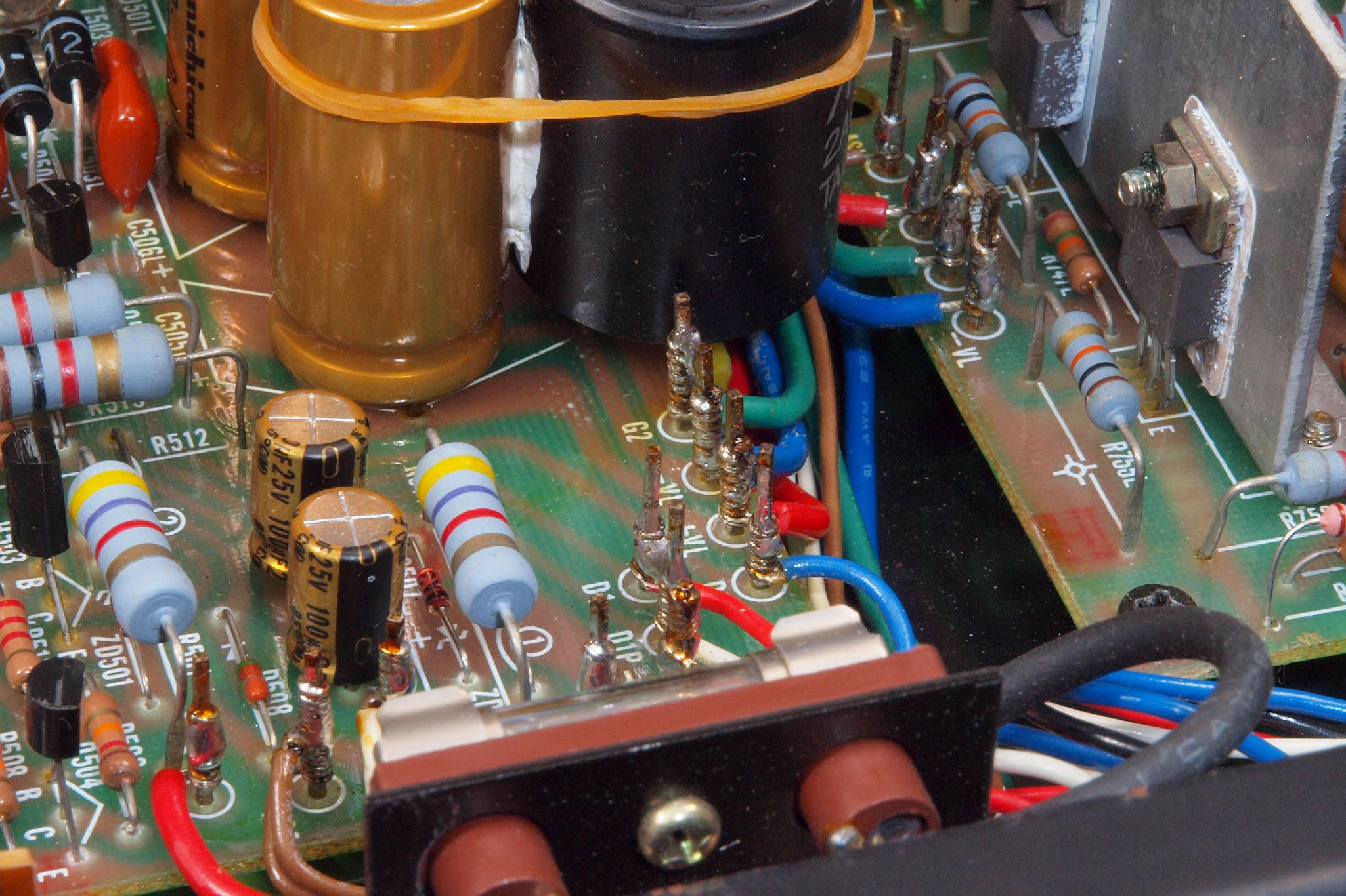 | C54. 修理後 電源基板 ヒューズ入り抵抗全部、電解コンデンサー9個、整流ダイオード10個交換。 輪ゴムは接着材が硬化するまで固定する。 |