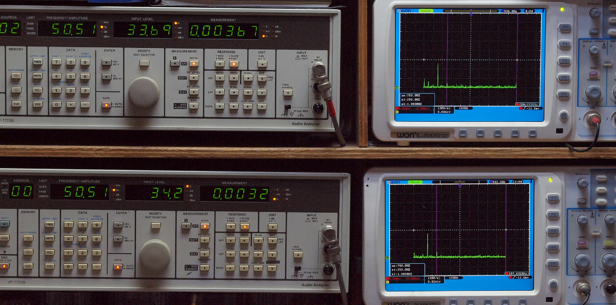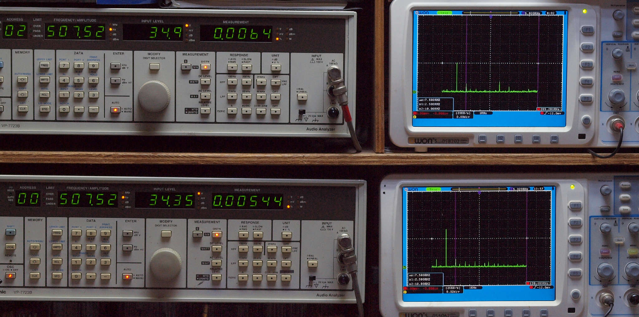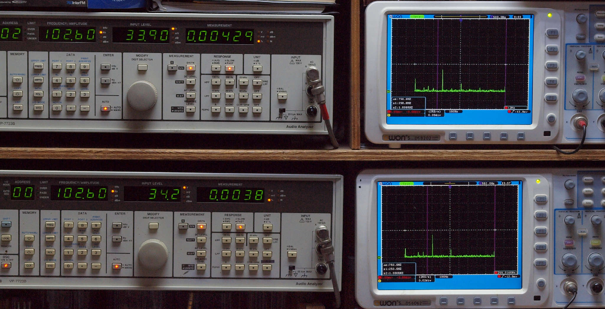 | E. 測定・調整。 画像をクリックすると、大きく(横幅2050ドット)表示されます。 E1. 出力・歪み率測定・調整 「見方」。 上段中 右側SP出力を「Audio Analyzer Panasonic VP−7723B」により測定。 表示LED、 左端=メモリーNo、 中左=周波数測定、 中右=出力電圧測定、 右端=歪み率測定。 上段右端 VP−7723Bの基本波除去出力を「owon SDS8202(200MHZ)」で「FFT分析」表示。 下段中 左側SP出力を「Audio Analyzer Panasonic VP−7723B」により測定。 表示LED、 左端=メモリーNo、 中左=周波数測定、 中右=出力電圧測定、 右端=歪み率測定。 下段右端 VP−7723Bの基本波除去出力を「owon SDS6062(200MHZ)」で「FFT分析」表示。 下段左端 オーディオ発振器 VP−7201A より50Hz〜100kHzの信号を出し(歪み率=約0.003%)、ATT+分配器を通し、AMPに入力。 よって、ダイアル設定出力レベルより低くなります。測定機器の仕様や整備の様子はこちら、「VP−7723B」「VP−7201A」。 FFT画面の見方はこちら。 |