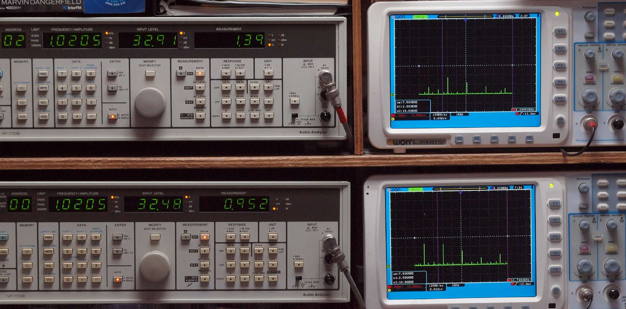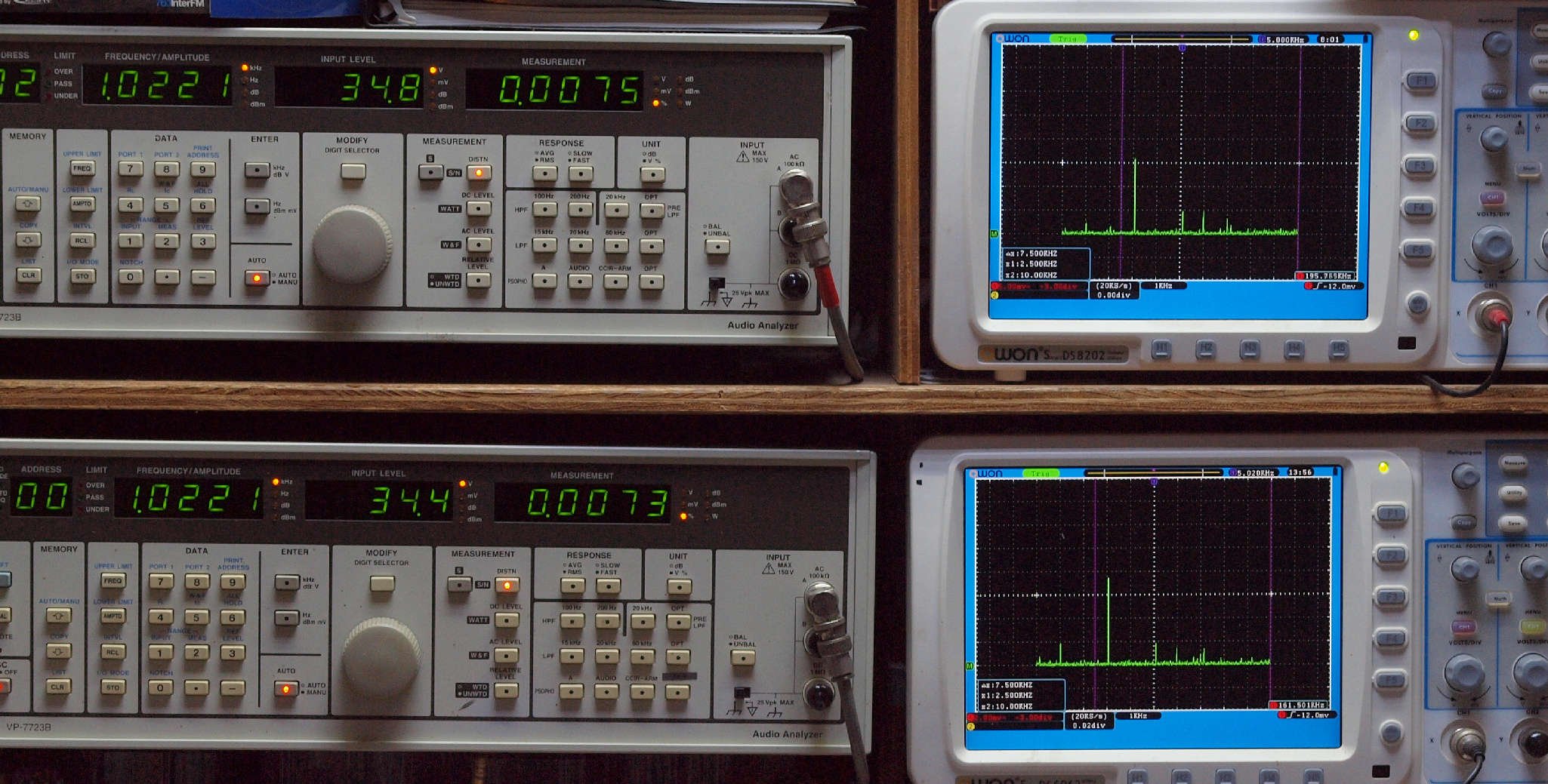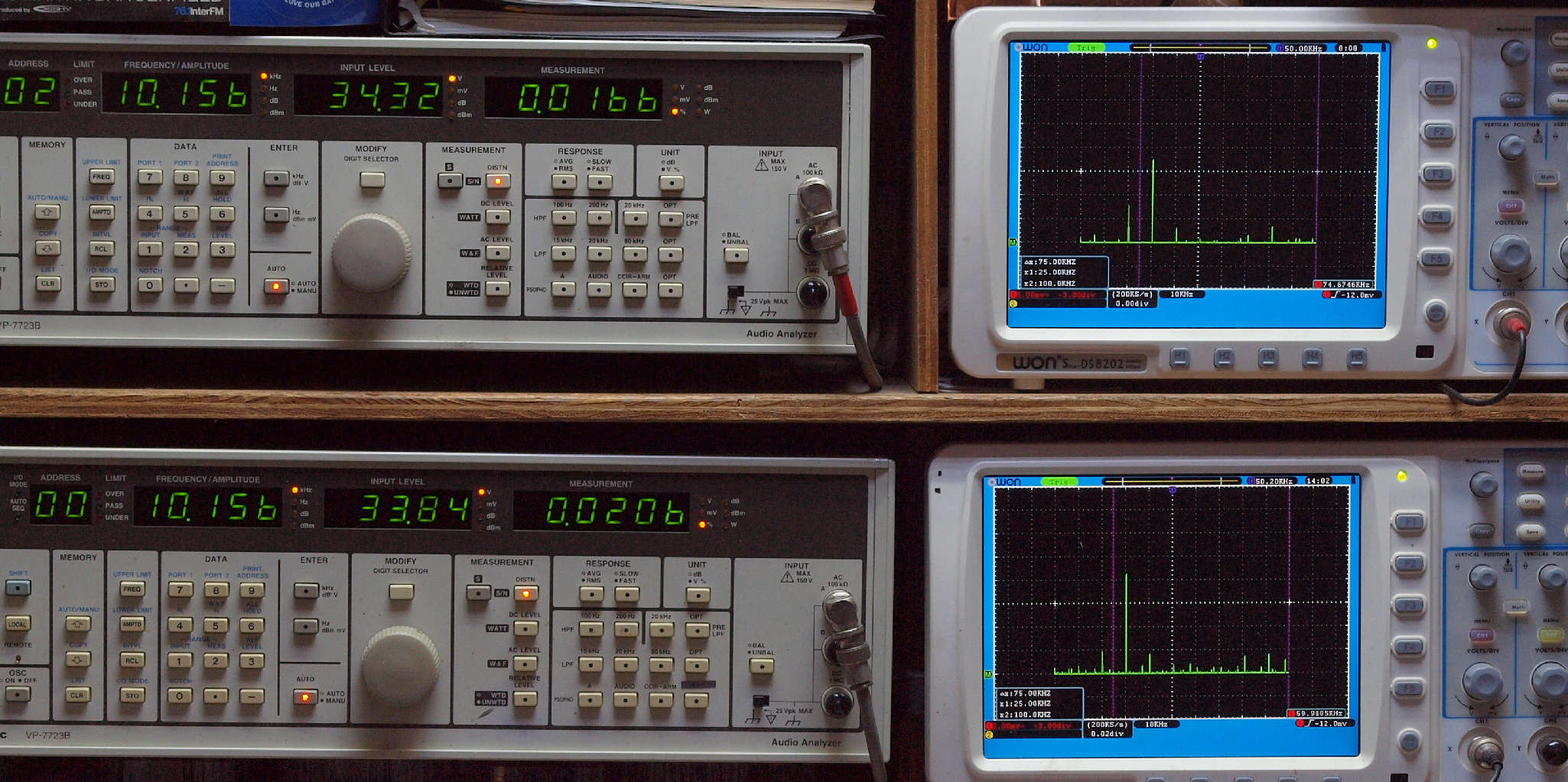| E. 測定・調整。 画像をクリックすると、大きく(横幅2050ドット)表示されます。 E1. 出力・歪み率測定・調整 「見方」。 上段中 右側SP出力を「Audio Analyzer Panasonic VP−7723B」により測定。 表示LED、 左端=メモリーNo、 中左=周波数測定、 中右=出力電圧測定、 右端=歪み率測定。 上段右端 VP−7723Bの基本波除去出力を「owon SDS8202(200MHZ)」で「FFT分析」表示。 下段中 左側SP出力を「Audio Analyzer Panasonic VP−7723B」により測定。 表示LED、 左端=メモリーNo、 中左=周波数測定、 中右=出力電圧測定、 右端=歪み率測定。 下段右端 VP−7723Bの基本波除去出力を「owon SDS6062(200MHZ)」で「FFT分析」表示。 下段左端 オーディオ発振器 VP−7201A より50Hz〜100kHzの信号を出し(歪み率=約0.003%)、ATT+分配器を通し、AMPに入力。 よって、ダイアル設定出力レベルより低くなります。測定機器の仕様や整備の様子はこちら、「VP−7723B」「VP−7201A」。 FFT画面の見方はこちら。 |