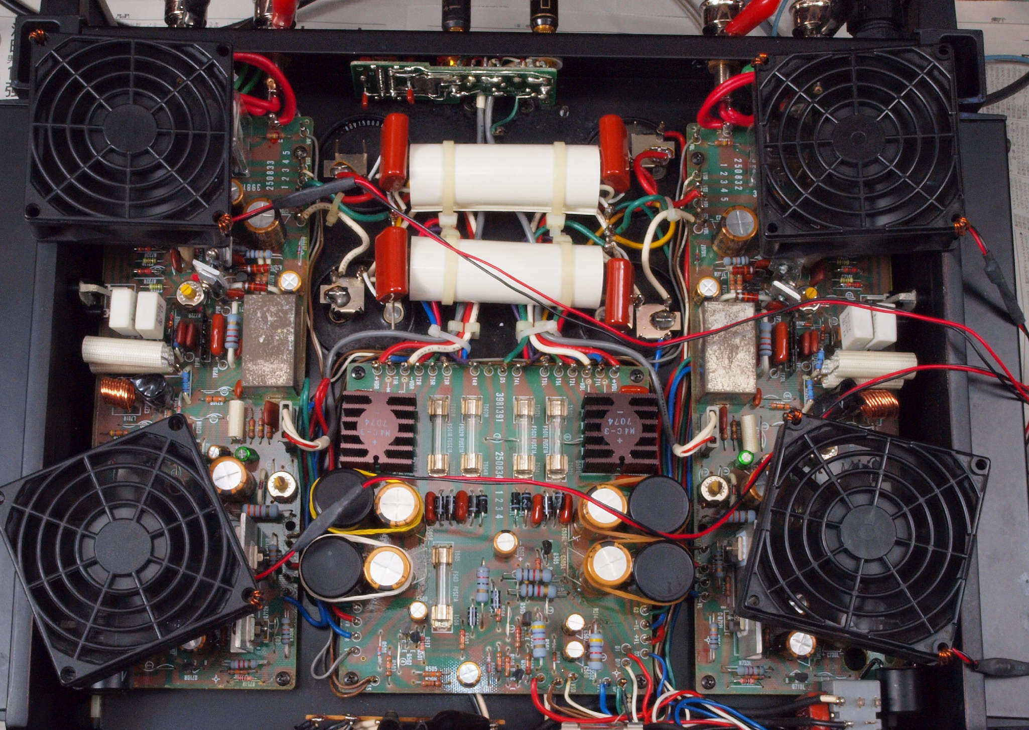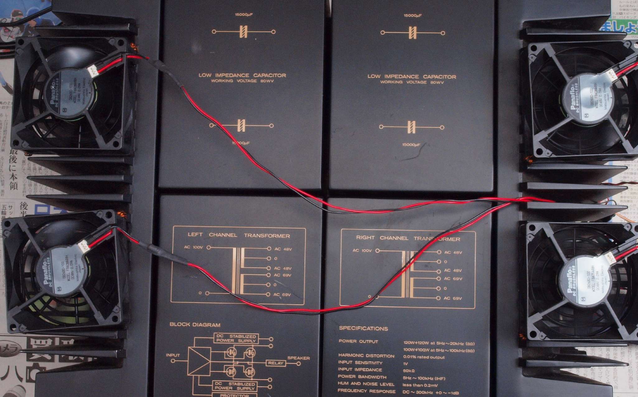 | E3. フルパワーなので、24V高速フアンが全回転でクーリング。 終段FET(電界効果トランジスター)用電源には、さらにフイルムコンデンサー追加する。 |